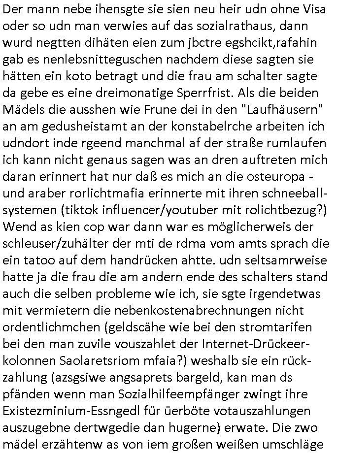 Der mann nebe ihensgte sie sien neu heir udn ohne Visa oder so udn man verwies auf das sozialrathaus, dann wurd negtten dihäten eien zum jbctre egshcikt,rafahin gab es nenlebsnitteguschen nachdem diese sagten sie hätten ein koto betragt und die frau am schalter sagte da gebe es eine dreimonatige Sperrfrist. Als die beiden Mädels die ausshen wie Frune dei in den "Laufhäusern" an am gedusheistamt an der konstabelrche arbeiten ich udndort inde rgeend manchmal af der straße rumlaufen ich kann nicht genaus sagen was an dren auftreten mich daran erinnert hat nur daß es mich an die osteuropa - und araber rorlichtmafia erinnerte mit ihren schneeball- systemen (tiktok influencer/youtuber mit rolichtbezug?) Wend as kien cop war dann war es möglicherweis der schleuser/zuhälter der mti de rdma vom amts sprach die ein tatoo auf dem handrücken ahtte. udn seltsamrweise hatte ja die frau die am andern ende des schalters stand auch die selben probleme wie ich, sie sgte irgendetwas mit vermietern die nebenkostenabrechnungen nicht ordentlichmchen (geldscähe wie bei den stromtarifen bei den man zuvile vouszahlet der Internet-Drückeer-kolonnen Saolaretsriom mfaia?) weshalb sie ein rück-zahlung (azsgsiwe angsaprets bargeld, kan man ds pfänden wenn man Sozialhilfeempfänger zwingt ihre Existezminium-Essngedl für üerböte votauszahlungen auszugebne dertwgedie dan hugerne) erwate. Die zwo mädel erzähtenw as von iem großen weißen umschläge