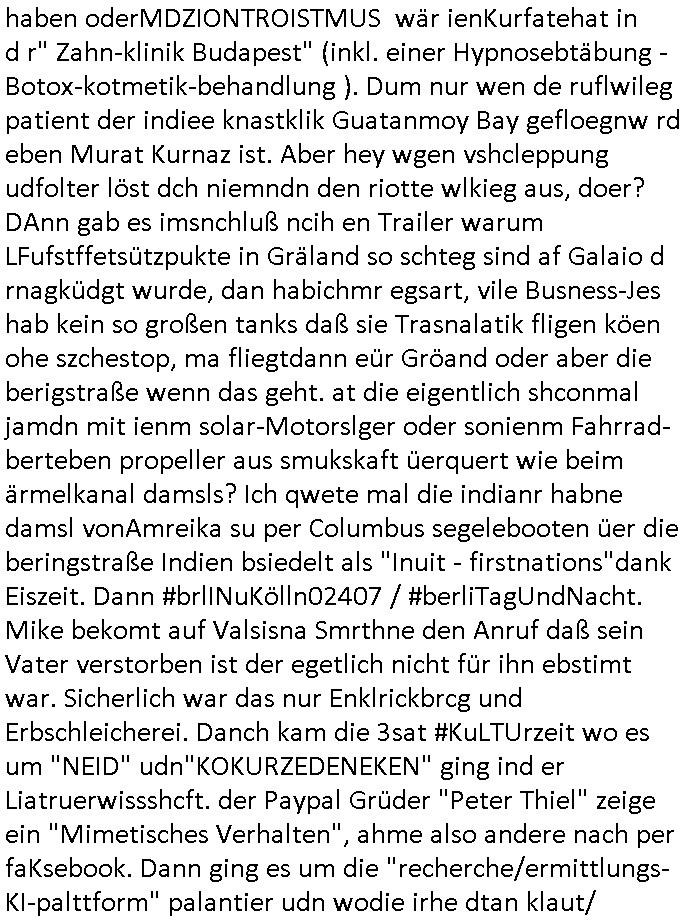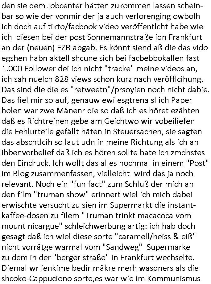 den sie dem Jobcenter hätten zukommen lassen schein-bar so wie der vonmir der ja auch verlorenging owbolh ich doch auf tikto/facbook video veröffentlcht habe wie ich diesen bei der post Sonnemannstraße idn Frankfurt an der (neuen) EZB abgab. Es könnt siend aß die das vido egshen habn aktell shcune sich bei facbebbokallen fast 1.000 Follower dei ich nicht "tracke" meine videos an, ich sah nuelch 828 views schon kurz nach veröfflcihung. Das sind die die es "retweetn"/prsoyien noch nicht dabie. Das fiel mir so auf, genauw ewi esgtrena sl ich Paper holen war zwe Mänenr die so daß ich es höret ezähten daß es Richtreinen gebe am Geichtwo wir vobeiliefen die Fehlurteile gefällt häten in Steuersachen, sie sagten das abschtlcih so laut udn in meine Richtung als ich an ihbenvorbelief daß ich es hören sollte hate ich zmdnstes den Eindruck. Ich wollt das alles nochmal in einem "Post" im Blog zusammenfassen, vielleicht wird das ja noch relevant. Noch ein "fun fact" zum Schluß der mich an den film "truman show" erinnert wiel ich mich dabei erwischte versucht zu sien im Supermarkt die instant-kaffee-dosen zu filem "Truman trinkt macacoca vom mount nicargue" schleichwerbung artig: ich hab doch gesagt daß ich wiel diese sorte "caramell/heiss & eiß" nicht vorrätge warmal vom "Sandweg" Supermarke zu dem in der "berger straße" in Frankfurt wechselte. Diemal wr ienkime bedir mäkre merh wasdners als die shcoko-Cappuciono sorte,es war wie im Kommunismus