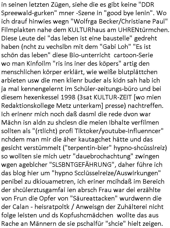 in seinen letzten Zügen, siehe die es gibt keine "DDR Spreewald-gurken" mner -Szene in "good bye lenin". Wo ich drauf hinwies wegn "Wolfrga Becker/Christiane Paul" Filmplakten nahe dem KULTURhaus am UHRENtürmchen. Diese Leute dei "das leben ist eine baustelle" gedreht haben (ncht zu vechslbn mit dem "Gabi Loh" "Es ist schön das leben" diese Bio-unterricht cartoon-Serie wo man Kinfoilm "ris ins iner des köpers" artig den menschlichen körper erklärt, wie weiße blutplättchen arbieten usw die men klienr buder als kidn sah hab ich ja mal kennengelernt im Schüler-zeitungs-büro und bei diesem hexenkessel 1998 (3sat KULTUR-ZEIT [wo mien Redaktionskollege Metz unterkam] presse) nachtreffen. Ich erinenr mich noch daß dasml die rede dvon war Mächn isn aldn zu shclesn die meien Ibhalte verfilmen sollten als "(rtlicht) profi Tiktoker/youtube-Influenncer" nchdem man mir die äher kautagchet hätte und das gesicht verstümmelt ("terpentin-bier" hypno-shcüsslreiz) so wollten sie mich uetr "dauebrochachtung" zwingen wgen ageblcher "SLSBNTGEFÄHRUNG", daher führe ich das blog hier um "hypno Scclüsselreize/Auswirkungen" penibel zu dkiouametren, ich eriner mcihdaß im Bereich der shcülerztusgamfai ien abrsch Frau war dei erzählte von Frun die Opfer von "Säureattacken" wurdwenn die der Calan - heisratpoltk / Anweisgn der Zuhälterei nicht folge leisten und ds Kopfushcmädchen wollte das aus Rache an Männern de sie pschalfür "shcie" hielt zeigen.