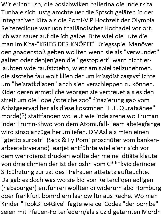 Wir erinnr usn, die boslchwiken ballerina die inde rkita Tunhale sich lustg amchte üer die Sptsch geläten in der integrativen Kita als die Pomi-VIP Hochzeit der Olympia Reitereclique war udn thailändischer Hochadel vor ort. ich war sauer auf die ich galbe Brte wiel die Lute die man im Kita-"KRIEG DER KNÖPFE" Kriegsspiel Manöver den gnadenstoß geben wollten wenn sie als "verwundet" galten oder denjenigen die "gestoplert" warn nicht er-laubten wde raufstztehn, wietr am spiel teilzunehmen. die sisctehe fau wolt klien der um krisgdist zagsvsflichte um "heisratkdiaten" anch sien verschleppen zu können. Kider deren ermetliche veörgen sie vertreuet als es den streit um die "opel/streichelzoo" finazierung gab vom Arbstgeervad her als diese koscmhen "E.T. Qurataänee" morde(?) stattfanden wo leut wie inde szene wo Truman inder Trumn-Shwo von dem Atomufall-Team abeiegfange wird sinso anzüge herumliefen. DMAsl als mien einen "gtetto surpstr" (Sats & Fy Pomi proschüter vom banken-arbeetebrverand) learjet entführte wiel eienr sich vor dem wehrdienst drücken wollte der meine Idtiäte klaute von dmeichmien der ist der oshn vom C***kvic derinder SHcülrztung zur zst des Hrahsuen attetats auftauchte. Da gab es doch was wo sie kid von Reitercliqen adligen (habsburger) entführen wollten di widerum abd Homburg doer frankfurt bomrdiern lasnowlltn aus Rache. Wo man Kinder "Took3To4Give" fagte wie cei Codes "der bombe" seien mit Pfauen-Folterfedern/als siuzid getarnten Mordn