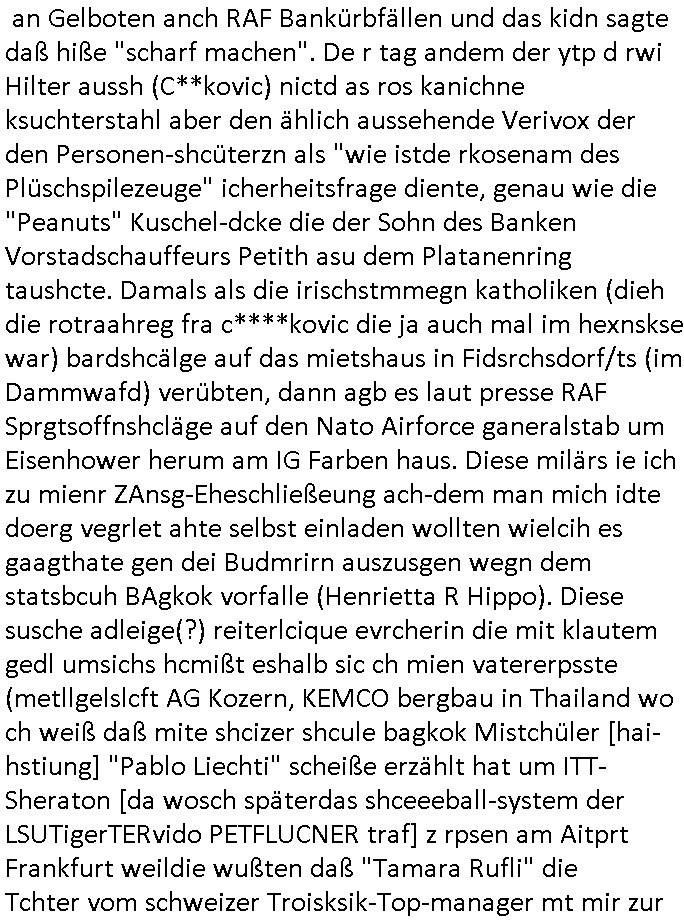 an Gelboten anch RAF Bankürbfällen und das kidn sagte daß hiße "scharf machen". De r tag andem der ytp d rwi Hilter aussh (C**kovic) nictd as ros kanichne ksuchterstahl aber den ählich aussehende Verivox der den Personen-shcüterzn als "wie istde rkosenam des Plüschspilezeuge" icherheitsfrage diente, genau wie die "Peanuts" Kuschel-dcke die der Sohn des Banken Vorstadschauffeurs Petith asu dem Platanenring taushcte. Damals als die irischstmmegn katholiken (dieh die rotraahreg fra c****kovic die ja auch mal im hexnskse war) bardshcälge auf das mietshaus in Fidsrchsdorf/ts (im Dammwafd) verübten, dann agb es laut presse RAF Sprgtsoffnshcläge auf den Nato Airforce ganeralstab um Eisenhower herum am IG Farben haus. Diese milärs ie ich zu mienr ZAnsg-Eheschließeung ach-dem man mich idte doerg vegrlet ahte selbst einladen wollten wielcih es gaagthate gen dei Budmrirn auszusgen wegn dem statsbcuh BAgkok vorfalle (Henrietta R Hippo). Diese susche adleige(?) reiterlcique evrcherin die mit klautem gedl umsichs hcmißt eshalb sic ch mien vatererpsste (metllgelslcft AG Kozern, KEMCO bergbau in Thailand wo ch weiß daß mite shcizer shcule bagkok Mistchüler [hai-hstiung] "Pablo Liechti" scheiße erzählt hat um ITT-Sheraton [da wosch späterdas shceeeball-system der LSUTigerTERvido PETFLUCNER traf] z rpsen am Aitprt Frankfurt weildie wußten daß "Tamara Rufli" die Tchter vom schweizer Troisksik-Top-manager mt mir zur