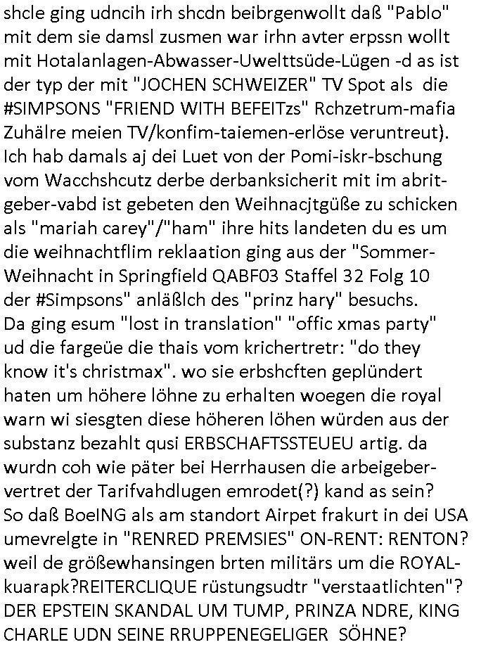 shcle ging udncih irh shcdn beibrgenwollt daß "Pablo" mit dem sie damsl zusmen war irhn avter erpssn wollt mit Hotalanlagen-Abwasser-Uwelttsüde-Lügen -d as ist der typ der mit "JOCHEN SCHWEIZER" TV Spot als die #SIMPSONS "FRIEND WITH BEFEITzs" Rchzetrum-mafia Zuhälre meien TV/konfim-taiemen-erlöse veruntreut). Ich hab damals aj dei Luet von der Pomi-iskr-bschung vom Wacchshcutz derbe derbanksicherit mit im abrit-geber-vabd ist gebeten den Weihnacjtgüße zu schicken als "mariah carey"/"ham" ihre hits landeten du es um die weihnachtflim reklaation ging aus der "Sommer-Weihnacht in Springfield QABF03 Staffel 32 Folg 10 der #Simpsons" anläßlch des "prinz hary" besuchs. Da ging esum "lost in translation" "offic xmas party" ud die fargeüe die thais vom krichertretr: "do they know it's christmax". wo sie erbshcften geplündert haten um höhere löhne zu erhalten woegen die royal warn wi siesgten diese höheren löhen würden aus der substanz bezahlt qusi ERBSCHAFTSSTEUEU artig. da wurdn coh wie päter bei Herrhausen die arbeigeber-vertret der Tarifvahdlugen emrodet(?) kand as sein? So daß BoeING als am standort Airpet frakurt in dei USA umevrelgte in "RENRED PREMSIES" ON-RENT: RENTON? weil de größewhansingen brten militärs um die ROYAL-kuarapk?REITERCLIQUE rüstungsudtr "verstaatlichten"? DER EPSTEIN SKANDAL UM TUMP, PRINZA NDRE, KING CHARLE UDN SEINE RRUPPENEGELIGER SÖHNE?