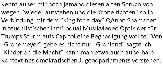 Kennt außer mir noch jemand diesen alten Spruch von wegen "wieder aufstehen und die Krone richten" so in Verbindung mit dem "king for a day" QAnon Shamanen in feudalistischer Jamiroquai Musikviedeo Optik der für Trumps Sturm aufs Capitol eine Begnadigung wollte? Von "Grönemeyer" gebe es nicht nur "Grönland" sagte ich. "Kinder an die Macht" kann man etwa auch außerhalb Kontext nes dmokratischen Jugendparlaments verstehen.