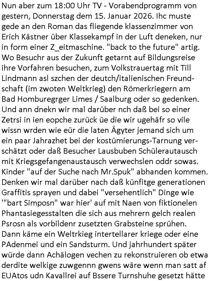 Nun aber zum 18:00 Uhr TV - Vorabendprogramm von gestern, Donnerstag dem 15. Januar 2026. Ihc muste gede an den Roman das fliegende klassenzimmer von Erich Kästner über Klassekampf in der Luft deneken, nur in form einer Z_eitmaschine. "back to the future" artig. Wo Besuchr aus der Zukunft getarnt auf Bildungsreise ihre Vorfahren besuchen, zum Volkstrauertag mit Till Lindmann asl szchen der deutch/italienischen Freund-schaft (im zwoten Weltkrieg) den Römerkriegern am Bad Homburegrger Limes / Saalburg oder so gedenken. Und ann dnekn wir mal darüber nch daß bei so einer Zetrsi in ien eopche zurück üe die wir ugehäfr so vile wissn wrden wie eür die laten Ägyter jemand sich um ein paar Jahrazhet bei der kostümierungs-Tarnung ver-schätzt oder daß Besucher Lausbuben Schülerautausch mit Kriegsgefangenaustausch verwechslen oddr sowas. Kinder "auf der Suche nach Mr.Spuk" abhanden kommen. Denken wir mal darüber nach daß künfitge generationen Graffitis sprayen und dabei "versehentlich" Dinge wie '"bart Simposn" war hier' auf mit Naen von fiktionelen Phantasiegesstalten die sich aus mehrern gelch realen Psrosn als vorbildenr zusetzten Grabsteine sprühen. Dann käme ein Weltrkieg intertellarer kriege oder eine PAdenmei und ein Sandsturm. Und jahrhundert später würde dann Achälogen vechen zu rekonstruieren ob etwa derdite welkige zuwgennn gwens wäre wenn man satt af EUAtos udn Kavallrei auf Bssere Turnshuhe gesetzt hätte