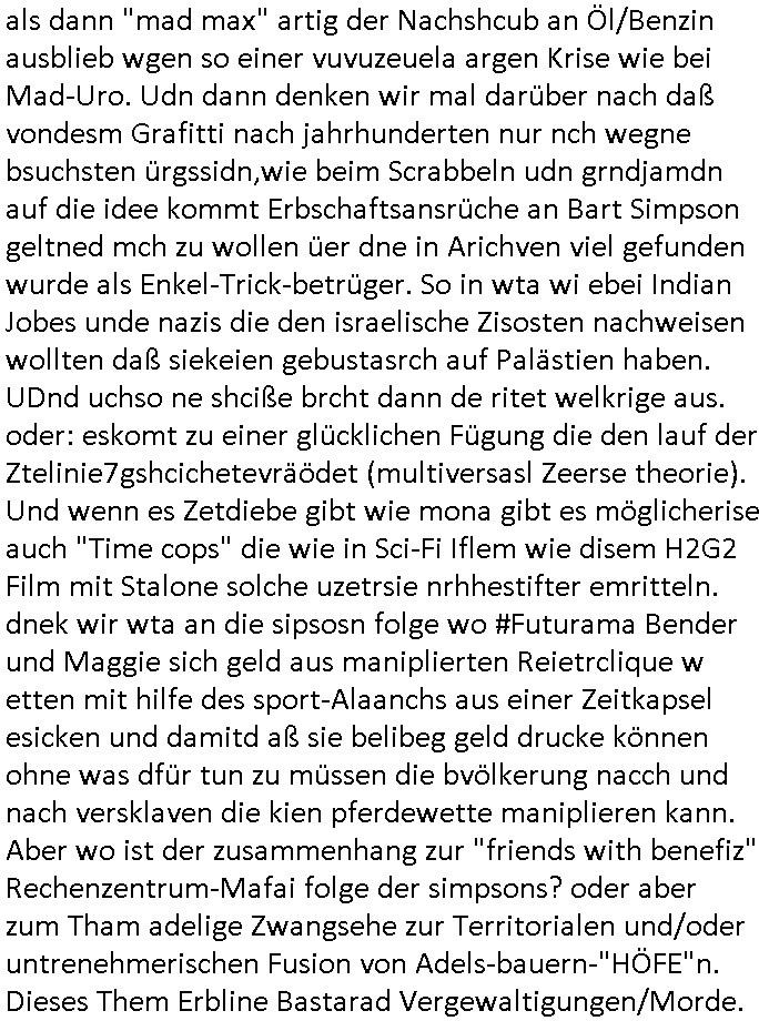 als dann "mad max" artig der Nachshcub an Öl/Benzin ausblieb wgen so einer vuvuzeuela argen Krise wie bei Mad-Uro. Udn dann denken wir mal darüber nach daß vondesm Grafitti nach jahrhunderten nur nch wegne bsuchsten ürgssidn,wie beim Scrabbeln udn grndjamdn auf die idee kommt Erbschaftsansrüche an Bart Simpson geltned mch zu wollen üer dne in Arichven viel gefunden wurde als Enkel-Trick-betrüger. So in wta wi ebei Indian Jobes unde nazis die den israelische Zisosten nachweisen wollten daß siekeien gebustasrch auf Palästien haben. UDnd uchso ne shciße brcht dann de ritet welkrige aus. oder: eskomt zu einer glücklichen Fügung die den lauf der Ztelinie7gshcichetevräödet (multiversasl Zeerse theorie). Und wenn es Zetdiebe gibt wie mona gibt es möglicherise auch "Time cops" die wie in Sci-Fi Iflem wie disem H2G2 Film mit Stalone solche uzetrsie nrhhestifter emritteln. dnek wir wta an die sipsosn folge wo #Futurama Bender und Maggie sich geld aus maniplierten Reietrclique w etten mit hilfe des sport-Alaanchs aus einer Zeitkapsel esicken und damitd aß sie belibeg geld drucke können ohne was dfür tun zu müssen die bvölkerung nacch und nach versklaven die kien pferdewette maniplieren kann. Aber wo ist der zusammenhang zur "friends with benefiz" Rechenzentrum-Mafai folge der simpsons? oder aber zum Tham adelige Zwangsehe zur Territorialen und/oder untrenehmerischen Fusion von Adels-bauern-"HÖFE"n. Dieses Them Erbline Bastarad Vergewaltigungen/Morde.