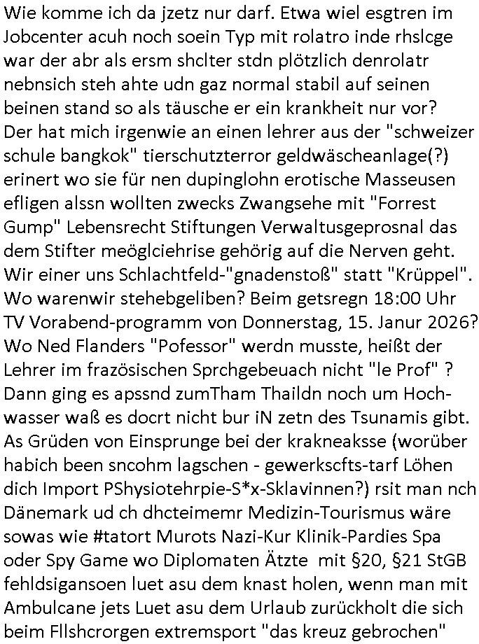Wie komme ich da jzetz nur darf. Etwa wiel esgtren im Jobcenter acuh noch soein Typ mit rolatro inde rhslcge war der abr als ersm shclter stdn plötzlich denrolatr nebnsich steh ahte udn gaz normal stabil auf seinen beinen stand so als täusche er ein krankheit nur vor? Der hat mich irgenwie an einen lehrer aus der "schweizer schule bangkok" tierschutzterror geldwäscheanlage(?) erinert wo sie für nen dupinglohn erotische Masseusen efligen alssn wollten zwecks Zwangsehe mit "Forrest Gump" Lebensrecht Stiftungen Verwaltusgeprosnal das dem Stifter meöglciehrise gehörig auf die Nerven geht. Wir einer uns Schlachtfeld-"gnadenstoß" statt "Krüppel". Wo warenwir stehebgeliben? Beim getsregn 18:00 Uhr TV Vorabend-programm von Donnerstag, 15. Janur 2026? Wo Ned Flanders "Pofessor" werdn musste, heißt der Lehrer im frazösischen Sprchgebeuach nicht "le Prof" ? Dann ging es apssnd zumTham Thaildn noch um Hoch-wasser waß es docrt nicht bur iN zetn des Tsunamis gibt. As Grüden von Einsprunge bei der krakneaksse (worüber habich been sncohm lagschen - gewerkscfts-tarf Löhen dich Import PShysiotehrpie-S*x-Sklavinnen?) rsit man nch Dänemark ud ch dhcteimemr Medizin-Tourismus wäre sowas wie #tatort Murots Nazi-Kur Klinik-Pardies Spa oder Spy Game wo Diplomaten Ätzte mit §20, §21 StGB fehldsigansoen luet asu dem knast holen, wenn man mit Ambulcane jets Luet asu dem Urlaub zurückholt die sich beim Fllshcrorgen extremsport "das kreuz gebrochen"