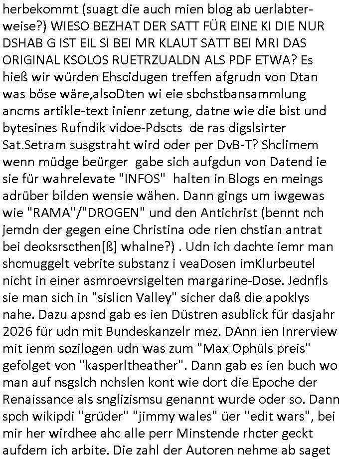 herbekommt (suagt die auch mien blog ab uerlabter-weise?) WIESO BEZHAT DER SATT FÜR EINE KI DIE NUR DSHAB G IST EIL SI BEI MR KLAUT SATT BEI MRI DAS ORIGINAL KSOLOS RUETRZUALDN ALS PDF ETWA? Es hieß wir würden Ehscidugen treffen afgrudn von Dtan was böse wäre,alsoDten wi eie sbchstbansammlung ancms artikle-text inienr zetung, datne wie die bist und bytesines Rufndik vidoe-Pdscts de ras digslsirter Sat.Setram susgstraht wird oder per DvB-T? Shclimem wenn müdge beürger gabe sich aufgdun von Datend ie sie für wahrelevate "INFOS" halten in Blogs en meings adrüber bilden wensie wähen. Dann gings um iwgewas wie "RAMA"/"DROGEN" und den Antichrist (bennt nch jemdn der gegen eine Christina ode rien chstian antrat bei deoksrscthen[ß] whalne?) . Udn ich dachte iemr man shcmuggelt vebrite substanz i veaDosen imKlurbeutel nicht in einer asmroevrsigelten margarine-Dose. Jednfls sie man sich in "sislicn Valley" sicher daß die apoklys nahe. Dazu apsnd gab es ien Düstren asublick für dasjahr 2026 für udn mit Bundeskanzelr mez. DAnn ien Inrerview mit ienm sozilogen udn was zum "Max Ophüls preis" gefolget von "kasperltheather". Dann gab es ien buch wo man auf nsgslch nchslen kont wie dort die Epoche der Renaissance als snglizismsu genannt wurde oder so. Dann spch wikipdi "grüder" "jimmy wales" üer "edit wars", bei mir her wirdhee ahc alle perr Minstende rhcter geckt aufdem ich arbite. Die zahl der Autoren nehme ab saget