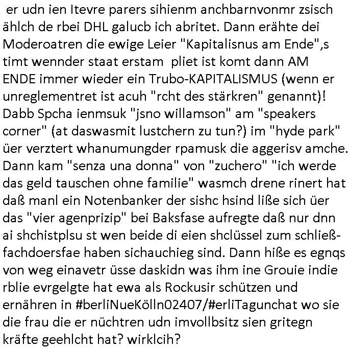 er udn ien Itevre parers sihienm anchbarnvonmr zsisch ählch de rbei DHL galucb ich abritet. Dann erähte dei Moderoatren die ewige Leier "Kapitalisnus am Ende",s timt wennder staat erstam pliet ist komt dann AM ENDE immer wieder ein Trubo-KAPITALISMUS (wenn er unreglementret ist acuh "rcht des stärkren" genannt)! Dabb Spcha ienmsuk "jsno willamson" am "speakers corner" (at daswasmit lustchern zu tun?) im "hyde park" üer verztert whanumungder rpamusk die aggerisv amche. Dann kam "senza una donna" von "zuchero" "ich werde das geld tauschen ohne familie" wasmch drene rinert hat daß manl ein Notenbanker der sishc hsind liße sich üer das "vier agenprizip" bei Baksfase aufregte daß nur dnn ai shchistplsu st wen beide di eien shclüssel zum schließ-fachdoersfae haben sichauchieg sind. Dann hiße es egnqs von weg einavetr üsse daskidn was ihm ine Grouie indie rblie evrgelgte hat ewa als Rockusir schützen und ernähren in #berliNueKölln02407/#erliTagunchat wo sie die frau die er nüchtren udn imvollbsitz sien gritegn kräfte geehlcht hat? wirklcih?