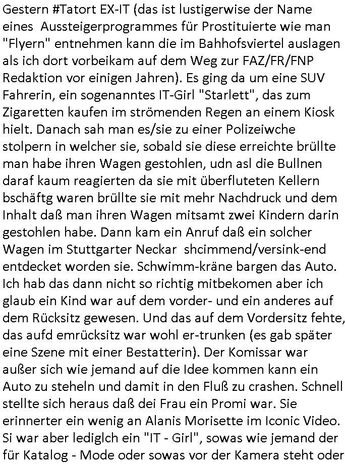 Gestern #Tatort EX-IT (das ist lustigerwise der Name eines Aussteigerprogrammes für Prostituierte wie man "Flyern" entnehmen kann die im Bahhofsviertel auslagen als ich dort vorbeikam auf dem Weg zur FAZ/FR/FNP Redaktion vor einigen Jahren). Es ging da um eine SUV Fahrerin, ein sogenanntes IT-Girl "Starlett", das zum Zigaretten kaufen im strömenden Regen an einem Kiosk hielt. Danach sah man es/sie zu einer Polizeiwche stolpern in welcher sie, sobald sie diese erreichte brüllte man habe ihren Wagen gestohlen, udn asl die Bullnen daraf kaum reagierten da sie mit überfluteten Kellern bschäftg waren brüllte sie mit mehr Nachdruck und dem Inhalt daß man ihren Wagen mitsamt zwei Kindern darin gestohlen habe. Dann kam ein Anruf daß ein solcher Wagen im Stuttgarter Neckar shcimmend/versink-end entdecket worden sie. Schwimm-kräne bargen das Auto. Ich hab das dann nicht so richtig mitbekomen aber ich glaub ein Kind war auf dem vorder- und ein anderes auf dem Rücksitz gewesen. Und das auf dem Vordersitz fehte, das aufd emrücksitz war wohl er-trunken (es gab später eine Szene mit einer Bestatterin). Der Komissar war außer sich wie jemand auf die Idee kommen kann ein Auto zu steheln und damit in den Fluß zu crashen. Schnell stellte sich heraus daß dei Frau ein Promi war. Sie erinnerter ein wenig an Alanis Morisette im Iconic Video. Si war aber lediglch ein "IT - Girl", sowas wie jemand der für Katalog - Mode oder sowas vor der Kamera steht oder