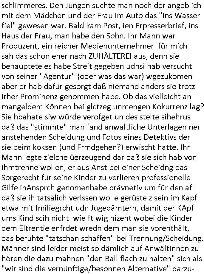 schlimmeres. Den Jungen suchte man noch der angeblich mit dem Mädchen und der Frau im Auto das "ins Wasser fiel" gewesen war. Bald kam Post, ien Erpresserbrief, ins Haus der Frau, man habe den Sohn. Ihr Mann war Produzent, ein reicher Medienunternehmer für mich sah das schon eher nach ZUHÄLTEREI aus, denn sie behauptete es habe Streit gegeben udnsi hab versucht von seiner "Agentur" (oder was das war) wgezukomen aber er hab dafür gesorgt daß niemand anders sie trotz irher Prominenz genommen habe. Ob das vielleicht an mangeldem Können bei glctzeg unmengen Kokurrenz lag? Sie hbahate siw würde verofget un des stelte sihehrus daß das "stimmte" man fand anwaltliche Unterlagen ner anstehenden Scheidung und Fotos eines Detektivs der sie beim koksen (und Frmdgehen?) erwischt hatte. Ihr Mann legte zielche üerzeugend dar daß sie sich hab von ihmtrenne wollen, er aus Anst bei einer Scheidng das Sorgerecht für seine Kinder zu verlieren professionelle Gilfe inAnsprch genomenhabe prävnetiv um für den afll daß sie ih tatsälich verlssen wolle gerüste z sein im Kapf etwa mit fmiliegrcht udn Jugedämtern, damit der KApf ums Kind scih nicht wie ft wig hizeht wobei die Kinder dem Eltrentie enfrdet wredn dem man sie vorenthält, das berühte "tatschan schaffen" bei Trennung/Scheidung. Männer sind leider meist so dämlich auf Anwältinnen zu hören die dazu mahnen "den Ball flach zu halten" sich als "wir sind die vernünftige/besonnen Alternative" darzu-