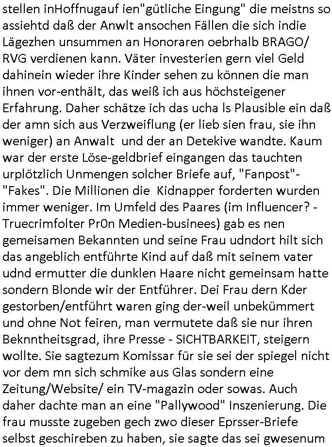 stellen inHoffnugauf ien"gütliche Eingung" die meistns so assiehtd daß der Anwlt ansochen Fällen die sich indie Lägezhen unsummen an Honoraren oebrhalb BRAGO/ RVG verdienen kann. Väter investerien gern viel Geld dahinein wieder ihre Kinder sehen zu können die man ihnen vor-enthält, das weiß ich aus höchsteigener Erfahrung. Daher schätze ich das ucha ls Plausible ein daß der amn sich aus Verzweiflung (er lieb sien frau, sie ihn weniger) an Anwalt und der an Detekive wandte. Kaum war der erste Löse-geldbrief eingangen das tauchten urplötzlich Unmengen solcher Briefe auf, "Fanpost"- "Fakes". Die Millionen die Kidnapper forderten wurden immer weniger. Im Umfeld des Paares (im Influencer? - Truecrimfolter Pr0n Medien-businees) gab es nen gemeisamen Bekannten und seine Frau udndort hilt sich das angeblich entführte Kind auf daß mit seinem vater udnd ermutter die dunklen Haare nicht gemeinsam hatte sondern Blonde wir der Entführer. Dei Frau dern Kder gestorben/entführt waren ging der-weil unbekümmert und ohne Not feiren, man vermutete daß sie nur ihren Beknntheitsgrad, ihre Presse - SICHTBARKEIT, steigern wollte. Sie sagtezum Komissar für sie sei der spiegel nicht vor dem mn sich schmike aus Glas sondern eine Zeitung/Website/ ein TV-magazin oder sowas. Auch daher dachte man an eine "Pallywood" Inszenierung. Die frau musste zugeben gech zwo dieser Eprsser-Briefe selbst geschireben zu haben, sie sagte das sei gwesenum