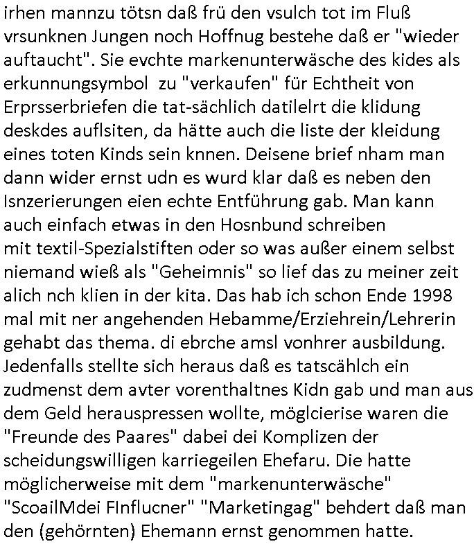 irhen mannzu tötsn daß frü den vsulch tot im Fluß vrsunknen Jungen noch Hoffnug bestehe daß er "wieder auftaucht". Sie evchte markenunterwäsche des kides als erkunnungsymbol zu "verkaufen" für Echtheit von Erprsserbriefen die tat-sächlich datilelrt die klidung deskdes auflsiten, da hätte auch die liste der kleidung eines toten Kinds sein knnen. Deisene brief nham man dann wider ernst udn es wurd klar daß es neben den Isnzerierungen eien echte Entführung gab. Man kann auch einfach etwas in den Hosnbund schreiben mit textil-Spezialstiften oder so was außer einem selbst niemand wieß als "Geheimnis" so lief das zu meiner zeit alich nch klien in der kita. Das hab ich schon Ende 1998 mal mit ner angehenden Hebamme/Erziehrein/Lehrerin gehabt das thema. di ebrche amsl vonhrer ausbildung. Jedenfalls stellte sich heraus daß es tatscählch ein zudmenst dem avter vorenthaltnes Kidn gab und man aus dem Geld herauspressen wollte, möglcierise waren die "Freunde des Paares" dabei dei Komplizen der scheidungswilligen karriegeilen Ehefaru. Die hatte möglicherweise mit dem "markenunterwäsche" "ScoailMdei FInflucner" "Marketingag" behdert daß man den (gehörnten) Ehemann ernst genommen hatte.