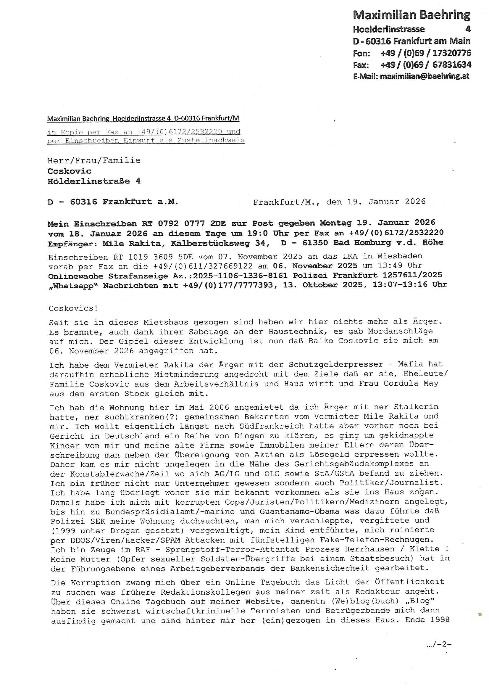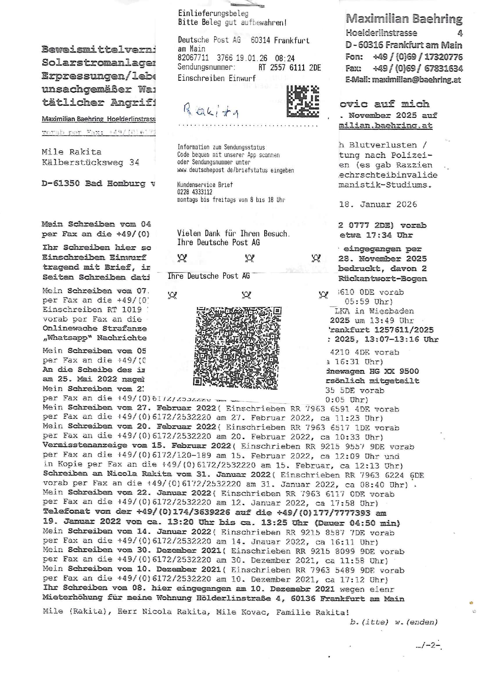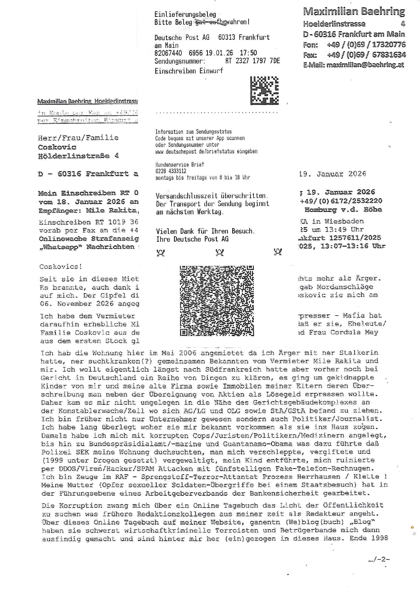 Mein Einschreiben RT 0792 0777 2DE zur Post gegeben Montag 19. Januar 2026 vom 18. Januar 2026 an diesem Tage um 19:0 Uhr per Fax an +49/(0)6172/2532220 Empfänger: Mile Rakita, Kälberstücksweg 34, D - 61350 Bad Homburg v.d. Höhe