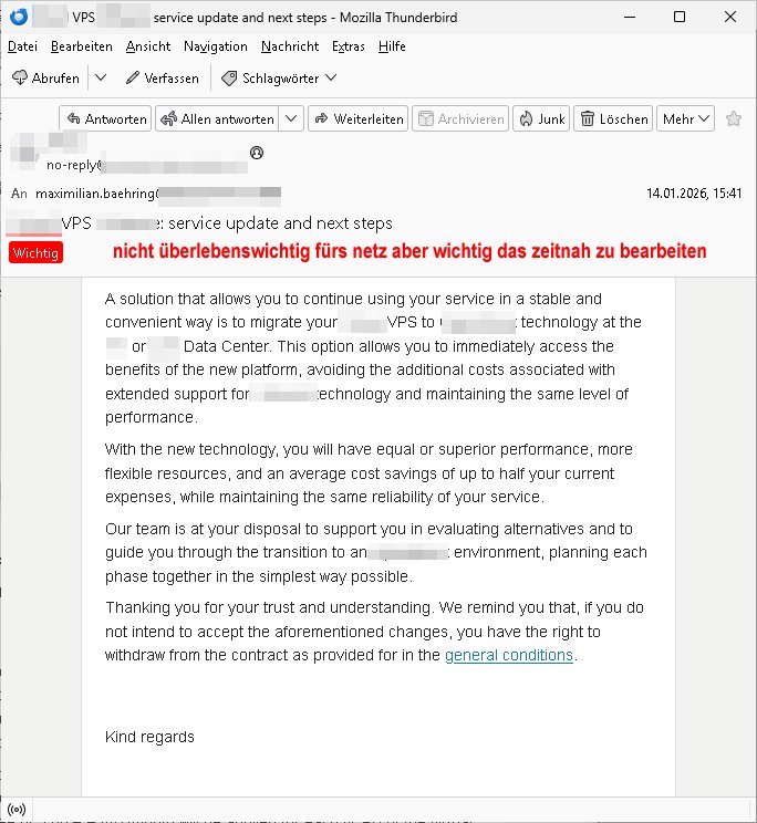 Until the complete discontinuation of the *** VPS *** service, to guarantee operational continuity, starting from 18/02/2026 an extended support fee of 5,00 € + VAT/month will be applied for each vCPU of the virtual machines still active.