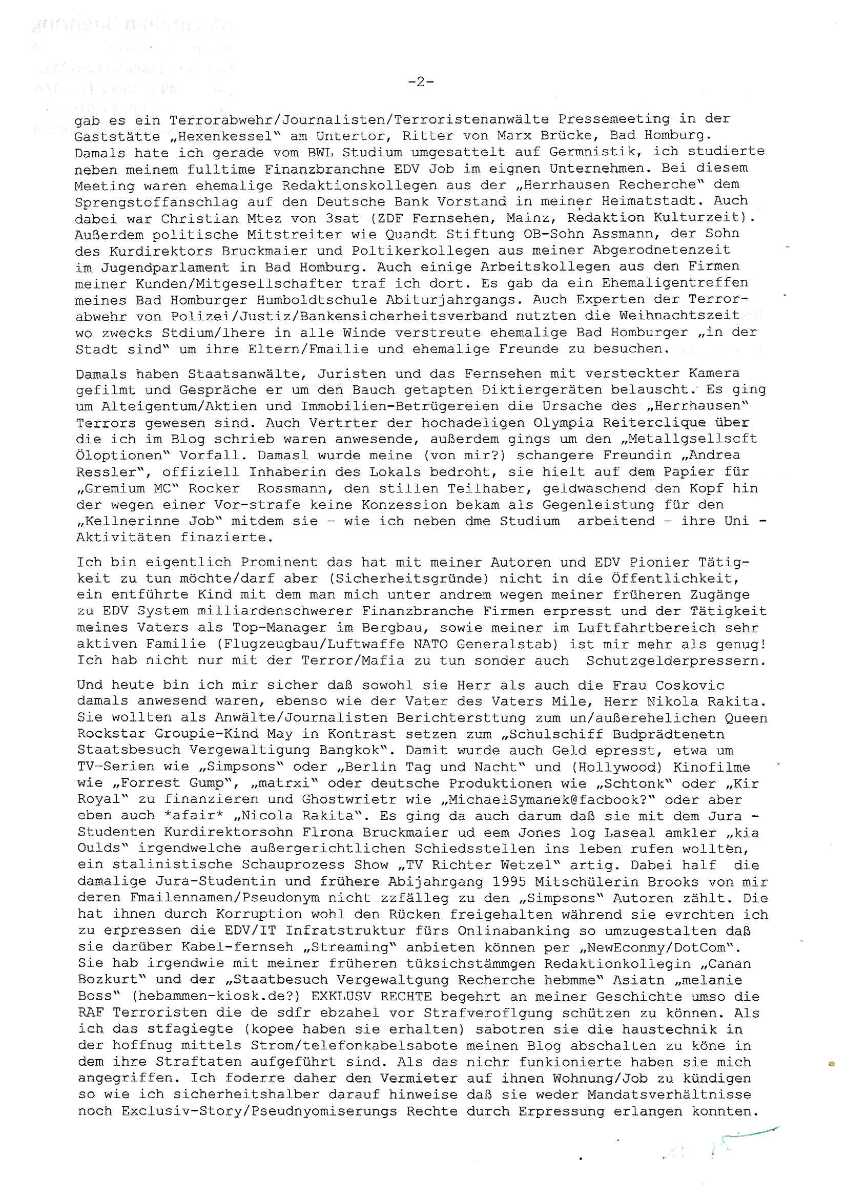 der hoffnug mittels Strom/telefonkabelsabote meinen Blog abschalten zu köne in dem ihre Straftaten aufgeführt sind. Als das nichr funkionierte haben sie mich angegriffen. Ich foderre daher den Vermieter auf ihnen Wohnung/Job zu kündigen so wie ich sicherheitshalber darauf hinweise daß sie weder Mandatsverhältnisse noch Exclusiv-Story/Pseudnyomiserungs Rechte durch Erpressung erlangen konnten.