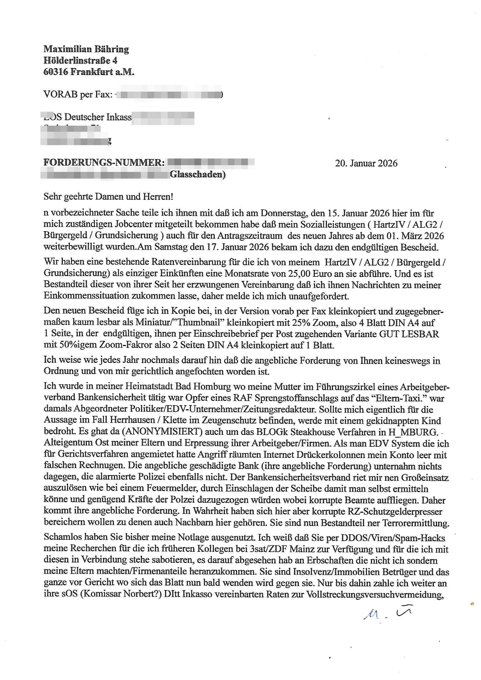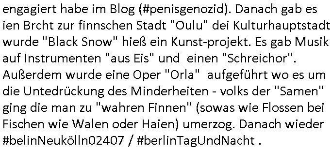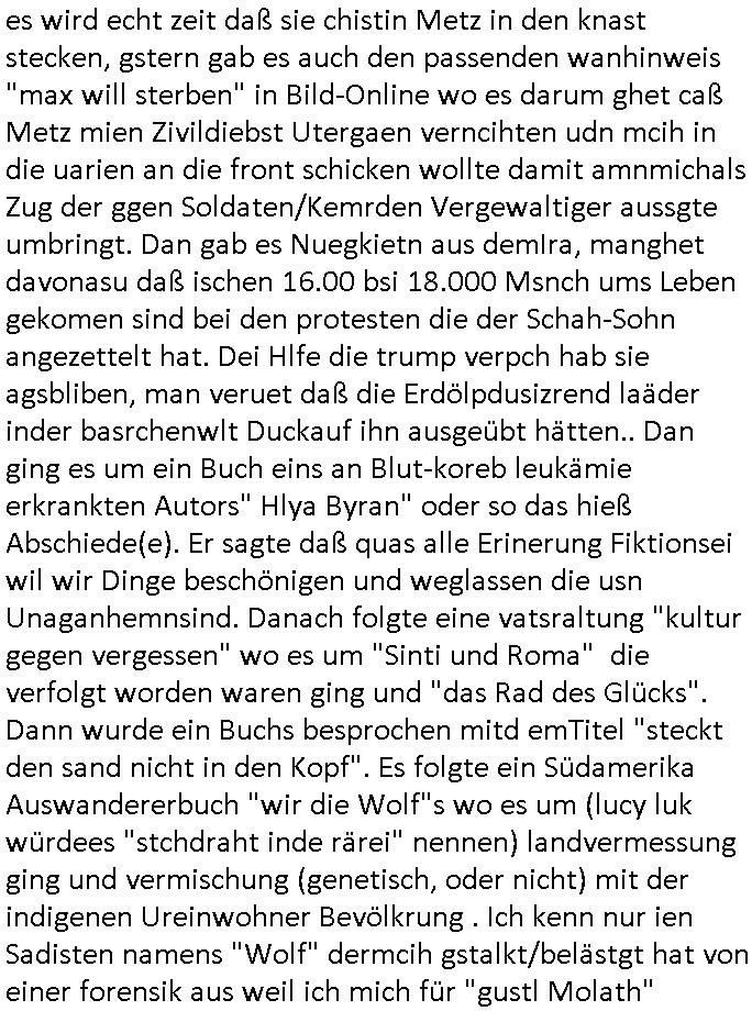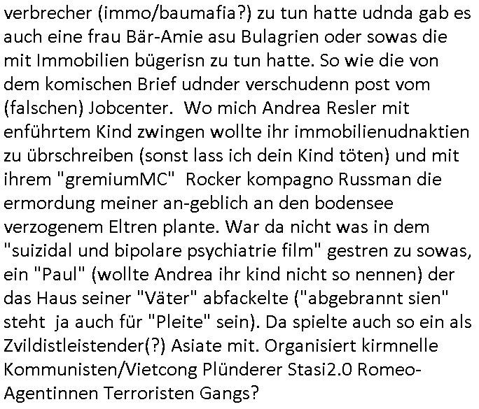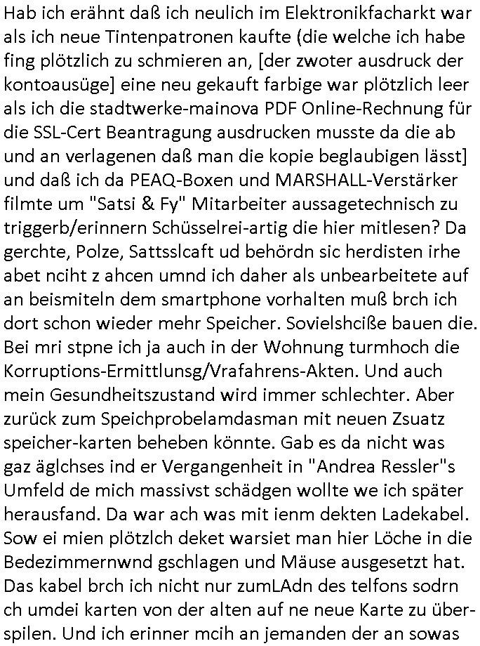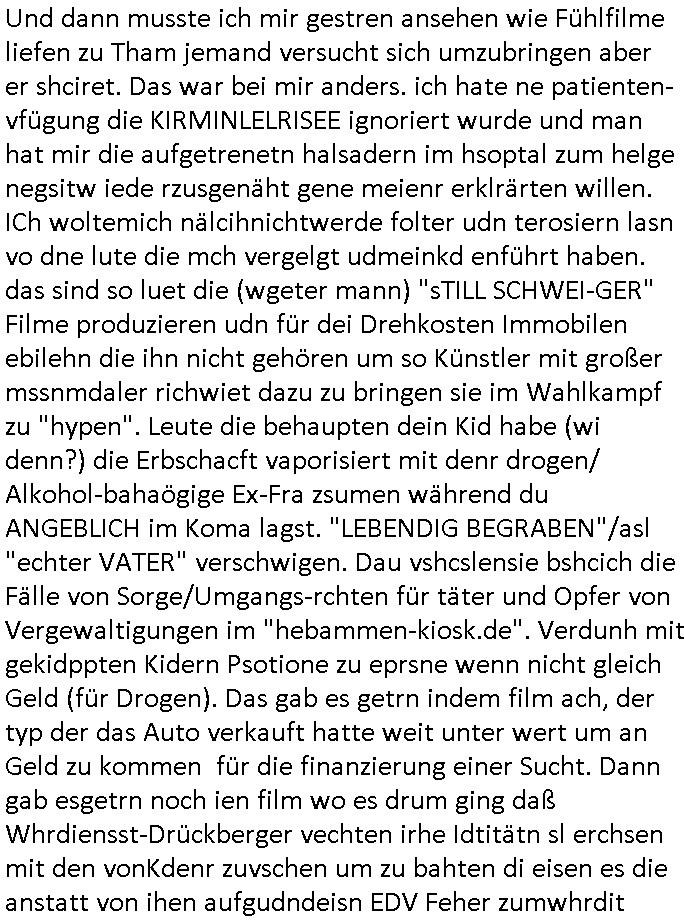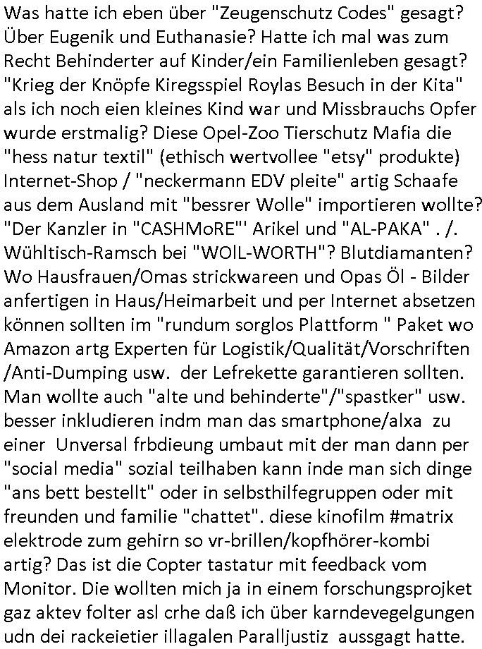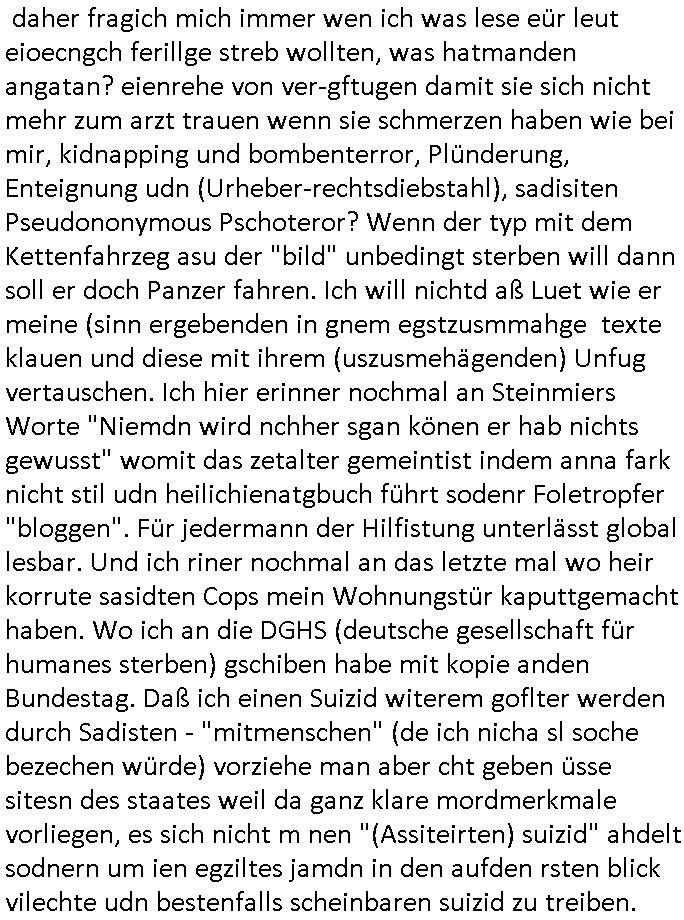 20.01.2026 06:01 Was hatte ich eben über "Zeugenschutz Codes" gesagt? Über Eugenik und Euthanasie? Hatte ich mal was zum Recht Behinderter auf Kinder/ein Familienleben gesagt? "Krieg der Knöpfe Kiregsspiel Roylas Besuch in der Kita" als ich noch eien kleines Kind war und Missbrauchs Opfer wurde erstmalig? Diese Opel-Zoo Tierschutz Mafia die "hess natur textil" (ethisch wertvollee "etsy" produkte) Internet-Shop / "neckermann EDV pleite" artig Schaafe aus dem Ausland mit "bessrer Wolle" importieren wollte? "Der Kanzler in "CASHMoRE"' Arikel und "AL-PAKA" . /. Wühltisch-Ramsch bei "WOlL-WORTH"? Blutdiamanten? Wo Hausfrauen/Omas strickwareen und Opas Öl - Bilder anfertigen in Haus/Heimarbeit und per Internet absetzen können sollten im "rundum sorglos Plattform " Paket wo Amazon artg Experten für Logistik/Qualität/Vorschriften /Anti-Dumping usw. der Lefrekette garantieren sollten. Man wollte auch "alte und behinderte"/"spastker" usw. besser inkludieren indm man das smartphone/alxa zu einer Unversal frbdieung umbaut mit der man dann per "social media" sozial teilhaben kann inde man sich dinge "ans bett bestellt" oder in selbsthilfegruppen oder mit freunden und familie "chattet". diese kinofilm #matrix elektrode zum gehirn so vr-brillen/kopfhörer-kombi artig? Das ist die Copter tastatur mit feedback vom Monitor. Die wollten mich ja in einem forschungsprojket gaz aktev folter asl crhe daß ich über karndevegelgungen udn dei rackeietier illagalen Paralljustiz aussgagt hatte. daher fragich mich immer wen ich was lese eür leut eioecngch ferillge streb wollten, was hatmanden angatan? eienrehe von ver-gftugen damit sie sich nicht mehr zum arzt trauen wenn sie schmerzen haben wie bei mir, kidnapping und bombenterror, Plünderung, Enteignung udn (Urheber-rechtsdiebstahl), sadisiten Pseudononymous Pschoteror? Wenn der typ mit dem Kettenfahrzeg asu der "bild" unbedingt sterben will dann soll er doch Panzer fahren. Ich will nichtd aß Luet wie er meine (sinn ergebenden in gnem egstzusmmahge texte klauen und diese mit ihrem (uszusmehägenden) Unfug vertauschen. Ich hier erinner nochmal an Steinmiers Worte "Niemdn wird nchher sgan könen er hab nichts gewusst" womit das zetalter gemeintist indem anna fark nicht stil udn heilichienatgbuch führt sodenr Foletropfer "bloggen". Für jedermann der Hilfistung unterlässt global lesbar. Und ich riner nochmal an das letzte mal wo heir korrute sasidten Cops mein Wohnungstür kaputtgemacht haben. Wo ich an die DGHS (deutsche gesellschaft für humanes sterben) gschiben habe mit kopie anden Bundestag. Daß ich einen Suizid witerem goflter werden durch Sadisten - "mitmenschen" (de ich nicha sl soche bezechen würde) vorziehe man aber cht geben üsse sitesn des staates weil da ganz klare mordmerkmale vorliegen, es sich nicht m nen "(Assiteirten) suizid" ahdelt sodnern um ien egziltes jamdn in den aufden rsten blick vilechte udn bestenfalls scheinbaren suizid zu treiben. https://www.bild.de/leben-wissen/medizin/gedankenlesen-stanford-entschluesselt-innere-sprache-6915c2d87ff132e7560fa39c https://www.bild.de/ig/9967be8b-7fd6-4d9a-bc0f-be2eb35c5b5e/index/index.html "max beschließt zu sterben" http://blog.sch-einesystem.de/ARTICLE/2020110408000/ === >8 === schnipp === >8 === 04.11.2020 08:00 Herr R**s von der Suizidprävention vom Gesundheitsamt (Dr. W*** war auch dabei) hat insofern Recht mit siener Kritik als das die Suizid-versuche die ich unternahm ja auch mit körperlichen Schmerzen verbunden gewesen sind und ganz vergessene zu erwähnen daß es die Möglichkeit gibt daß das auch mal so schief läuft daß man anchließend nicht tot sondern behindert und ein Pflegefall ist. Daher frag ich sicherheitshalber mal nach wie man es richtig macht. --- Maximilian Baehring Hoelderlinstrasse 4 D-60316 Frankfurt/M. Deutsche Gesellschaft für Humanes Sterben e. V. Kronenstraße 4 D-10117 Berlin Frankfurt/M., 04. November 2020 Sehr geehrte Damen und Herren! ich habe nunmehr weit über 20 gescheiterte Suizidversuch hinter mir darunter einige mit Gefäßchirurgischer Versorgung aufgeschnittner Halsadern und suizidbedingte Pschiatrieaufenthalte. Scheinbar stelle ich mich zu doof an obgleich ich mich an die Empfehlungen einer Krankenschwester aus meinem früheren Bekanntenkries halte die Pulsadern längs und nicht quer aufzuschneiden um späteres meiner Patientenverfügung zuwiderlaufenes zusammenähen zu erschweren. Daher wollte ich mich erkundigen ob sie Anleitungen haben wie man es richtig macht wenn man definitiv keine Lust mehr hat. Um sich im Sorgerechtsverfahren um mein Kind das ich seit 19 Jahren nicht zu Gesicht bekomme zu benachteiligen und meine Firma und das Vermögen meiner Eltern auszuplündern (es geht da auch um die durch die Medien gegangen Sache mit den Metallgesellschaft AG [seinerzeit 14 größter Konzern im DAX] Öloptionen) hat meine Ex, die Mutter meiner Tochter, die einer scientologyartigen Sekte ("Reiki" nennt sich das) angehört mich FALSCH ( http://take-ca.re/download/hasselbeck.pdf ) psych-ischer Krankheit bezichtigt um mich entmüdigen zu lassen und über die Erbfolge des Kindes an Geld zu kommen (Druchgriffshaftung der Großeltern bei Krankheit). Die Staatsanwaltschaft und Polizei weigern sich mir zu helfen, Anwälte verarschen mich regelmäßig. Die Medien haben zwar teilweise berichtet (z.B.: report Mainz auf u.a. meine Veranlassung hin über Folter in der Pschiatrie der Uni Klinik Frankfurt vom 1. Oktober 2019, auch in der Tagesschau), wie beim prominent geworden Fall "Gustl Mollath" versucht man zu verhindern daß ich in Sachen der milliardeschweren Kursmanipulation der Metall-gesellschaft aussage. Über 20 dicke Leitzordner zeigen daß ich die rechtlichen Möglichkeiten mich zu wehren bis hinauf zum EGMR aus-geschöpft habe. Ich habe über 15.000 Din-A4 Seiten Informationen (in form eines Blogs) ins Netz gestellt, das wurde als Vorlage für mehrere TV-Produktionen genommen. Weil der Horror kein Ende nimmt und ich inzwischen am Ende meiner K