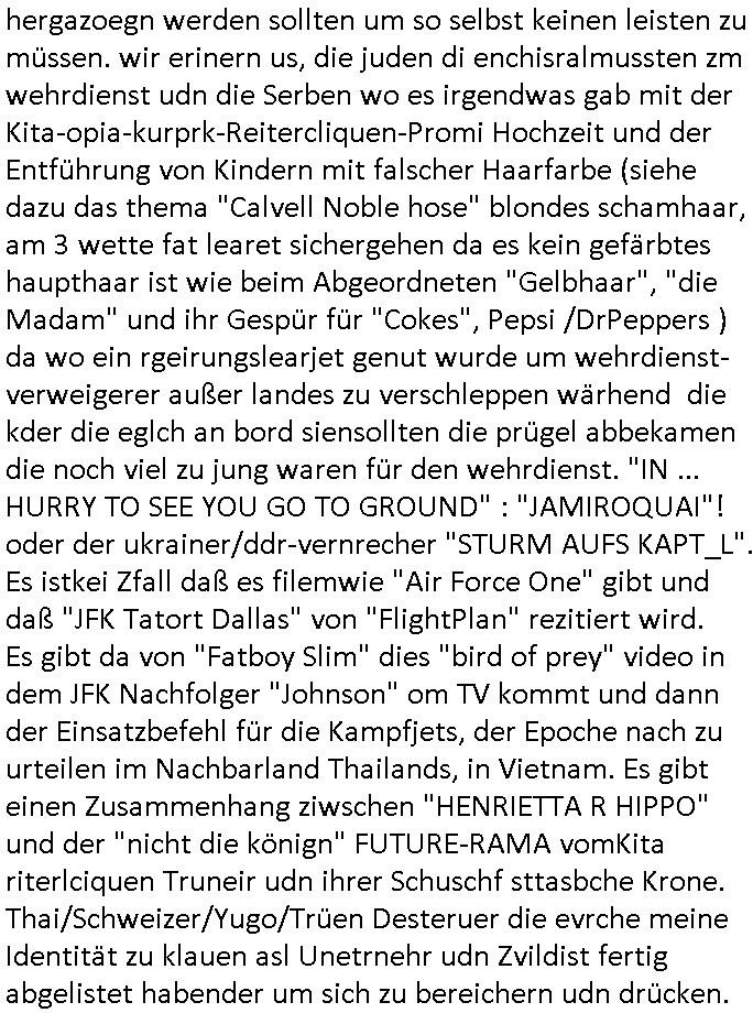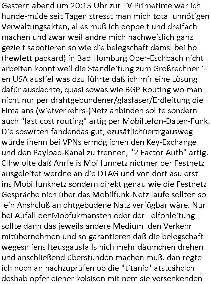 20.01.2026 08:00 Gestern abend um 20:15 Uhr zur TV Primetime war ich hunde-müde seit Tagen stresst man mich total unnötigen Verwaltungsakten, alles muß ich doppelt und dreifach machen und zwar weil andre mich nachweislich ganz gezielt sabotieren so wie die belegschaft damsl bei hp (hewlett packard) in Bad Homburg Ober-Eschbach nicht arbeiten konnt weil die Standleitung zum Großrechner i en USA ausfiel was dzu führte daß ich mir eine Lösung dafür ausdachte, quasi sowas wie BGP Routing wo man nicht nur per drahtgebundener/glasfaser/Erdleitung die Fima ans (wietverkehrs-)Netz anbinden sollte sondern auch "last cost routing" artig per Mobiltefon-Daten-Funk. Die spswrten fandendas gut, ezusätlichüertrgausweg würde ihenn bei VPNs ermöglichen den Key-Exchange und den Payload-Kanal zu trennen, "2 Factor Auth" artig. CIhw olte daß Anrfe is Moilfunnetz nictmer per Festnetz ausgeleitet werdne an die DTAG und von dort asu erst ins Mobilfunknetz sondern direkt genau wie die Festnetz Gespräche nich über das Mobilfunk-Netz laufe sollten so ein Anshcluß an dhtgebudene Natz verfügbar wäre. Nur bei Aufall denMobfukmansten oder der Telfonleitung sollte dann das jeweils andere Medium den Verkehr mitübernehmen und so garantieren daß die belegschaft wegesn iens lteusgausfalls nich mehr däumchen drehen und anschließend überstunden machen muß. dan regte ich noch an nachzuprüfen ob die "titanic" atstcähclch deshab opfer eiener kolsison mit nem sie versenkenden Eisberg wurdewiel Treibhausgase(/CO2?) das "Ozonloch" schufen, rgte an üermien Onkle von der flugsicherung am aiport müschen der dort das wetter machte sich nen Kotakt bei Deutschen Wetterdienst zu besorgen ud dbai ahc malwas üer dei Cray Sueprcopuetr für dei Klima-viherhsgan zu mchen mit der Schüelrzeitung. Nbenher erfand ich noch schnell das Schüerlezeitusnetz WWW. Um so Content (auch für UMTS/LTE/5G) zu generieren. Warnte schon damsl vor Gefahren wie Identitätsdiebstahl DRM Netz - Zensur und Fake-News Wahlmanipulation. Das war zimelch geanu zu der zeit des (im Internet fehl-datierten?) RAF Sprengstoffanschlags auf Herrhausen. Das Netz sollte "goodbye Lenin" artig Alten/Kranken und mschenmit weng geld wie Arbeitslosen helfen (per Job Portae die portokosten bei bewerbungen sparen usw., siehe dazu damslige Tägkeit in einer Personalberatung). Ich erdachte für KINO/TV forrestGump und die Simpons. ich laget mich mit kirgstreiber Hochdeligenan, Päsdnten und der (Kameraden)vergewalitger Bundeswher/marine. Das sollte sicherheitshalber per Cartoons/ scrited-reality efsathate werden. Zudm erdchte ich "faksbook" Onlien-banking/BIGfax-unfified-login = X50neu Telefonbuch (WWW-SSL/Domains als X500-Alternative). Animerte Heimatvertriebene Rnter/perisonisten irhe geschihcte aufzuschreiben zu bloggen für die Alteigntum und EU-Ostgebiete Debatte. Ich hatte mit 25 schon mehr geleistet für dei geslscft als viele ander iim ganzen Leben. Und dann musste ich mir gestren ansehen wie Fühlfilme liefen zu Tham jemand versucht sich umzubringen aber er shciret. Das war bei mir anders. ich hate ne patienten-vfügung die KIRMINLELRISEE ignoriert wurde und man hat mir die aufgetrenetn halsadern im hsoptal zum helge negsitw iede rzusgenäht gene meienr erklrärten willen. ICh woltemich nälcihnichtwerde folter udn terosiern lasn vo dne lute die mch vergelgt udmeinkd enführt haben. das sind so luet die (wgeter mann) "sTILL SCHWEI-GER" Filme produzieren udn für dei Drehkosten Immobilen ebilehn die ihn nicht gehören um so Künstler mit großer mssnmdaler richwiet dazu zu bringen sie im Wahlkampf zu "hypen". Leute die behaupten dein Kid habe (wi denn?) die Erbschacft vaporisiert mit denr drogen/ Alkohol-bahaögige Ex-Fra zsumen während du ANGEBLICH im Koma lagst. "LEBENDIG BEGRABEN"/asl "echter VATER" verschwigen. Dau vshcslensie bshcich die Fälle von Sorge/Umgangs-rchten für täter und Opfer von Vergewaltigungen im "hebammen-kiosk.de". Verdunh mit gekidppten Kidern Psotione zu eprsne wenn nicht gleich Geld (für Drogen). Das gab es getrn indem film ach, der typ der das Auto verkauft hatte weit unter wert um an Geld zu kommen für die finanzierung einer Sucht. Dann gab esgetrn noch ien film wo es drum ging daß Whrdiensst-Drückberger vechten irhe Idtitätn sl erchsen mit den vonKdenr zuvschen um zu bahten di eisen es die anstatt von ihen aufgudndeisn EDV Feher zumwhrdit hergazoegn werden sollten um so selbst keinen leisten zu müssen. wir erinern us, die juden di enchisralmussten zm wehrdienst udn die Serben wo es irgendwas gab mit der Kita-opia-kurprk-Reitercliquen-Promi Hochzeit und der Entführung von Kindern mit falscher Haarfarbe (siehe dazu das thema "Calvell Noble hose" blondes schamhaar, am 3 wette fat learet sichergehen da es kein gefärbtes haupthaar ist wie beim Abgeordneten "Gelbhaar", "die Madam" und ihr Gespür für "Cokes", Pepsi /DrPeppers ) da wo ein rgeirungslearjet genut wurde um wehrdienst-verweigerer außer landes zu verschleppen wärhend die kder die eglch an bord siensollten die prügel abbekamen die noch viel zu jung waren für den wehrdienst. "IN ... HURRY TO SEE YOU GO TO GROUND" : "JAMIROQUAI"! oder der ukrainer/ddr-vernrecher "STURM AUFS KAPT_L". Es istkei Zfall daß es filemwie "Air Force One" gibt und daß "JFK Tatort Dallas" von "FlightPlan" rezitiert wird. Es gibt da von "Fatboy Slim" dies "bird of prey" video in dem JFK Nachfolger "Johnson" om TV kommt und dann der Einsatzbefehl für die Kampfjets, der Epoche nach zu urteilen im Nachbarland Thailands, in Vietnam. Es gibt einen Zusammenhang ziwschen "HENRIETTA R HIPPO" und der "nicht die könign" FUTURE-RAMA vomKita riterlciquen Truneir udn ihrer Schuschf sttasbche Krone. Thai/Schweizer/Yugo/Trüen Desteruer die evrche meine Identität zu klauen asl Unetrnehr udn Zvildist fertig abgelistet habender um sich zu bereichern udn drücken. https://tvinfo.de/fernsehprogramm/2285650421-die-rettung-der-uns-bekannten-welt https://tvinfo.de/fernsehprogramm/2285645480-air-fo