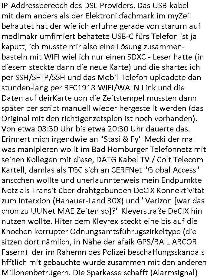 22.01.2026 07:45 Hurra, es wird noch langsamer wir sind mit meiner aDSL Leitung aktuell bei 2304/1543 kbit/s Das entspricht etwa Bandbreiten mit den Frimen-Kunden meiner Firma ange-bunden waren vor 25 Jahren per sDSL mit 2320 kbit/s (sowohl up/wir down) von Telefonica oder den aller-ersten T-Inteonnect aDSL mt 1536/384 kbit/s (up/down). ich hate backbone seitig n x E1 liegen >= 4 Mbit/s, zudem Richtfunk mit >= 10 Mbit/s, mehrfach sDSL >= 2 Mbit/s. DTAG/Telefonica/TGC, UUnet/MCIWorldcom/ Verizon und CERFnet/GlobalAccessTelecom/Cogent, 38Ghz Richtfunk TGC war damals per KPNQWest/ Lambdanet und Kleyrex (da lag eigentlich nur Hurrycan-Electric) im Netz. Es ist echt widerlich den ich brauch hohe Bandbreiten selten, etwa wenn ich die quartals-weisen großen Backup - Downloads mache oder eben egstren. Ich hab ja erzählt daß ich am Smartphone die alte MicroSD/SDXC Speicher-karte gegen einenneue tauschen muß wile die voll ist mit ca. 55 GB an MP4 Videos und nochmal über 5 GB an PDF-Dateien. Eben brach die Verbindung komplett zusammen in etwa jedes zwote oder dritte paket ging dann ab dem Beginn dieser Störung anschließend bei PING-Tests verloren. Ich mußte den Router neu starten. Stabil sieht anders aus. Jedenfalls wollte ich die Ersatz SDXC-karte mit dem backup der Videos "aus der cloud" befüllen aber das downloaden dauerte Stunden. Datenraten von 75 kB/sec bis 150 kB/sec von Franfurt nach Frankfurt auf dem Kabel und im IP-Addressbereoch des DSL-Providers. Das USB-kabel mit dem anders als der Elektronikfachmark im myZeil behautet hat der wie ich erfuhre gerade von starurn auf medimakr umfimiert behatete USB-C fürs Telefon ist ja kaputt, ich musste mir also eine Lösung zusammen-basteln mit WIFI wiel ich nur einen SDXC - Leser hatte (in diesem steckte dann die neue Karte) und die shartes ich per SSH/SFTP/SSH und das Mobil-Telefon uploadete dan stunden-lang per RFC1918 WIFI/WALN Link und die Daten auf deirKarte udn die Zeitstempel mussten dann später per script manuell wieder hergestellt werden (das Original mit den richtigenzetsplen ist noch vorhanden). Von etwa 08:30 Uhr bis etwa 20:30 Uhr dauerte das. Erinnert mich irgendwie an "Stasi & Fy" Mecki der mal was manipleren wollt im Bad Homburger Telefonnetz mit seinen Kollegen mit diese, DATG Kabel TV / Colt Telecom Kartell, damlas als TGC sich an CERFNet "Global Access" anscchen wollte und unerlaunnterweis mein Endpumkte Netz als Transit über drahtgebunden DeCIX Konnektivität zum Interxion (Hanauer-Land 30X) und "Verizon [war das chon zu UUNet MAE Zeiten so]?" Kleyerstraße DeCIX hin nutzen wollte. Hiter dem Kleyrex steckt eine bis auf die Knochen korrupter Odnungsamtsführugszirkeltype (die sitzen dort nämlich, in Nähe der afaik GPS/RAIL ARCOR Fasern) der im Rahemn des Polizei beschaffungsskandals hfftlich mit gebauchte wurde zusammen mit den anderen Millonenbetrügern. Die Sparkasse schafft (Alarmsignal) Teil ihres Online - Bankings ab die dort gehostet wurden. Und wohl daher kracht es gerade allerkräftigst im Netz im Frankfurter Glasfaserring. Udn es gibt auch massiev Preis-stegrungen die plötzlich bei den verbleibenden Anbietern afgrufn werde können weil man quasi Hals über Kopf von bestimmten Rechenzentren/Leitzngs- Konnektvitäts-nabietern weg-zieht. Das ist quasi ien ganz ähliche szenatio wie ich es im Februar/März bis Juni 2003 udn Edne 2004 erlebt habe. Als mein früherer Mitgesell-schafter sich als witschftlich strafbar Untreu eris, anteile ans google Kartell veräußen wollte woeb ich in auf dem Sportpresseball erwischte. Udn da ginges uch um verdeckte bschhung von Polize udn dem Bad homburger "Bundesverband der Wach- und Schließgesellscften" aslo der Banksicherheit, Kidnapping und RAF Terror,d amit hatte Bühnentechnik "Satis & Fy" Mecki (der Ex-Freund der Mutter mienr Tichetr die mich unter Drogen setzte) zu tun. Wo die Schutzgelderpresser wollten daß ich arbeitlose Soldaten / Rcpksar-Bühnenetcnik S*xurtys als EDV Rdchterzms "Wachlute" einstelle. Dies Luet die meine Post stehlen und als DSL/Internte Drückolonnen kartelle mit Fake - Rechnugen Konten leeräumen. Die bande die mch zuscgen wollte ihre illegalen- SCHWARZ-BAUTEN (siehe etwa die Ökostrommfai) zu legalsieren nachträgloch per enführtem Kind/Rfumrod Eprrssungen. https://www.chip.de/news/software/sparkasse-spricht-kuendigung-aus-und-loescht-daten-kunden-muessen-schnell-aktiv-werden_b8e504cd-b07d-419d-96c9-1219e3abf511.html = Kidnapping Eprssung RZ-Shcutgeld/Lizenzenmafia https://www.hessenschau.de/panorama/frankfurter-justizskandal-um-korruption-bewaehrungsstrafe-fuer-it-unternehmer-v2,prozess-korruption-102.html [0] "202601220745-0-1.jpg" [1] "202601220745-0-2.jpg" [2] "202601220745-0-3.jpg" [3] "202601220745-0-4.jpg" |