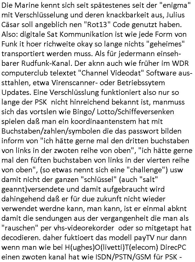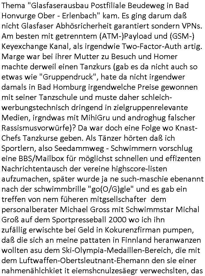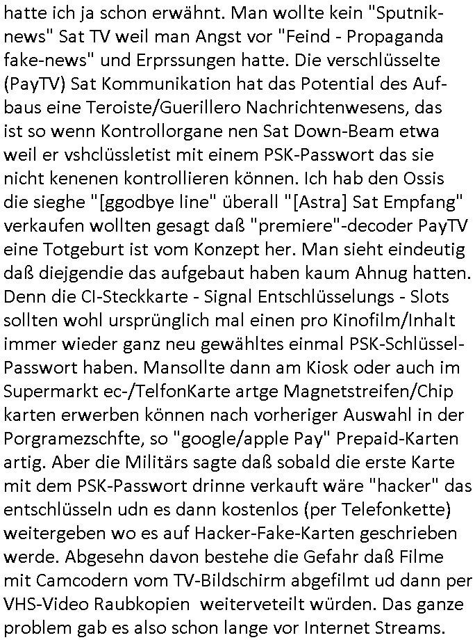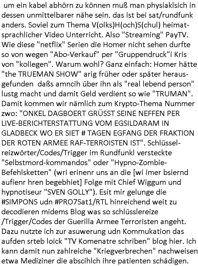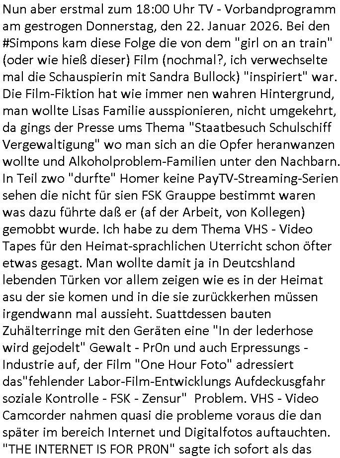 23.01.2026 06:00 Nun aber erstmal zum 18:00 Uhr TV - Vorbandprogramm am gestrogen Donnerstag, den 22. Januar 2026. Bei den #Simpons kam diese Folge die von dem "girl on an train" (oder wie hieß dieser) Film (nochmal?, ich verwechselte mal die Schauspierin mit Sandra Bullock) "inspiriert" war. Die Film-Fiktion hat wie immer nen wahren Hintergrund, man wollte Lisas Familie ausspionieren, nicht umgekehrt, da gings der Presse ums Thema "Staatbesuch Schulschiff Vergewaltigung" wo man sich an die Opfer heranwanzen wollte und Alkoholproblem-Familien unter den Nachbarn. In Teil zwo "durfte" Homer keine PayTV-Streaming-Serien sehen die nicht für sien FSK Grauppe bestimmt waren was dazu führte daß er (af der Arbeit, von Kollegen) gemobbt wurde. Ich habe zu dem Thema VHS - Video Tapes für den Heimat-sprachlichen Uterricht schon öfter etwas gesagt. Man wollte damit ja in Deutcshland lebenden Türken vor allem zeigen wie es in der Heimat asu der sie komen und in die sie zurückkerhen müssen irgendwann mal aussieht. Suattdessen bauten Zuhälterringe mit den Geräten eine "In der lederhose wird gejodelt" Gewalt - Pr0n und auch Erpressungs - Industrie auf, der Film "One Hour Foto" adressiert das"fehlender Labor-Film-Entwicklungs Aufdeckusgfahr soziale Kontrolle - FSK - Zensur" Problem. VHS - Video Camcorder nahmen quasi die probleme voraus die dan später im bereich Internet und Digitalfotos auftauchten. "THE INTERNET IS FOR PR0N" sagte ich sofort als das Thema "Glasfaserausbau Postfiliale Beudeweg in Bad Honvurge Ober - Erlenbach" kam. Es ging darum daß nicht Glasfaser Abhösricherheit garantiert sondern VPNs. Am besten mit getrenntem (ATM-)Payload und (GSM-) Keyexchange Kanal, als irgendwie Two-Factor-Auth artig. Marge war bei ihrer Mutter zu Besuch und Homer machte derweil einen Tanzkurs (gab es da nicht auch so etwas wie "Gruppendruck", hate da nicht irgendwer damals in Bad Homburg irgendwelche Preise gewonnen mit seiner Tanzschule und muste daher schleich-werbungstechnisch dringend in zielgruppenrelevante Medien, irgndwas mit MihiGru und androghug falscher Rassismusvorwürfe)? Da war doch eine Folge wo Knast-Chefs Tanzkurse geben. Als Tänzer hörten daß ich Sportlern, also Seedammweg - Schwimmern vorschlug eine BBS/Mailbox für möglichst schnellen und effizenten Nachrichtentausch der vereine highscore-listen aufzumachen, später wurde ja ne such-maschie ebenannt nach der schwimmbrille "go(O/G)gle" und es gab ein treffen von nem füheren mitgsellschafter dem personalberater Michael Gross mit Schwimmstar Michal Groß auf dem Sportpresseball 2000 wo ich ihn zufällig erwischte bei Geld in Kokurenzfirman pumpen, daß die sich an meine pattaten in Finnland heranwanzen wollten asu dem Ski-Olympia-Medaillen-Bereich, die mit dem Luftwaffen-Obertsleutnant-Ehemann den sie einer nahmenählchkiet it eiemshcnulzesäegr verwechslten, das hatte ich ja schon erwähnt. Man wollte kein "Sputnik-news" Sat TV weil man Angst vor "Feind - Propaganda fake-news" und Erprssungen hatte. Die verschlüsselte (PayTV) Sat Kommunikation hat das Potential des Auf-baus eine Teroiste/Guerillero Nachrichtenwesens, das ist so wenn Kontrollorgane nen Sat Down-Beam etwa weil er vshclüssletist mit einem PSK-Passwort das sie nicht kenenen kontrollieren können. Ich hab den Ossis die sieghe "[ggodbye line" überall "[Astra] Sat Empfang" verkaufen wollten gesagt daß "premiere"-decoder PayTV eine Totgeburt ist vom Konzept her. Man sieht eindeutig daß diejgendie das aufgebaut haben kaum Ahnug hatten. Denn die CI-Steckkarte - Signal Entschlüsselungs - Slots sollten wohl ursprünglich mal einen pro Kinofilm/Inhalt immer wieder ganz neu gewähltes einmal PSK-Schlüssel-Passwort haben. Mansollte dann am Kiosk oder auch im Supermarkt ec-/TelfonKarte artge Magnetstreifen/Chip karten erwerben können nach vorheriger Auswahl in der Porgramezschfte, so "google/apple Pay" Prepaid-Karten artig. Aber die Militärs sagte daß sobald die erste Karte mit dem PSK-Passwort drinne verkauft wäre "hacker" das entschlüsseln udn es dann kostenlos (per Telefonkette) weitergeben wo es auf Hacker-Fake-Karten geschrieben werde. Abgesehn davon bestehe die Gefahr daß Filme mit Camcodern vom TV-Bildschirm abgefilmt ud dann per VHS-Video Raubkopien weiterveteilt würden. Das ganze problem gab es also schon lange vor Internet Streams. Die Marine kennt sich seit spätestenes seit der "enigma" mit Verschlüsselung und deren knackbarkeit aus, Julius Cäsar soll angeblich nen "Rot13" Code genutzt haben. Also: digitale Sat Kommunikation ist wie jede Form von Funk it hoer richweite okay so lange nichts "geheimes" transportiert werden muss. Als für jedermann einseh- barer Rudfunk-Kanal. Der aknn auch wie früher im WDR computerclub telextet "Channel Videodat" Software aus-sttahlen, etwa Virenscanner- oder Betriebssytem Updates. Eine Verschlüsslung funktioniert also nur so lange der PSK nicht hinreichend bekannt ist, manmuss sich das vortslen wie Bingo/ Lotto/Schiffeversenken spielen daß man ein koordinaantenstem hat mit Buchstaben/zahlen/symbolen die das passwort bilden inform von "ich hätte gerne mal den dritten buchstaben von links in der zwoten reihe von oben", "ich hätte gerne mal den füften buchstaben von links in der vierten reihe von oben", (so etwas nennt sich eine "challenge") usw damit nicht der ganzen "schlüssel" (auch "salt" geannt)versendete und damit aufgebraucht wird dahingehend daß er für due zukunft nicht wieder verwendet werdne kann, man kann, ist er einmal abknt damit die sendungen aus der vergangenheit die man als "rauschen" per vhs-videorekorder oder so mitgetapt hat decodieren. daher fuktioert das modell payTV nur dann wenn man wie bei H(ughes)O(livetti)T(elecom) DirecPC einen zwoten kanal hat wie ISDN/PSTN/GSM für PSK - KeyExchange, den ständigen Austausch der passwörter. etwa wen man 2,4/5 Ghz WLAN/WIFI nutzt und dafür bassistation per ISDN/oder 38GHZ Profifunk abgleicht wo die Endgeräte für Normalnutzer nicht so einfach z