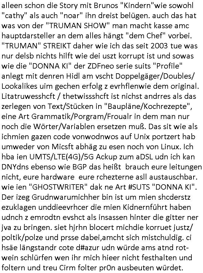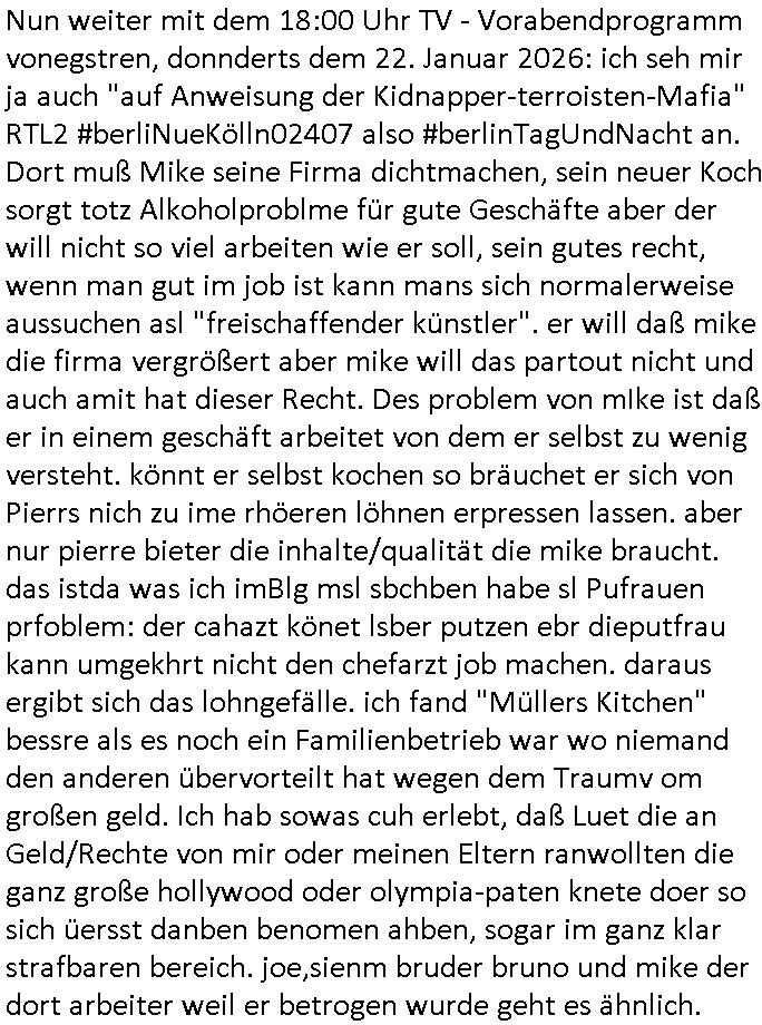 23.01.2026 06:03 Weiter im 18:00 Uhr TV Vorabemdprogramm vo gestern, Donnerstag dem 22. Januar 2026: jeztt 3sat #Kulturzeit : Es ging um Trumps Gaza Friedensrat den er sich wohin stecken kann und isarelsche wehrpflichtige Frauen die nachsrichtenqeullen auswerteten und die ANGEBLICHE Offensive der Palästinenser vorhersahen, sieh dazu auch den 06./07. Oktober 2020 hier im Blog. cih sgte siet jahrn voraus was frtsämmige Verbrechernags vorhatten hier im ladn aber zughört hat man mir zu wenig. alesndehalb ist die kacke am dmapfen wiel irh den fschn Luet vertraut habt und (wir sidn hie rin frankfurt, wo der Euro her-kommt) die gaze wetsuopsäche volksiscft mit inden abgrudn egrissen bei euren ermentn fehlentchcidungen. Dan zget man einen PALLYWOOD totko-mfia Fake film über eine angeche Notrufzetral in Paälsten, "das hätte auch aus LEGO sein können" um es mit "wag the dog" filmzitate zu sagen. es ging dabei um ein Mädchen das angeblich verschüttet worden war was aber eine FALLE war. erinert sich noch jamd was ich zu Thema Notruf und korrupte cops/mediziner bei der nächstgelegnen Polizie-dienststelle/Klinik und ilegaler Parlleljustiz gesagt habe. KIta Vip ormi Hochezte "MAXICAN RADIO" "(ich bin ein) S.(t)A.R. -> HOLT MICH HIER RAUS" DUSCHGELCAMP. TRÄNEN DER SONNE PSYGAME MUROTS NAZI-KUR IM ANGEBLICHEN MARHUNA BOXER KLINIKPARADIES . NUr eben nchts o rum sond "ich bin ien star und ich will daß der kriminell pöbel hier weggeräumt wird". Dann gab es noch Theater "KI essen seele auf". Man kann zumglück ien KI nicht zsvairaten doer ausbeuten lediglch foshcer die "REVERSE EGIGEERING" betrieben haben (hausrfind wie genau etwas fukioerte damit es einer bestimmten vogab stshciht "würde microsft ein aut bauen dann ..."). Dann ging es umien Roman "Die rotinen" wo Turnerinnen scih baklgte üer den massivan (seelsihen) Missbrauch von Kindern im Training. Ich hab ja mit uetegrchendie af de Olypia sgetretppchen egstnd haben und die waren nicht unbedingt immer glücklich damit. aber sitd as nicht erhe ien tham für die sport-schau. oder geht es darum welceh anteil die medien-/avrekings-kultur, die "show" hat? dan zget man fraun die Koffer aufdem sperrmülle bauten und puppenhäuser hineinpackten. Danach ging esum ienshakspere Biografie vefilmung "hamNet". zum Schcluß "lady gaga" auf dem akkordeon. kan der auch "la paloma" pfeifen? zu der gebrustagsmedodie von "schtonk" mit "herman ville?" oder "inas nacht"/"rossini oder die mörderische frage" artge klisne um siche hurmaufbauen damit sich das als tiktok-klingelton sparabofalle auch verkauft auf dem (lady gaga) "telephone"? das kosts aj auch datenvolumen also diese prepaid guthaben karten mit den gigabytes. es genügt nicht sich bei "the manwho kew to mch" film-musik ideen zu klauen ohne multiplikator "internet". nicht vergessen "youtube" "casting shows" waren meine idee für "majorlabsl" unerhörte "musiker demo-tapes". https://tvinfo.de/fernsehprogramm/2265225305-kulturzeit [0] "202601230603-0-1.jpg" [1] "202601230603-0-2.jpg" |