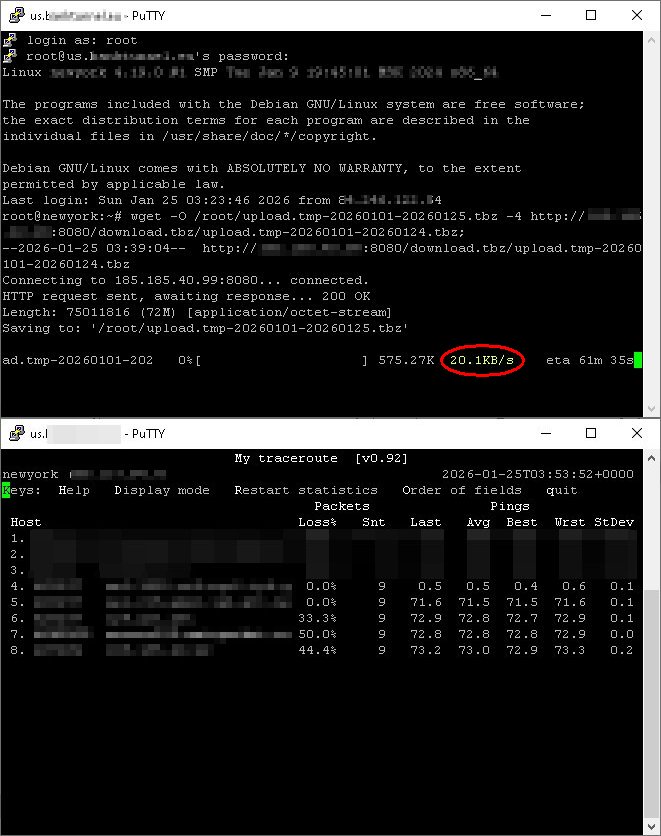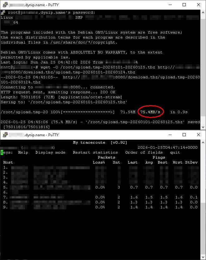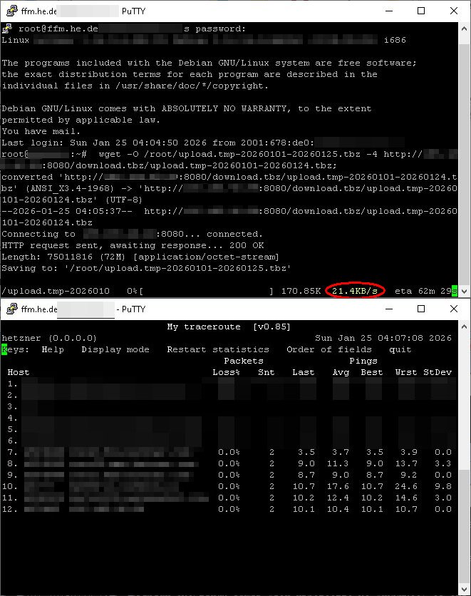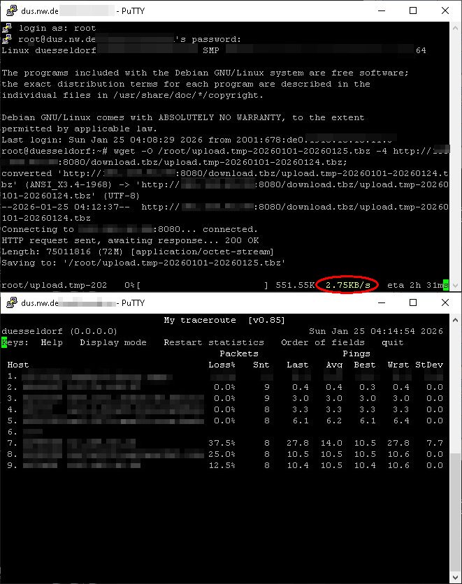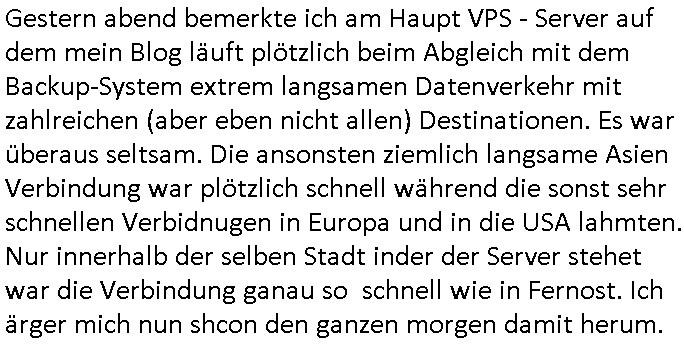 Gestern abend bemerkte ich am Haupt VPS - Server auf dem mein Blog läuft plötzlich beim Abgleich mit dem Backup-System extrem langsamen Datenverkehr mit zahlreichen (aber eben nicht allen) Destinationen. Es war überaus seltsam. Die ansonsten ziemlich langsame Asien Verbindung war plötzlich schnell während die sonst sehr schnellen Verbidnugen in Europa und in die USA lahmten. Nur innerhalb der selben Stadt inder der Server stehet war die Verbindung ganau so schnell wie in Fernost. Ich ärger mich nun shcon den ganzen morgen damit herum.