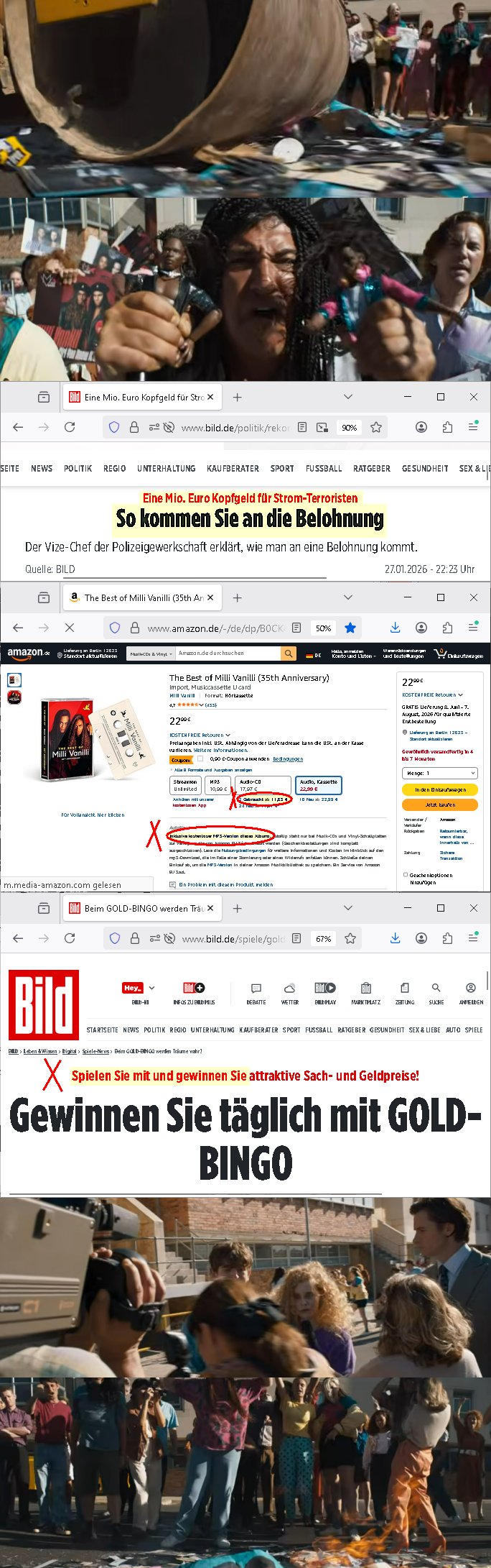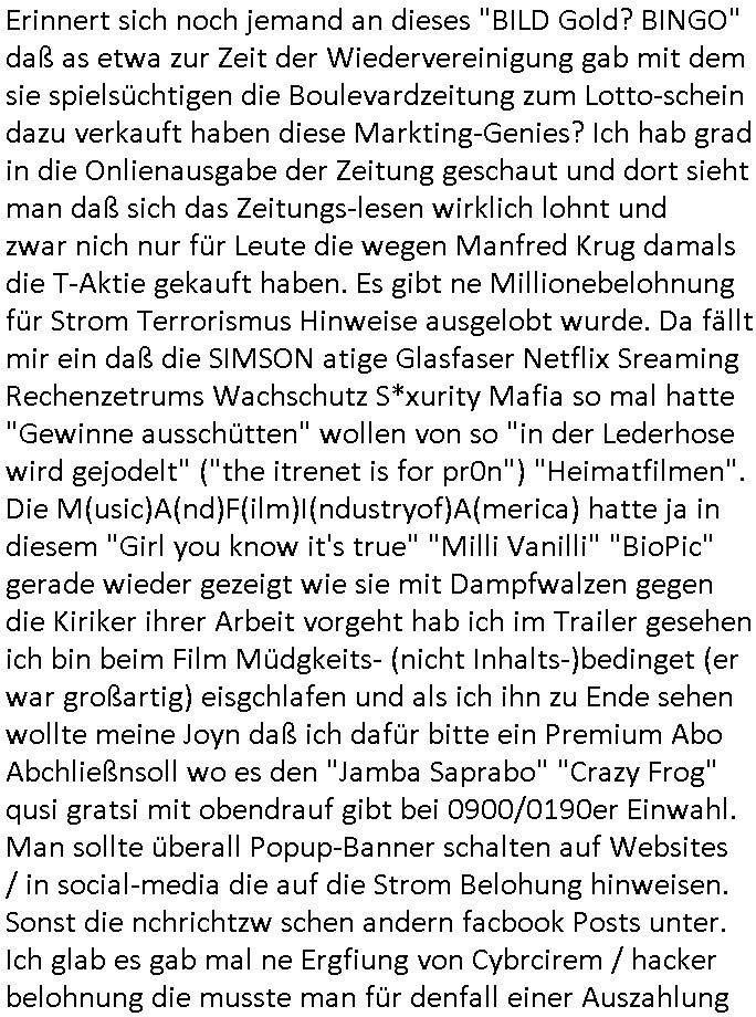 Erinnert sich noch jemand an dieses "BILD Gold? BINGO" daß as etwa zur Zeit der Wiedervereinigung gab mit dem sie spielsüchtigen die Boulevardzeitung zum Lotto-schein dazu verkauft haben diese Markting-Genies? Ich hab grad in die Onlienausgabe der Zeitung geschaut und dort sieht man daß sich das Zeitungs-lesen wirklich lohnt und zwar nich nur für Leute die wegen Manfred Krug damals die T-Aktie gekauft haben. Es gibt ne Millionebelohnung für Strom Terrorismus Hinweise ausgelobt wurde. Da fällt mir ein daß die SIMSON atige Glasfaser Netflix Sreaming Rechenzetrums Wachschutz S*xurity Mafia so mal hatte "Gewinne ausschütten" wollen von so "in der Lederhose wird gejodelt" ("the itrenet is for pr0n") "Heimatfilmen". Die M(usic)A(nd)F(ilm)I(ndustryof)A(merica) hatte ja in diesem "Girl you know it's true" "Milli Vanilli" "BioPic" gerade wieder gezeigt wie sie mit Dampfwalzen gegen die Kiriker ihrer Arbeit vorgeht hab ich im Trailer gesehen ich bin beim Film Müdgkeits- (nicht Inhalts-)bedinget (er war großartig) eisgchlafen und als ich ihn zu Ende sehen wollte meine Joyn daß ich dafür bitte ein Premium Abo Abchließnsoll wo es den "Jamba Saprabo" "Crazy Frog" qusi gratsi mit obendrauf gibt bei 0900/0190er Einwahl. Man sollte überall Popup-Banner schalten auf Websites / in social-media die auf die Strom Belohung hinweisen. Sonst die nchrichtzw schen andern facbook Posts unter. Ich glab es gab mal ne Ergfiung von Cybrcirem / hacker belohnung die musste man für denfall einer Auszahlung