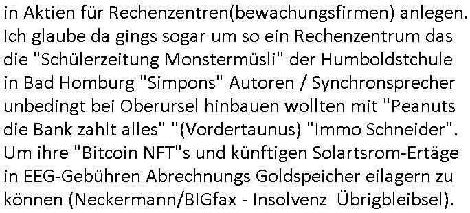 in Aktien für Rechenzentren(bewachungsfirmen) anlegen. Ich glaube da gings sogar um so ein Rechenzentrum das die "Schülerzeitung Monstermüsli" der Humboldstchule in Bad Homburg "Simpons" Autoren / Synchronsprecher unbedingt bei Oberursel hinbauen wollten mit "Peanuts die Bank zahlt alles" "(Vordertaunus) "Immo Schneider". Um ihre "Bitcoin NFT"s und künftigen Solartsrom-Ertäge in EEG-Gebühren Abrechnungs Goldspeicher eilagern zu können (Neckermann/BIGfax - Insolvenz Übrigbleibsel).