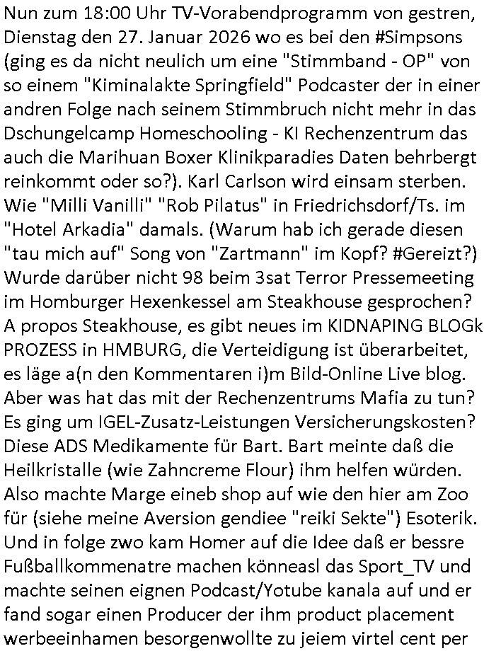 Nun zum 18:00 Uhr TV-Vorabendprogramm von gestren, Dienstag den 27. Januar 2026 wo es bei den #Simpsons (ging es da nicht neulich um eine "Stimmband - OP" von so einem "Kiminalakte Springfield" Podcaster der in einer andren Folge nach seinem Stimmbruch nicht mehr in das Dschungelcamp Homeschooling - KI Rechenzentrum das auch die Marihuan Boxer Klinikparadies Daten behrbergt reinkommt oder so?). Karl Carlson wird einsam sterben. Wie "Milli Vanilli" "Rob Pilatus" in Friedrichsdorf/Ts. im "Hotel Arkadia" damals. (Warum hab ich gerade diesen "tau mich auf" Song von "Zartmann" im Kopf? #Gereizt?) Wurde darüber nicht 98 beim 3sat Terror Pressemeeting im Homburger Hexenkessel am Steakhouse gesprochen? A propos Steakhouse, es gibt neues im KIDNAPING BLOGk PROZESS in HMBURG, die Verteidigung ist überarbeitet, es läge a(n den Kommentaren i)m Bild-Online Live blog. Aber was hat das mit der Rechenzentrums Mafia zu tun? Es ging um IGEL-Zusatz-Leistungen Versicherungskosten? Diese ADS Medikamente für Bart. Bart meinte daß die Heilkristalle (wie Zahncreme Flour) ihm helfen würden. Also machte Marge eineb shop auf wie den hier am Zoo für (siehe meine Aversion gendiee "reiki Sekte") Esoterik. Und in folge zwo kam Homer auf die Idee daß er bessre Fußballkommenatre machen könneasl das Sport_TV und machte seinen eignen Podcast/Yotube kanala auf und er fand sogar einen Producer der ihm product placement werbeeinhamen besorgenwollte zu jeiem virtel cent per
