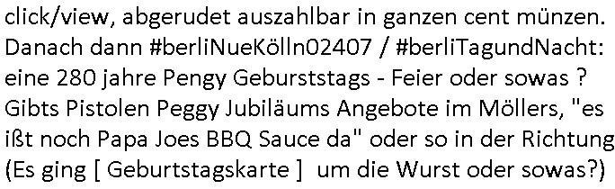 click/view, abgerudet auszahlbar in ganzen cent münzen. Danach dann #berliNueKölln02407 / #berliTagundNacht: eine 280 jahre Pengy Geburststags - Feier oder sowas ? Gibts Pistolen Peggy Jubiläums Angebote im Möllers, "es ißt noch Papa Joes BBQ Sauce da" oder so in der Richtung (Es ging [ Geburtstagskarte ] um die Wurst oder sowas?)