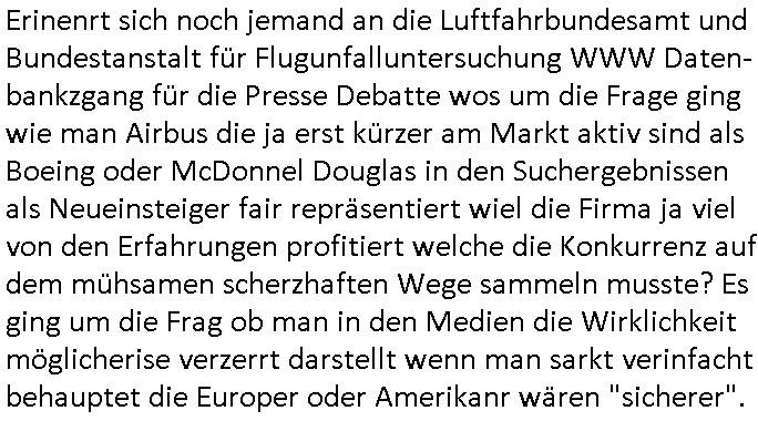 Erinenrt sich noch jemand an die Luftfahrbundesamt und Bundestanstalt für Flugunfalluntersuchung WWW Daten-bankzgang für die Presse Debatte wos um die Frage ging wie man Airbus die ja erst kürzer am Markt aktiv sind als Boeing oder McDonnel Douglas in den Suchergebnissen als Neueinsteiger fair repräsentiert wiel die Firma ja viel von den Erfahrungen profitiert welche die Konkurrenz auf dem mühsamen scherzhaften Wege sammeln musste? Es ging um die Frag ob man in den Medien die Wirklichkeit möglicherise verzerrt darstellt wenn man sarkt verinfacht behauptet die Europer oder Amerikanr wären "sicherer".