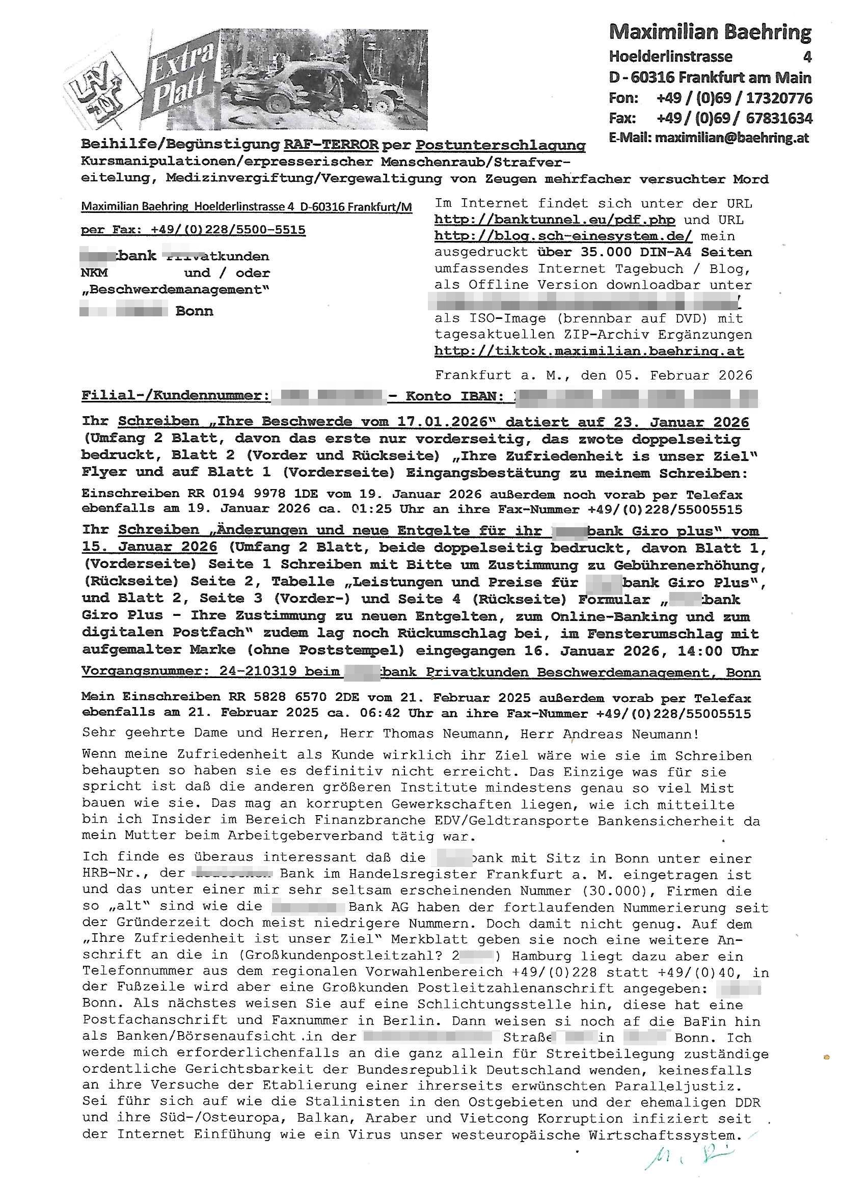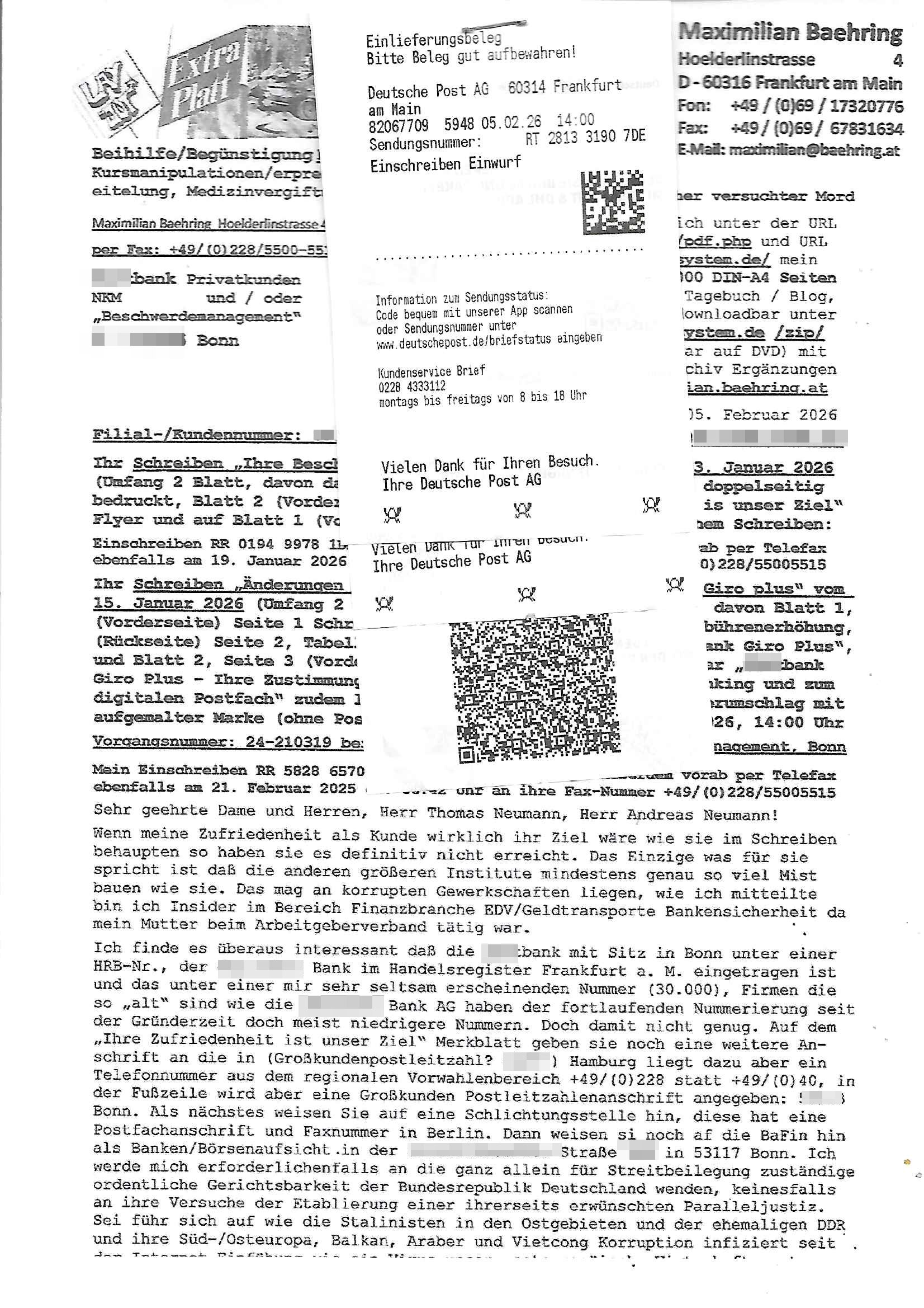 Ich finde es überaus interessant daß die ***bank mit Sitz in Bonn unter einer HRB-Nr., der *** Bank im Handelsregister Frankfurt a. M. eingetragen ist und das unter einer mir sehr seltsam erscheinenden Nummer (30.000), Firmen die so „alt“ sind wie die *** Bank AG haben der fortlaufenden Nummerierung seit der Gründerzeit doch meist niedrigere Nummern. Doch damit nicht genug. Auf dem „Ihre Zufriedenheit ist unser Ziel“ Merkblatt geben sie noch eine weitere An-schrift an die in (Großkundenpostleitzahl? ***) Hamburg liegt dazu aber ein Telefonnummer aus dem regionalen Vorwahlenbereich +49/(0)228 statt +49/(0)40, in der Fußzeile wird aber eine Großkunden Postleitzahlenanschrift angegeben: *** Bonn. Als nächstes weisen Sie auf eine Schlichtungsstelle hin, diese hat eine Postfachanschrift und Faxnummer in Berlin. Dann weisen si noch af die BaFin hin als Banken/Börsenaufsicht in der *** Straße *** in 53117 Bonn. Ich werde mich erforderlichenfalls an die ganz allein für Streitbeilegung zuständige ordentliche Gerichtsbarkeit der Bundesrepublik Deutschland wenden, keinesfalls an ihre Versuche der Etablierung einer ihrerseits erwünschten Paralleljustiz. Sei führ sich auf wie die Stalinisten in den Ostgebieten und der ehemaligen DDR und ihre Süd-/Osteuropa, Balkan, Araber und Vietcong Korruption infiziert seit der Internet Einfühung wie ein Virus unser westeuropäische Wirtschaftssystem.