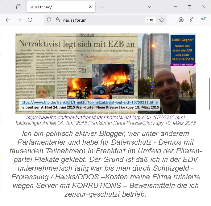 07.02.2026 20:00 ( per IPv4/IPv6 und mit SSL verfügbar: https://neues.forum ) http://neues.forum © Maximilian Bähring, Frankfurt a.M. Presse/Blogger Infos zu Hintergründen vom "Terroranschlag der RAF auf Herrhausen in Bad Homburg" und dem Thema "Staatsbesuch Vergewaltigung" http://blog.sch-einesystem.de (oder) https://zentral-bank.eu/tumblr.com/ PDF-Downloads http://banktunnel.eu /pdf.php 35.000 Seiten https://www.bpb.de/kurz-knapp/hintergrund-aktuell/196955/vor-30-jahren-ermordung-von-alfred-herrhausen/ Ich weiß welcher "korrupte Cop" das mit der Falschaussage war ! https://www.fnp.de/frankfurt/frankfurter-netzaktivist-legt-sich-10753211.html halbseitiger Artikel 24. Juni 2015 Frankfurter Neue Presse/Blockupy 18. März 2015 Ich bin politisch aktiver Blogger, war unter anderem Parlamentarier und habe für Datenschutz - Demos mit tausenden Teilnehmern in Frankfurt im Umfeld der Piraten- partei Plakate geklebt. Der Grund ist daß ich in der EDV unternehmerisch tätig war bis man durch Schutzgeld - Erpressung / Hacks/DDOS –Kosten meine Firma ruinierte wegen Server mit KORRUTIONS – Beweismitteln die ich zensur-geschützt betrieb. Wahrer Hintergrund des Sprengstoffanschlags der RAF auf die Limousine Bankvorstand Herrhausen: DATUMS - Angaben im Netz manipuliert Die Bank HERRHAUSENs und „PENAUTs“ Koppers spekulierte mit DDR/Ostgebiet Alteigentum ! Nach der Wiedervereinigung sollten Stalins (DDR/Ost) wie auch Hitlers (Juden) Enteignung rückgängig gemacht werden! Prominente Opfer und Täter: Metallgesellschaft AG (Aktien - Alteigentum = neuer Vorstand = Öl Skandal) + Immo Schneider Alte Oper Frankfurt a.M. Baumafia trieb DAX Konzern in Ruin um Areal „Welle“ bebauen zu können Ich war zum Zeitpunkt des Sprengstoff-Anschlags Redakteur einer Zeitung bin zusammen mit Prof. Christian Metz von 3sat-TV , ZDF in Mainz habezur Schule gegangen habe Germanistik studiert.Man versuchte mich mehrfach umzubringen undlegte Feuer im Haus wo ich mein 30.000 Seiten Recherche Akten lagere, man durchtrennte Kabel(Alarmanlage ausschalten), hört mein Telefon ab.Als ich wegen der Korruption auszusagen versuchte wurde ich von Polizisten (vereinfacht dargestellt) insKrankenhaus geprügelt. Der Herr B. bekam am 24.12.2014 die Nachricht, dass er kein Sorgerecht für seine uneheliche Tochter bekommt. In der Nacht vom 24.12-25.12. versuchte er sich durch Selbstverletzung mit einem Messer (am Hals und an beiden Unterarmen) das Leben zu nehmen. Von den Verletzungen machte er Bilder und verÃöffentlichte diese im lnternet- http://www.sch-einesystem.de . Die Polizei wurde darüber anonym verstöndigt. Nachdem ermittelt wurde, dass er sich in seiner Wohnung befand, wurde diese gewaltsam geöffnetâda damit eine Gefahr für eingesetzten Beamten verringert werden konnte. Während der Ingewahrsamnahme äußrte er wiederholtâgegen die Nichterteilung des Sorgerechts zu demonstrieren. Damit ich nicht vor europäischen / internationalen Gerichten aussage was ich weiß "kidnappte" man (vereinfacht ausgeddückt) durch korrupte Behörden jenes Kind das man mir mittels Freiheitsberaubung / Psycho-Drogen Vergiftung 1999 anvergewaltigt hatte um mich und meine Familie erpressen zu können. Erpresser wollten daß ich mich "vor laufender Cam" scheinbar selbst umbringe Mord als Suizid getarnt. Schlüsselreiz: Bedrohung Familie Bilder "verpixelt" zur Überwindung "SOCIAL - MEDIA" Gewalt - ZENSUR 5 Suizidversuche wegen exzessiver Folter durch Justiz / Blog: 24. Dezember 2014 === << http://neues.forum Maximilian Baehring - Hoelderlinstrasse 4 - D-60316 Frankfurt/M. http://maximilian.baehring.at Mail: maximilian@baehring.at Fon: +49/(0)69/17320776 +49/(0)176/65605075 Fax: +49/(0)69/67831634 Blog(s): http://blog.sch-einesystem.de http://tabea-lara.blogna.me http://wuergerjagd.blogna.me http://decl-war.blogna.me http://anschlag215.blogna.me PDFs: http://banktunnel.eu /pdf.php http://bad-homburg.eu/download/ Tiktok: http://tiktok.maximilian.baehring.at [0] "202602072000-0-1.jpg" [1] "202602072000-0-2.jpg" [2] "202602072000-0-3.jpg" [3] "202602072000-0-4.jpg" [4] "202602072000-0-5.jpg" |