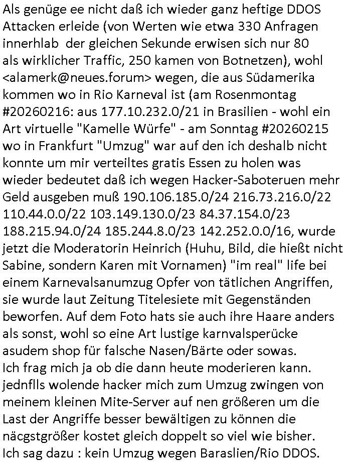 17.02.2026 05:15 Als genüge ee nicht daß ich wieder ganz heftige DDOS Attacken erleide (von Werten wie etwa 330 Anfragen innerhlab der gleichen Sekunde erwisen sich nur 80 als wirklicher Traffic, 250 kamen von Botnetzen), wohl <alamerk@neues.forum> wegen, die aus Südamerika kommen wo in Rio Karneval ist (am Rosenmontag #20260216: aus 177.10.232.0/21 in Brasilien - wohl ein Art virtuelle "Kamelle Würfe" - am Sonntag #20260215 wo in Frankfurt "Umzug" war auf den ich deshalb nicht konnte um mir verteiltes gratis Essen zu holen was wieder bedeutet daß ich wegen Hacker-Saboteruen mehr Geld ausgeben muß 190.106.185.0/24 216.73.216.0/22 110.44.0.0/22 103.149.130.0/23 84.37.154.0/23 188.215.94.0/24 185.244.8.0/23 142.252.0.0/16, wurde jetzt die Moderatorin Heinrich (Huhu, Bild, die hießt nicht Sabine, sondern Karen mit Vornamen) "im real" life bei einem Karnevalsanumzug Opfer von tätlichen Angriffen, sie wurde laut Zeitung Titelesiete mit Gegenständen beworfen. Auf dem Foto hats sie auch ihre Haare anders als sonst, wohl so eine Art lustige karnvalsperücke asudem shop für falsche Nasen/Bärte oder sowas. Ich frag mich ja ob die dann heute moderieren kann. jednflls wolende hacker mich zum Umzug zwingen von meinem kleinen Mite-Server auf nen größeren um die Last der Angriffe besser bewältigen zu können die näcgstgrößer kostet gleich doppelt so viel wie bisher. Ich sag dazu : kein Umzug wegen Baraslien/Rio DDOS. https://www.bild.de/unterhaltung/stars-und-leute/karneval-in-koeln-pralinen-unfall-bei-sabine-heinrich-69936d183b6ada89917a5afd [0] "202602170515-0-1.jpg" [1] "202602170515-0-2.jpg" |