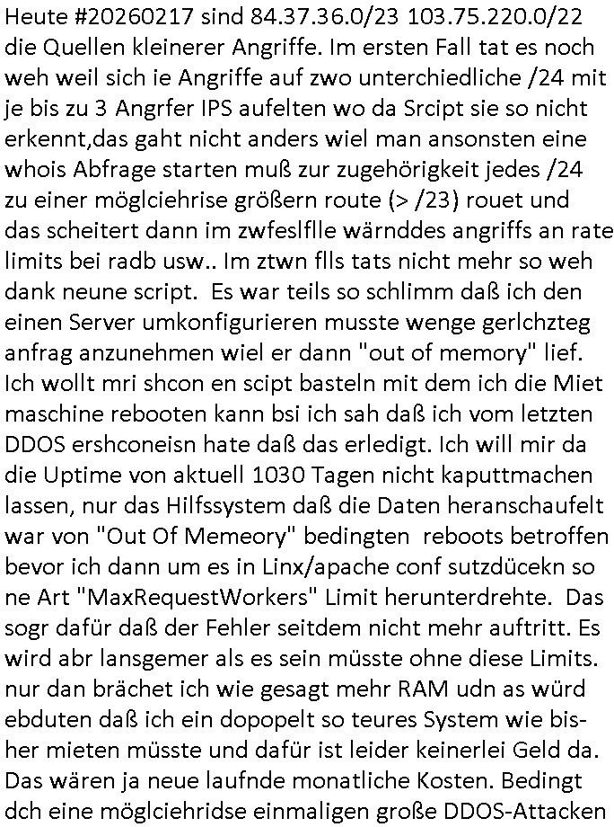 17.02.2026 05:45 Heute #20260217 sind 84.37.36.0/23 103.75.220.0/22 die Quellen kleinerer Angriffe. Im ersten Fall tat es noch weh weil sich ie Angriffe auf zwo unterchiedliche /24 mit je bis zu 3 Angrfer IPS aufelten wo da Srcipt sie so nicht erkennt,das gaht nicht anders wiel man ansonsten eine whois Abfrage starten muß zur zugehörigkeit jedes /24 zu einer möglciehrise größern route (> /23) rouet und das scheitert dann im zwfeslflle wärnddes angriffs an rate limits bei radb usw.. Im ztwn flls tats nicht mehr so weh dank neune script. Es war teils so schlimm daß ich den einen Server umkonfigurieren musste wenge gerlchzteg anfrag anzunehmen wiel er dann "out of memory" lief. Ich wollt mri shcon en scipt basteln mit dem ich die Miet maschine rebooten kann bsi ich sah daß ich vom letzten DDOS ershconeisn hate daß das erledigt. Ich will mir da die Uptime von aktuell 1030 Tagen nicht kaputtmachen lassen, nur das Hilfssystem daß die Daten heranschaufelt war von "Out Of Memeory" bedingten reboots betroffen bevor ich dann um es in Linx/apache conf sutzdücekn so ne Art "MaxRequestWorkers" Limit herunterdrehte. Das sogr dafür daß der Fehler seitdem nicht mehr auftritt. Es wird abr lansgemer als es sein müsste ohne diese Limits. nur dan brächet ich wie gesagt mehr RAM udn as würd ebduten daß ich ein dopopelt so teures System wie bis-her mieten müsste und dafür ist leider keinerlei Geld da. Das wären ja neue laufnde monatliche Kosten. Bedingt dch eine möglciehridse einmaligen große DDOS-Attacken Welle der irgdnwann acuh wieder abebbt udn ab da zahlt mndann für den Normalbetrieb viel zu große Kapazitäten. Ichbinecht sauer. Da sponsoren unsere "Royals" einmal im Jahr Gratis-essen daßsie vo wgan werfen wie US-Soldaten die beim Einmarsch 1945 Kaugummi an Kinder verteilten und ich kann wegen dieser "ANONYMOUS" DDOS Hacks nicht hin wo sich die Angreifer nicht "mit offnem Visier" dem Abwehr-Kampf per Firewall stellen wollen sondern sich quasi "mit Maske" oder "mit falschem bart" wie ein niedertächtiger hietrhältegr gemeiner kliener Feigling hinter Botnetz-IP Ranges verstecken. Ich wusste übrigens a propos Sonntag noch daß der #Tatort / #Polizeiruf110 Soundtrack Song von irgendwem wie "Viktor Lazlo" kam. Der film mt der Flucht (per Marseille?) nach Casablanca. Das hat mich an den einen Screenshot erinnert aus dem "Dr Zoch kütt" http://tiktok.maximilian.baehring.at Video von gestern wo es um Störung/Umleitung von (DRKhaus?) Notruf-leitungen ging in Vorbereitung von Bank- udn Juwelier-überfällen oder Sabotgakaten vor militätischen Übefall-artigen Einmärschen wie in "überfall auf Polen" (sieh diese "Welcome in Hell" G20 "Polonaise Blankenese") Na Hauptsache der moderatorin Heinrichs gehts inzwischen wieder besser. Ich bin gerade am über-legen ob das hohe Trafficaufkommen vielleicht an fehl-geleten suchnafragen am "True crime" Podcast der #Frühtsücksfernsehn (Sat1) Morderatorin "M wie Mar_ne" her kommt. [0] "202602170545-0-1.jpg" [1] "202602170545-0-2.jpg" [2] "202602170545-0-3.jpg" |