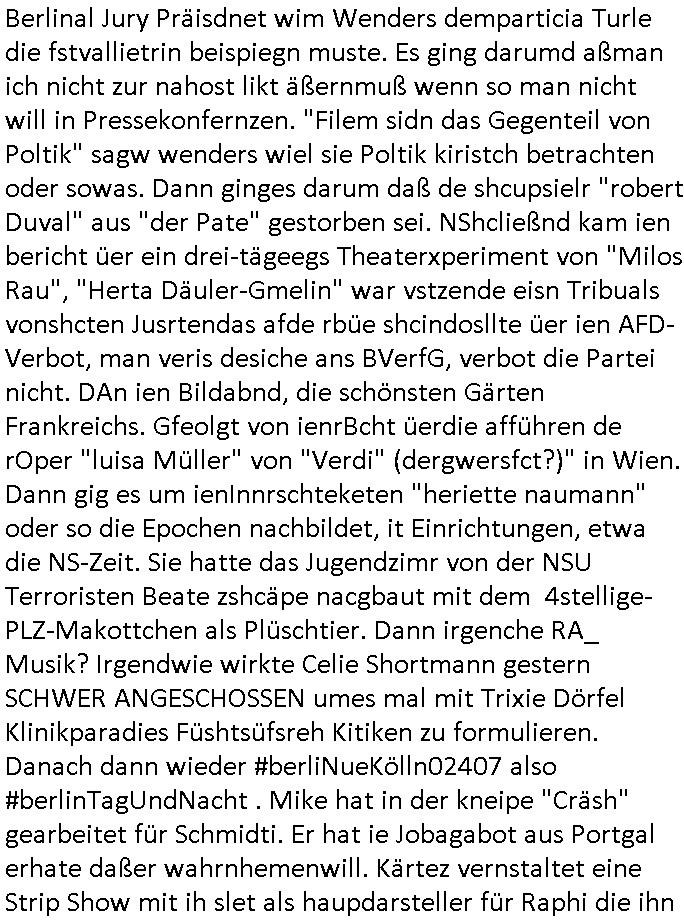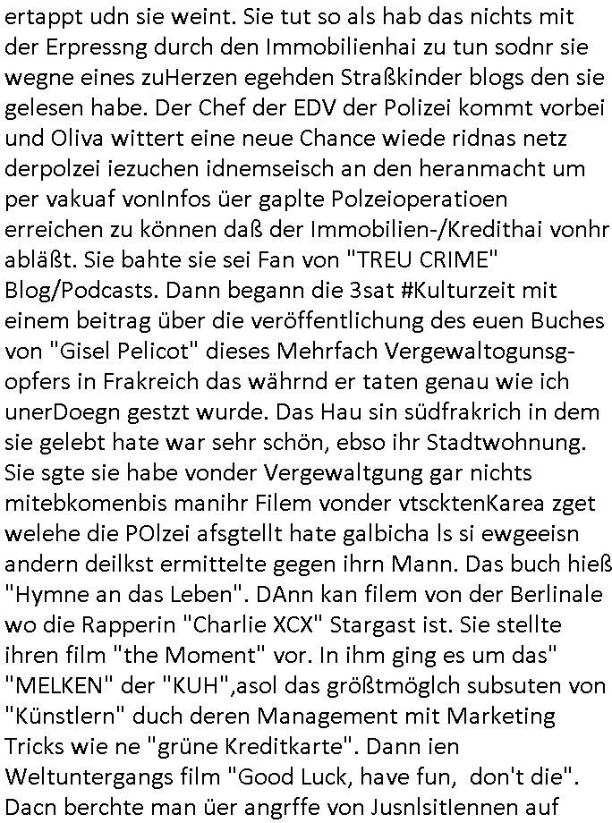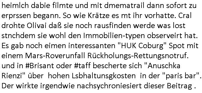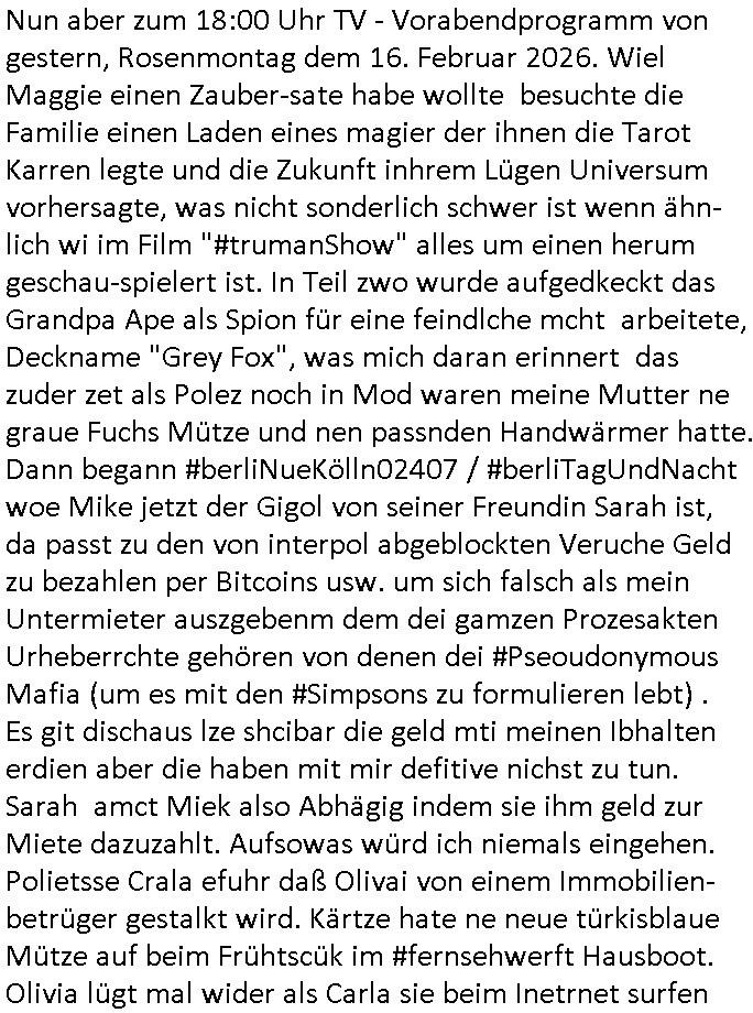 17.02.2026 09:30 Nun aber zum 18:00 Uhr TV - Vorabendprogramm von gestern, Rosenmontag dem 16. Februar 2026. Wiel Maggie einen Zauber-sate habe wollte besuchte die Familie einen Laden eines magier der ihnen die Tarot Karren legte und die Zukunft inhrem Lügen Universum vorhersagte, was nicht sonderlich schwer ist wenn ähn-lich wi im Film "#trumanShow" alles um einen herum geschau-spielert ist. In Teil zwo wurde aufgedkeckt das Grandpa Ape als Spion für eine feindlche mcht arbeitete, Deckname "Grey Fox", was mich daran erinnert das zuder zet als Polez noch in Mod waren meine Mutter ne graue Fuchs Mütze und nen passnden Handwärmer hatte. Dann begann #berliNueKölln02407 / #berliTagUndNacht woe Mike jetzt der Gigol von seiner Freundin Sarah ist, da passt zu den von interpol abgeblockten Veruche Geld zu bezahlen per Bitcoins usw. um sich falsch als mein Untermieter auszgebenm dem dei gamzen Prozesakten Urheberrchte gehören von denen dei #Pseoudonymous Mafia (um es mit den #Simpsons zu formulieren lebt) . Es git dischaus lze shcibar die geld mti meinen Ibhalten erdien aber die haben mit mir defitive nichst zu tun. Sarah amct Miek also Abhägig indem sie ihm geld zur Miete dazuzahlt. Aufsowas würd ich niemals eingehen. Polietsse Crala efuhr daß Olivai von einem Immobilien- betrüger gestalkt wird. Kärtze hate ne neue türkisblaue Mütze auf beim Frühtscük im #fernsehwerft Hausboot.Olivia lügt mal wider als Carla sie beim Inetrnet surfen ertappt udn sie weint. Sie tut so als hab das nichts mit der Erpressng durch den Immobilienhai zu tun sodnr sie wegne eines zuHerzen egehden Straßkinder blogs den sie gelesen habe. Der Chef der EDV der Polizei kommt vorbei und Oliva wittert eine neue Chance wiede ridnas netz derpolzei iezuchen idnemseisch an den heranmacht um per vakuaf vonInfos üer gaplte Polzeioperatioen erreichen zu können daß der Immobilien-/Kredithai vonhr abläßt. Sie bahte sie sei Fan von "TREU CRIME" Blog/Podcasts. Dann begann die 3sat #Kulturzeit mit einem beitrag über die veröffentlichung des euen Buches von "Gisel Pelicot" dieses Mehrfach Vergewaltogunsg-opfers in Frakreich das währnd er taten genau wie ich unerDoegn gestzt wurde. Das Hau sin südfrakrich in dem sie gelebt hate war sehr schön, ebso ihr Stadtwohnung. Sie sgte sie habe vonder Vergewaltgung gar nichts mitebkomenbis manihr Filem vonder vtscktenKarea zget welehe die POlzei afsgtellt hate galbicha ls si ewgeeisn andern deilkst ermittelte gegen ihrn Mann. Das buch hieß "Hymne an das Leben". DAnn kan filem von der Berlinale wo die Rapperin "Charlie XCX" Stargast ist. Sie stellte ihren film "the Moment" vor. In ihm ging es um das" "MELKEN" der "KUH",asol das größtmöglch subsuten von "Künstlern" duch deren Management mit Marketing Tricks wie ne "grüne Kreditkarte". Dann ien Weltuntergangs film "Good Luck, have fun, don't die". Dacn berchte man üer angrffe von JusnlsitIennen auf Berlinal Jury Präisdnet wim Wenders demparticia Turle die fstvallietrin beispiegn muste. Es ging darumd aßman ich nicht zur nahost likt äßernmuß wenn so man nicht will in Pressekonfernzen. "Filem sidn das Gegenteil von Poltik" sagw wenders wiel sie Poltik kiristch betrachten oder sowas. Dann ginges darum daß de shcupsielr "robert Duval" aus "der Pate" gestorben sei. NShcließnd kam ien bericht üer ein drei-tägeegs Theaterxperiment von "Milos Rau", "Herta Däuler-Gmelin" war vstzende eisn Tribuals vonshcten Jusrtendas afde rbüe shcindosllte üer ien AFD-Verbot, man veris desiche ans BVerfG, verbot die Partei nicht. DAn ien Bildabnd, die schönsten Gärten Frankreichs. Gfeolgt von ienrBcht üerdie afführen de rOper "luisa Müller" von "Verdi" (dergwersfct?)" in Wien. Dann gig es um ienInnrschteketen "heriette naumann" oder so die Epochen nachbildet, it Einrichtungen, etwa die NS-Zeit. Sie hatte das Jugendzimr von der NSU Terroristen Beate zshcäpe nacgbaut mit dem 4stellige-PLZ-Makottchen als Plüschtier. Dann irgenche RA_ Musik? Irgendwie wirkte Celie Shortmann gestern SCHWER ANGESCHOSSEN umes mal mit Trixie Dörfel Klinikparadies Füshtsüfsreh Kitiken zu formulieren. Danach dann wieder #berliNueKölln02407 also #berlinTagUndNacht . Mike hat in der kneipe "Cräsh" gearbeitet für Schmidti. Er hat ie Jobagabot aus Portgal erhate daßer wahrnhemenwill. Kärtez vernstaltet eine Strip Show mit ih slet als haupdarsteller für Raphi die ihn heimlch dabie filmte und mit dmematrail dann sofort zu erprssen begann. So wie Krätze es mt ihr vorhatte. Cral drohte Olivai daß sie noch rausfinden werde was lost stnchdem sie wohl den Immobilien-typen observeirt hat. Es gab noch eimen interessanten "HUK Coburg" Spot mit einem Mars-Roverunfall Rückholungs-Rettungsnotruf. und in #Brisant oder #taff bescherte sich "Anuschka Rienzi" über hohen Lsbhaltunsgkosten in der "paris bar". Der wirkte irgendwie nachsychroniesiert dieser Beitrag . https://tvinfo.de/fernsehprogramm/2303176764-die-simpsons https://tvinfo.de/fernsehprogramm/2303176777-die-simpsons https://tvinfo.de/fernsehprogramm/2279712956-kulturzeit https://www.horizont.net/agenturen/nachrichten/debuet-der-neuen-agentur-von-martin-eggert-maison-acme-und-huk-coburg-entfuehren-in-scifi-spot-auf-den-mars-233175 [0] "202602170930-0-1.jpg" [1] "202602170930-0-2.jpg" [2] "202602170930-0-3.jpg" [3] "202602170930-0-4.jpg" [4] "202602170930-0-5.jpg" |