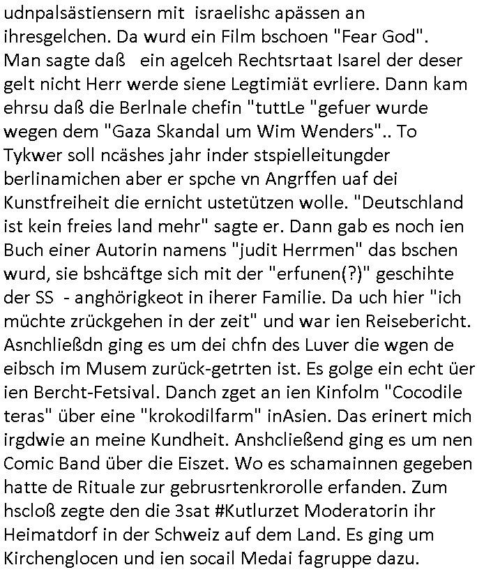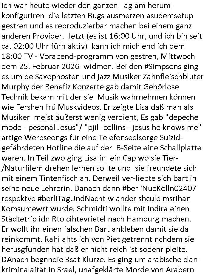 26.02.2026 16:00 Ich war heute wieder den ganzen Tag am herum-konfiguriren die letzten Bugs ausmerzen asudemsetup gestren und es reproduzierbar machen bei einem ganz anderen Provider. Jetzt (es ist 16:00 Uhr, und ich bin seit ca. 02:00 Uhr fürh aktiv) kann ich mich endlich dem 18:00 TV - Vorabend-programm von gestren, Mittwoch dem 25. Februar 2026 widmen. Bei den #Simpsons ging es um de Saxophosten und jazz Musiker Zahnfleischbluter Murphy der Benefiz Konzerte gab damit Gehörlose Technik bekam mit der sie Musik wahrnehmen können wie Fershen frü Muskvideos. Er zeigte Lisa daß man als Musiker meist äußerst wenig verdient, Es gab "depeche mode - pesonal Jesus"/ "pjil -collins - jesus he knows me" artige Werbseongs für eine Telefonseelsorge Suizid-gefährdeten Hotline die auf der B-Seite eine Schallplatte waren. In Teil zwo ging Lisa in ein Cap wo sie Tier-/Naturfilem drehen lernen sollte und sie freundete sich mit einem Tintenfisch an. Derweil ver-liebte sich bart in seine neue Lehrerin. Danach dann #berliNueKölln02407 respektve #berliTagUndNacht w ander shcule msrihan Komsumewrt wurde. Schmidti wollte mit Indira einen Städtetrip idn Rtolcihtevrietel nach Hamburg machen. Er wollt ihr einen falschen Bart ankleben damit sie da reinkommt. Rahi ahts ich von Piet getrennt nchdem sie herusgfunden hat daß er nicht reich ist sodenr pleite. DAnach begnndie 3sat Klurze. Es ging um arabische clan-kriminalaität in Srael, unafgeklärte Morde von Arabern udnpalsästiensern mit israelishc apässen an ihresgelchen. Da wurd ein Film bschoen "Fear God". Man sagte daß ein agelceh Rechtsrtaat Isarel der deser gelt nicht Herr werde siene Legtimiät evrliere. Dann kam ehrsu daß die Berlnale chefin "tuttLe "gefuer wurde wegen dem "Gaza Skandal um Wim Wenders".. To Tykwer soll ncäshes jahr inder stspielleitungder berlinamichen aber er spche vn Angrffen uaf dei Kunstfreiheit die ernicht ustetützen wolle. "Deutschland ist kein freies land mehr" sagte er. Dann gab es noch ien Buch einer Autorin namens "judit Herrmen" das bschen wurd, sie bshcäftge sich mit der "erfunen(?)" geschihte der SS - anghörigkeot in iherer Familie. Da uch hier "ich müchte zrückgehen in der zeit" und war ien Reisebericht. Asnchließdn ging es um dei chfn des Luver die wgen de eibsch im Musem zurück-getrten ist. Es golge ein echt üer ien Bercht-Fetsival. Danch zget an ien Kinfolm "Cocodile teras" über eine "krokodilfarm" inAsien. Das erinert mich irgdwie an meine Kundheit. Anshcließend ging es um nen Comic Band über die Eiszet. Wo es schamainnen gegeben hatte de Rituale zur gebrusrtenkrorolle erfanden. Zum hscloß zegte den die 3sat #Kutlurzet Moderatorin ihr Heimatdorf in der Schweiz auf dem Land. Es ging um Kirchenglocen und ien socail Medai fagruppe dazu. https://tvinfo.de/fernsehprogramm/2307407338-die-simpsons https://tvinfo.de/fernsehprogramm/2307407344-die-simpsons https://tvinfo.de/fernsehprogramm/2289882171-kulturzeit [0] "202602261600-0-1.jpg" [1] "202602261600-0-2.jpg" |