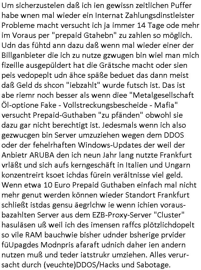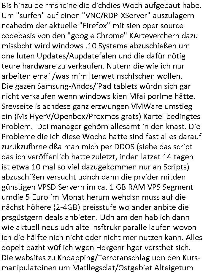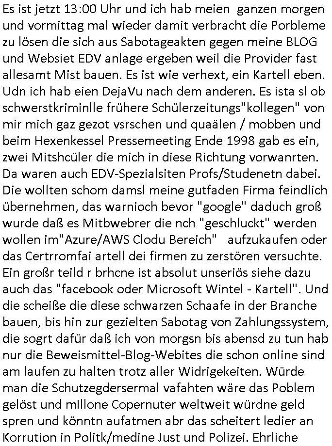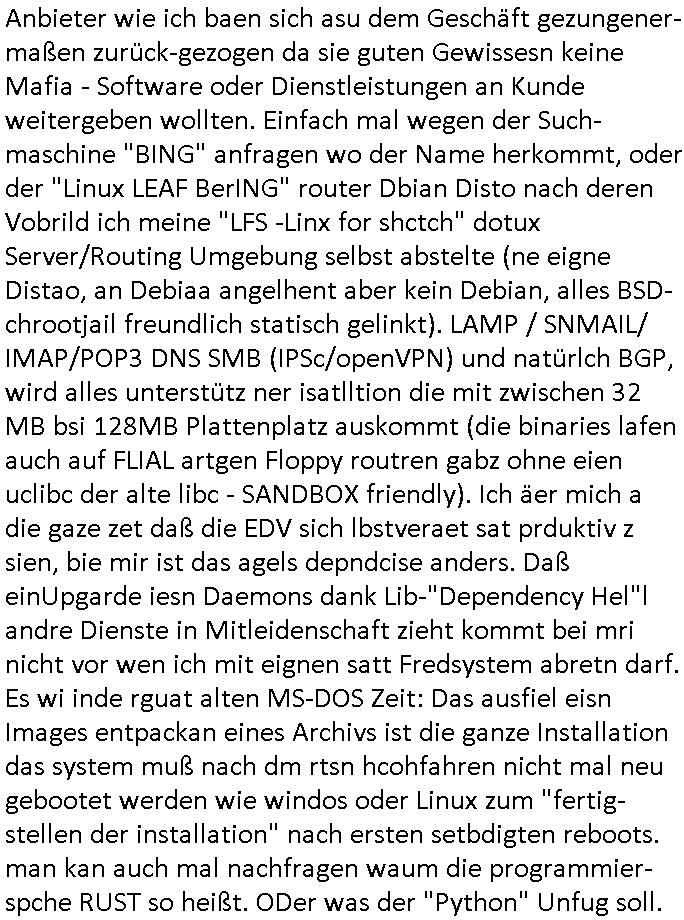 27.02.2026 13:00 Es ist jetzt 13:00 Uhr und ich hab meien ganzen morgen und vormittag mal wieder damit verbracht die Porbleme zu lösen die sich aus Sabotageakten gegen meine BLOG und Websiet EDV anlage ergeben weil die Provider fast allesamt Mist bauen. Es ist wie verhext, ein Kartell eben. Udn ich hab eien DejaVu nach dem anderen. Es ista sl ob schwerstkriminlle frühere Schülerzeitungs"kollegen" von mir mich gaz gezot vsrschen und quaälen / mobben und beim Hexenkessel Pressemeeting Ende 1998 gab es ein, zwei Mitshcüler die mich in diese Richtung vorwanrten. Da waren auch EDV-Spezialsiten Profs/Studenetn dabei. Die wollten schom damsl meine gutfaden Firma feindlich übernehmen, das warnioch bevor "google" daduch groß wurde daß es Mitbwebrer die nch "geschluckt" werden wollen im"Azure/AWS Clodu Bereich" aufzukaufen oder das Certrromfai artell dei firmen zu zerstören versuchte. Ein großr teild r brhcne ist absolut unseriös siehe dazu auch das "facebook oder Microsoft Wintel - Kartell". Und die scheiße die diese schwarzen Schaafe in der Branche bauen, bis hin zur gezielten Sabotag von Zahlungssystem, die sogrt dafür daß ich von morgsn bis abensd zu tun hab nur die Beweismittel-Blog-Webites die schon online sind am laufen zu halten trotz aller Widrigekeiten. Würde man die Schutzegdersermal vafahten wäre das Poblem gelöst und mIllone Copernuter weltweit würdne geld spren und könntn aufatmen abr das scheitert ledier an Korrution in Politk/medine Just und Polizei. Ehrliche Anbieter wie ich baen sich asu dem Geschäft gezungener-maßen zurück-gezogen da sie guten Gewissesn keine Mafia - Software oder Dienstleistungen an Kunde weitergeben wollten. Einfach mal wegen der Such-maschine "BING" anfragen wo der Name herkommt, oder der "Linux LEAF BerING" router Dbian Disto nach deren Vobrild ich meine "LFS -Linx for shctch" dotux Server/Routing Umgebung selbst abstelte (ne eigne Distao, an Debiaa angelhent aber kein Debian, alles BSD-chrootjail freundlich statisch gelinkt). LAMP / SNMAIL/ IMAP/POP3 DNS SMB (IPSc/openVPN) und natürlch BGP, wird alles unterstütz ner isatlltion die mit zwischen 32 MB bsi 128MB Plattenplatz auskommt (die binaries lafen auch auf FLIAL artgen Floppy routren gabz ohne eien uclibc der alte libc - SANDBOX friendly). Ich äer mich a die gaze zet daß die EDV sich lbstveraet sat prduktiv z sien, bie mir ist das agels depndcise anders. Daß einUpgarde iesn Daemons dank Lib-"Dependency Hel"l andre Dienste in Mitleidenschaft zieht kommt bei mri nicht vor wen ich mit eignen satt Fredsystem abretn darf. Es wi inde rguat alten MS-DOS Zeit: Das ausfiel eisn Images entpackan eines Archivs ist die ganze Installation das system muß nach dm rtsn hcohfahren nicht mal neu gebootet werden wie windos oder Linux zum "fertig-stellen der installation" nach ersten setbdigten reboots.man kan auch mal nachfragen waum die programmier-spche RUST so heißt. ODer was der "Python" Unfug soll. https://sourceforge.net/projects/leaf/ [0] "202602271300-0-1.jpg" [1] "202602271300-0-2.jpg" |