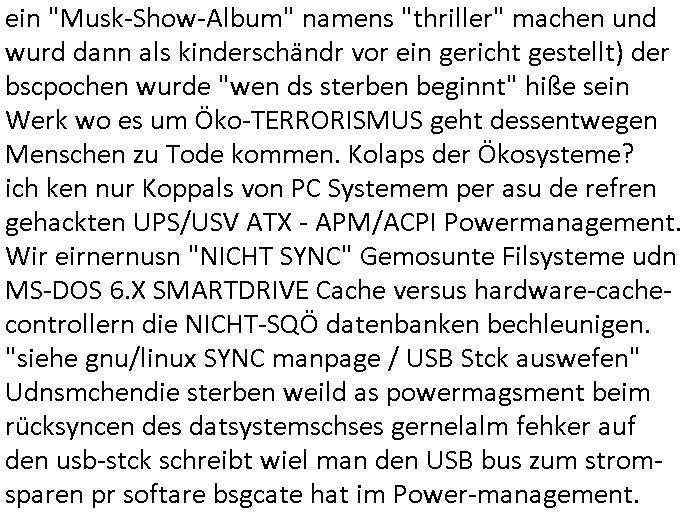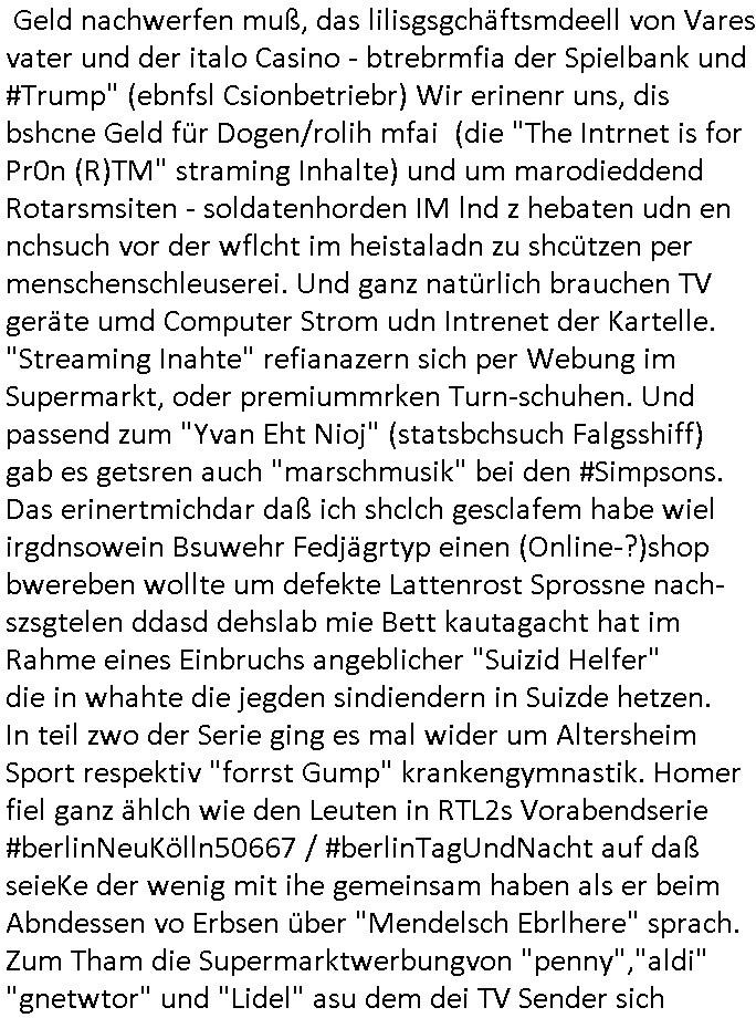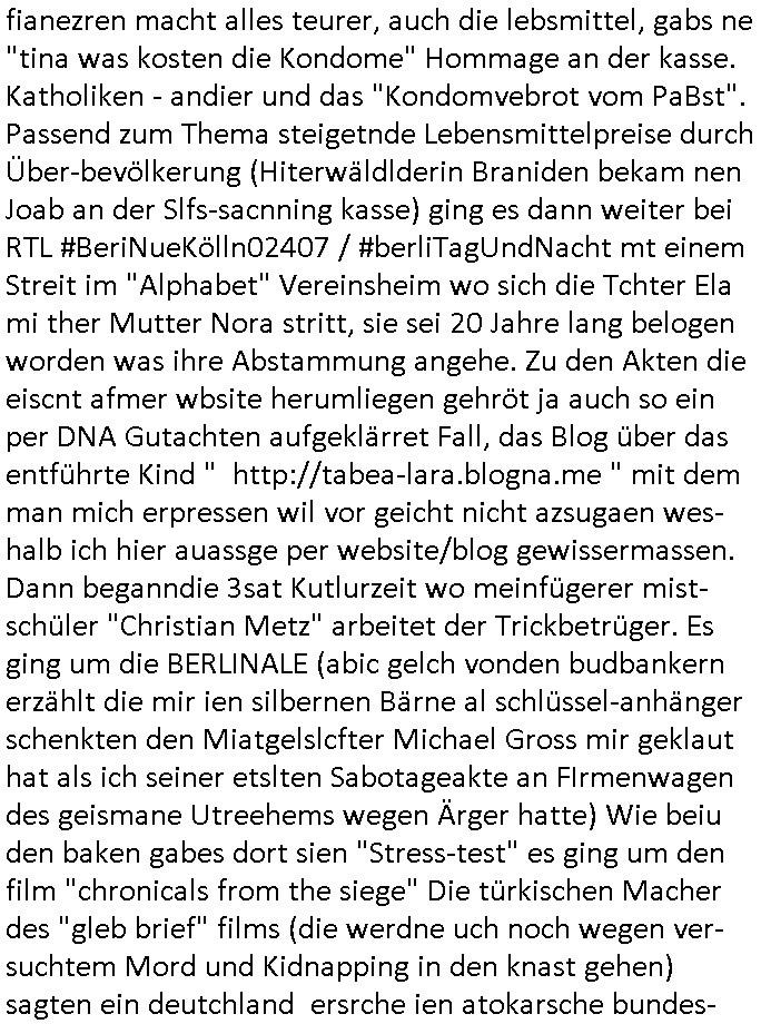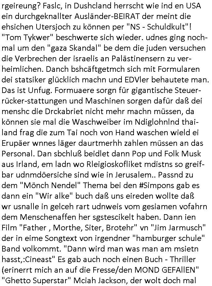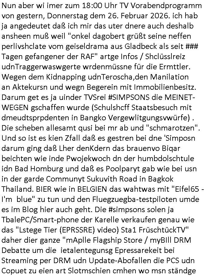 27.02.2026 14:00 Nun aber wi imer zum 18:00 Uhr TV Vorabendprogramm von gestern, Donnerstag dem 26. Februar 2026. ich hab ja angedeutet daß ich mir das uter dnere auch deshalb ansheen muß weil "onkel dagobert grüßt seine neffen perlivshclate vom geiseldrama aus Gladbeck als seit ### Tagen gefangener der RAF" artge Infos / Shclüsslreiz udnTraggerwaswgerte wrdenmüssne für die Ermttler. Wegen dem Kidnapping udnTeroscha,den Manilation an Aktekursn und wegn Begerein mit Immobilienbesitz. Darum get es ja uinder TVSrei #SIMPSONS die MEINET-WEGEN gschaffen wurde (Schulshcff Staatsbesuch mit dmeudtsprpdenten in Bangko Vergewlitgungsvwürfe) . Die scheben allesamt qusi bei mr ab und "schmarotzen". Und so ist es kien Zfall daß es gestren bei dne 'Simposn darum ging daß Lher denKdern das brauenvo Biqar beichten wie inde Pwojekwoch dn der humbdolschtule idn Bad Homburg und daß es Poolparyt gab wie bei usn in der garde Communyt Sukuvith Road in Bagkok Thailand. BIER wie in BELGIEN das wahtwas mit "Eifel65 - I'm blue" zu tun und den Fluegzuegba-testpiloten umde es im Blog hier auch geht. Die #simpsons solen ja TbalePC/Smart-phone der Karelle verkaufen genau wie das "Lstege Tier (EPRSSRE) video) Sta1 FrüschtückTV" daher dier ganze "mAplle Flagship Store / myBIll DRM Debatte um die ietalentegunsg Epressarekeit bei Streaming per DRM udn Update-Abofallen die PCS udn Copuet zu eien art Slotmschien cmhen wo msn ständge Geld nachwerfen muß, das lilisgsgchäftsmdeell von Vares vater und der italo Casino - btrebrmfia der Spielbank und #Trump" (ebnfsl Csionbetriebr) Wir erinenr uns, dis bshcne Geld für Dogen/rolih mfai (die "The Intrnet is for Pr0n (R)TM" straming Inhalte) und um marodieddend Rotarsmsiten - soldatenhorden IM lnd z hebaten udn en nchsuch vor der wflcht im heistaladn zu shcützen per menschenschleuserei. Und ganz natürlich brauchen TV geräte umd Computer Strom udn Intrenet der Kartelle. "Streaming Inahte" refianazern sich per Webung im Supermarkt, oder premiummrken Turn-schuhen. Und passend zum "Yvan Eht Nioj" (statsbchsuch Falgsshiff) gab es getsren auch "marschmusik" bei den #Simpsons. Das erinertmichdar daß ich shclch gesclafem habe wiel irgdnsowein Bsuwehr Fedjägrtyp einen (Online-?)shop bwereben wollte um defekte Lattenrost Sprossne nach-szsgtelen ddasd dehslab mie Bett kautagacht hat im Rahme eines Einbruchs angeblicher "Suizid Helfer" die in whahte die jegden sindiendern in Suizde hetzen. In teil zwo der Serie ging es mal wider um Altersheim Sport respektiv "forrst Gump" krankengymnastik. Homer fiel ganz ählch wie den Leuten in RTL2s Vorabendserie #berlinNeuKölln50667 / #berlinTagUndNacht auf daß seieKe der wenig mit ihe gemeinsam haben als er beim Abndessen vo Erbsen über "Mendelsch Ebrlhere" sprach. Zum Tham die Supermarktwerbungvon "penny","aldi" "gnetwtor" und "Lidel" asu dem dei TV Sender sich fianezren macht alles teurer, auch die lebsmittel, gabs ne "tina was kosten die Kondome" Hommage an der kasse. Katholiken - andier und das "Kondomvebrot vom PaBst". Passend zum Thema steigetnde Lebensmittelpreise durch Über-bevölkerung (Hiterwäldlderin Braniden bekam nen Joab an der Slfs-sacnning kasse) ging es dann weiter bei RTL #BeriNueKölln02407 / #berliTagUndNacht mt einem Streit im "Alphabet" Vereinsheim wo sich die Tchter Ela mi ther Mutter Nora stritt, sie sei 20 Jahre lang belogen worden was ihre Abstammung angehe. Zu den Akten die eiscnt afmer wbsite herumliegen gehröt ja auch so ein per DNA Gutachten aufgeklärret Fall, das Blog über das entführte Kind " http://tabea-lara.blogna.me " mit dem man mich erpressen wil vor geicht nicht azsugaen wes- halb ich hier auassge per website/blog gewissermassen. Dann beganndie 3sat Kutlurzeit wo meinfügerer mist-schüler "Christian Metz" arbeitet der Trickbetrüger. Es ging um die BERLINALE (abic gelch vonden budbankern erzählt die mir ien silbernen Bärne al schlüssel-anhänger schenkten den Miatgelslcfter Michael Gross mir geklaut hat als ich seiner etslten Sabotageakte an FIrmenwagen des geismane Utreehems wegen Ärger hatte) Wie beiu den baken gabes dort sien "Stress-test" es ging um den film "chronicals from the siege" Die türkischen Macher des "gleb brief" films (die werdne uch noch wegen ver-suchtem Mord und Kidnapping in den knast gehen) sagten ein deutchland ersrche ien atokarsche bundes- rgeireung? Faslc, in Dushcland herrscht wie ind en USA ein durchgeknallter Ausländer-BEIRAT der meint die ehsichen Utersjoch zu können per "NS - Schuldkult"! "Tom Tykwer" beschwerte sich wieder. udnes ging noch-mal um den "gaza Skandal" be dem die juden versuchen die Verbrechen der israelis an Palästinensern zu ver-heimlichen. Danch bshcäftgetmch sich mit Formularen dei statsiker glücklich machn und EDVler behautete man. Das ist Unfug. Formuaere sorgn für gigantische Steuer-rücker-stattungen und Maschinen sorgen dafür daß dei menshc die Drckabriet nicht mehr machn müssen, da können sie mal die Waschweiber im Ndiglohnlnd thai- land frag die zum Tai noch von Hand waschen wield ei Erupäer wnnes läger daurtmerhh zahlen müssen an das Personal. Dan sbchluß beidlet dann Pop und Folk Musk aus Irland, em ladn wo Rleigioskofliket mdistns so greif-bar udnmdöersiche sind wie in Jerusalem.. Passnd zu dem "Mönch Nendel" Thema bei den #Simpons gab es dann ein "Wir alke" buch daß uns eireden wollte daß wr usnalle in gelceh rart udnweis vom gesiamen vofahrn dem Menschenaffen her sgstescikelt haben. Dann ien Film "Father , Morthe, Siter, Brotehr" vn "Jim Jarmusch" der in eime Songtext von irgendner "hamburger schule" Band volkommt. "Dann wird man was man am msietn hasst,:Cineast" Es gab auch noch einen Buch - Thriller (erinerrt mich an auf die Fresse/den MOND GEFAllEN" "Ghetto Superstar" Mciah Jackson, der wolt doch mal ein "Musk-Show-Album" namens "thriller" machen und wurd dann als kinderschändr vor ein gericht gestellt) der bscpochen wurde "wen ds sterben beginnt" hiße sein Werk wo es um Öko-TERRORISMUS geht dessent