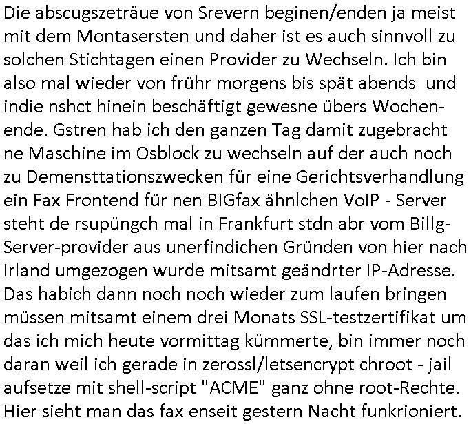 Die abscugszeträue von Srevern beginen/enden ja meist mit dem Montasersten und daher ist es auch sinnvoll zu solchen Stichtagen einen Provider zu Wechseln. Ich bin also mal wieder von frühr morgens bis spät abends und indie nshct hinein beschäftigt gewesne übers Wochen- ende. Gstren hab ich den ganzen Tag damit zugebracht ne Maschine im Osblock zu wechseln auf der auch noch zu Demensttationszwecken für eine Gerichtsverhandlung ein Fax Frontend für nen BIGfax ähnlchen VoIP - Server steht de rsupüngch mal in Frankfurt stdn abr vom Billg-Server-provider aus unerfindichen Gründen von hier nach Irland umgezogen wurde mitsamt geändrter IP-Adresse. Das habich dann noch noch wieder zum laufen bringen müssen mitsamt einem drei Monats SSL-testzertifikat um das ich mich heute vormittag kümmerte, bin immer noch daran weil ich gerade in zerossl/letsencrypt chroot - jail aufsetze mit shell-script "ACME" ganz ohne root-Rechte. Hier sieht man das fax enseit gestern Nacht funkrioniert.