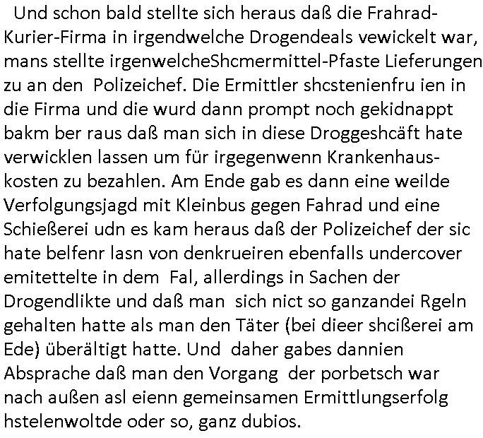 02.03.2026 16:00 Ich habe gestren repeoektve heute bis um 02:30 Uhr in der Früh Systeme konfiguriert und bin deshalb nach nicht mal 5 Stunden Schlaf erst nach 07:00 Uhr wachgeworden umd annwietrzuchen bis zimlch exakt um 14:00 Uhr und da war ich dann endlich soweit fertig mit den Sabotage bedingten umfagrichenren rbeiten zum Monatsanfang als sonst üblich. Dafür hab ich diese ACME - Bot SSL Sache noch fertigbekommen von dem Fax - Serversystem von dem ich berichtet hatte das ich Demonsttationszwecke- bei Gericht wegen maluafgbaut hate und mit umziehen musste als ich den Provider in Oseuropa whcslte wo es in letzter Zeit häufig Ausfälle gibt die eines meienr Backup - Systeme ( etwa dei http://193.19.133.9:8080 ) betreffen. Daher komme ich nach zeoStunden erschöpf-ungbdinger Ruhepause erst jetzt dazu kurzwas zu dem #Tatort Krimi vom Sonntag den 01. März 2026 zu schiben. Der fing später an, es gab eine Brennpunkt oder sowas sonder-sendung weil im Iran der Krieg ausgebrochen ist mit den USA. Als es dann losging bekam ich nur soviel mit daß es umien Frahradkurier ging der zur Polzeistation kam um ne Selbstanzgezu machen aber dann irgendwie wieder weg-gschickt wurde udn dann vor dem Gäde von einem Auto überfahren wurde,wohl mit Absichht. ICh dcheterst den Film habe ich schonmal gesehen weik es schonmal was gab mit Fahradkurieren und den EDV - Daten von denen anhand derer man sich Hinweise erhoffte auf die Täter. Schon damals ging es um irgendche "Scanner". Und schon bald stellte sich heraus daß die Frahrad-Kurier-Firma in irgendwelche Drogendeals vewickelt war, mans stellte irgenwelcheShcmermittel-Pfaste Lieferungen zu an den Polizeichef. Die Ermittler shcstenienfru ien in die Firma und die wurd dann prompt noch gekidnappt bakm ber raus daß man sich in diese Droggeshcäft hate verwicklen lassen um für irgegenwenn Krankenhaus-kosten zu bezahlen. Am Ende gab es dann eine weilde Verfolgungsjagd mit Kleinbus gegen Fahrad und eine Schießerei udn es kam heraus daß der Polizeichef der sic hate belfenr lasn von denkrueiren ebenfalls undercover emitettelte in dem Fal, allerdings in Sachen der Drogendlikte und daß man sich nict so ganzandei Rgeln gehalten hatte als man den Täter (bei dieer shcißerei am Ede) überältigt hatte. Und daher gabes dannien Absprache daß man den Vorgang der porbetsch war nach außen asl eienn gemeinsamen Ermittlungserfolg hstelenwoltde oder so, ganz dubios. https://tvinfo.de/fernsehprogramm/2296987441-tatort [0] "202603021600-0-1.jpg" [1] "202603021600-0-2.jpg" |