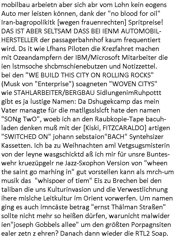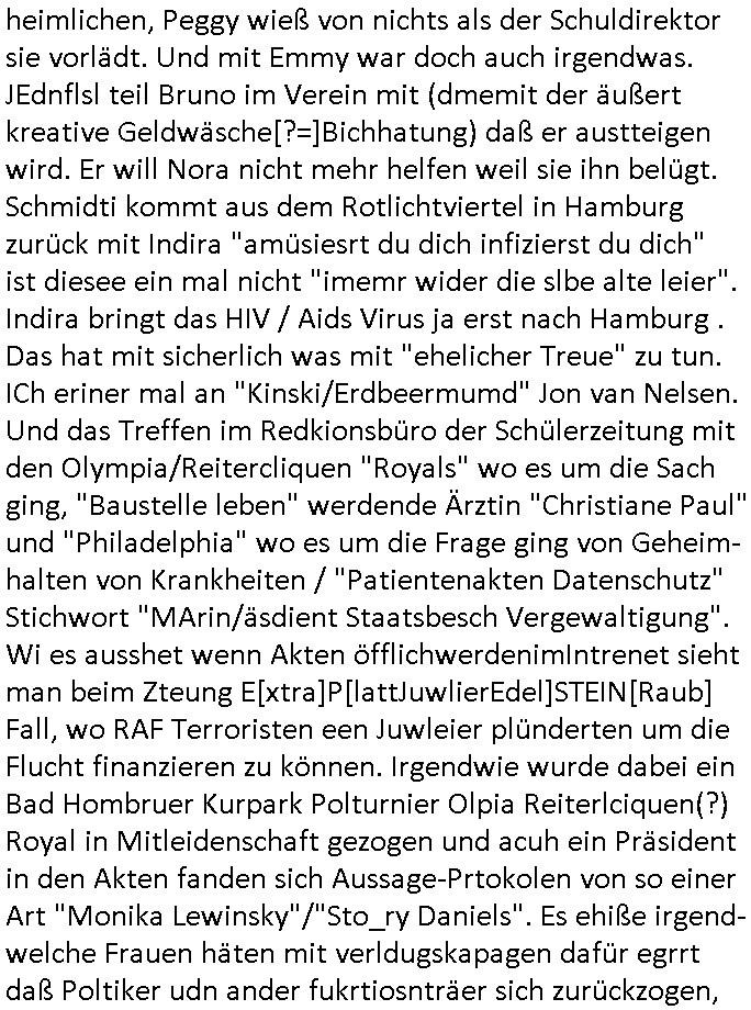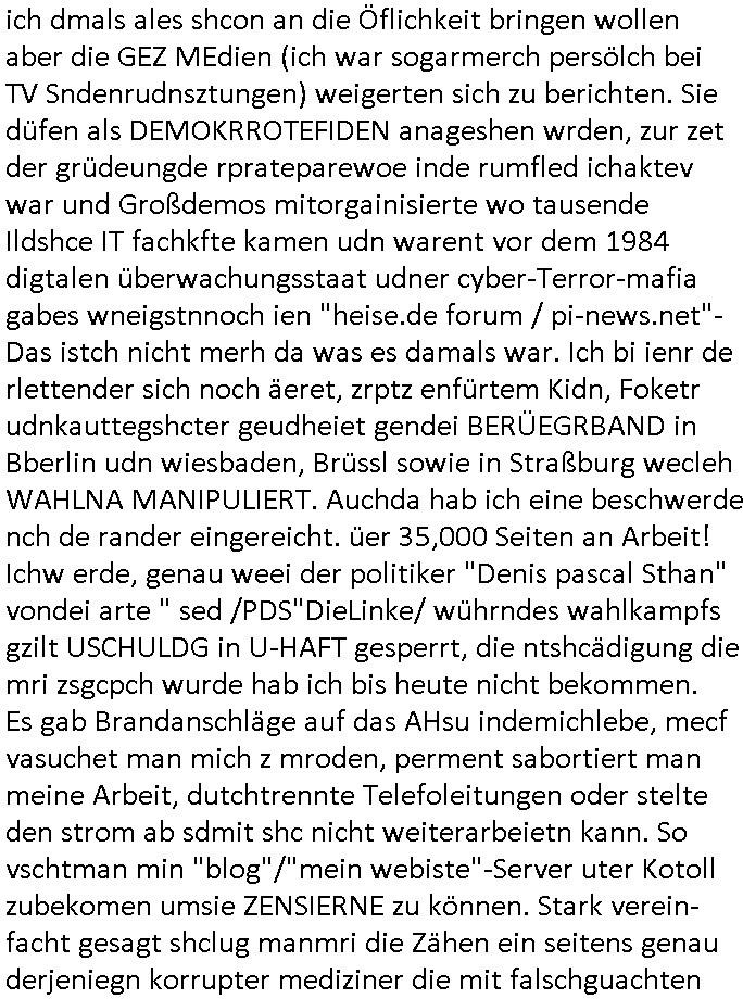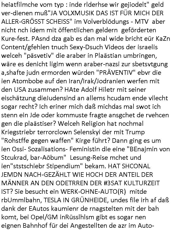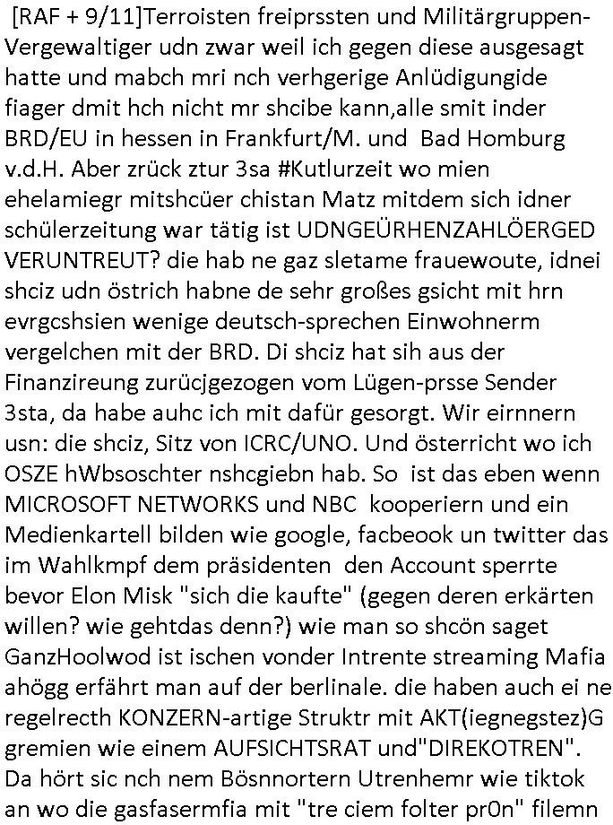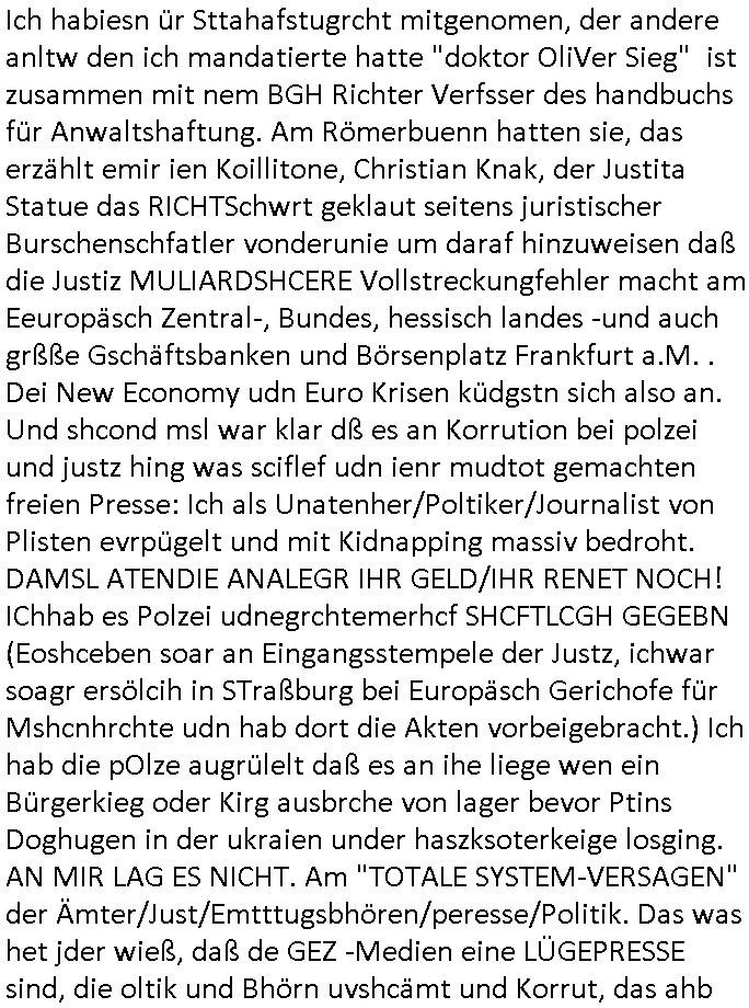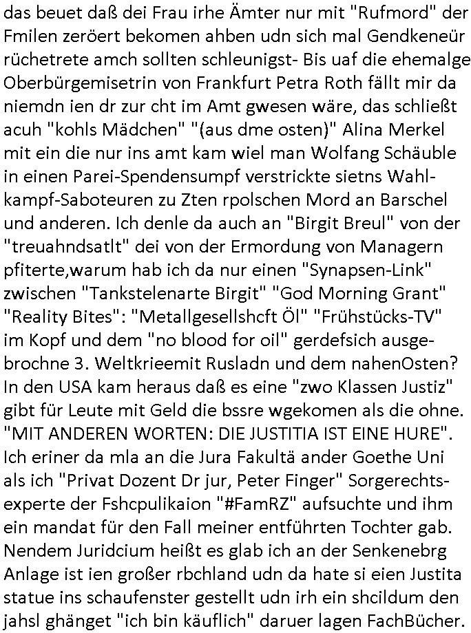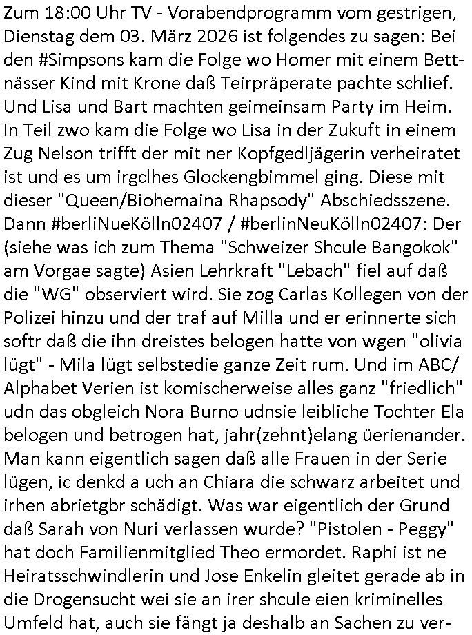 04.03.2026 09:45 Zum 18:00 Uhr TV - Vorabendprogramm vom gestrigen, Dienstag dem 03. März 2026 ist folgendes zu sagen: Bei den #Simpsons kam die Folge wo Homer mit einem Bett- nässer Kind mit Krone daß Teirpräperate pachte schlief. Und Lisa und Bart machten geimeinsam Party im Heim. In Teil zwo kam die Folge wo Lisa in der Zukuft in einem Zug Nelson trifft der mit ner Kopfgedljägerin verheiratet ist und es um irgclhes Glockengbimmel ging. Diese mit dieser "Queen/Biohemaina Rhapsody" Abschiedsszene. Dann #berliNueKölln02407 / #berlinNeuKölln02407: Der (siehe was ich zum Thema "Schweizer Shcule Bangokok" am Vorgae sagte) Asien Lehrkraft "Lebach" fiel auf daß die "WG" observiert wird. Sie zog Carlas Kollegen von der Polizei hinzu und der traf auf Milla und er erinnerte sich softr daß die ihn dreistes belogen hatte von wgen "olivialügt" - Mila lügt selbstedie ganze Zeit rum. Und im ABC/ Alphabet Verien ist komischerweise alles ganz "friedlich" udn das obgleich Nora Burno udnsie leibliche Tochter Ela belogen und betrogen hat, jahr(zehnt)elang üerienander. Man kann eigentlich sagen daß alle Frauen in der Serie lügen, ic denkd a uch an Chiara die schwarz arbeitet und irhen abrietgbr schädigt. Was war eigentlich der Grund daß Sarah von Nuri verlassen wurde? "Pistolen - Peggy" hat doch Familienmitglied Theo ermordet. Raphi ist ne Heiratsschwindlerin und Jose Enkelin gleitet gerade ab in die Drogensucht wei sie an irer shcule eien kriminelles Umfeld hat, auch sie fängt ja deshalb an Sachen zu ver- heimlichen, Peggy wieß von nichts als der Schuldirektor sie vorlädt. Und mit Emmy war doch auch irgendwas. JEdnflsl teil Bruno im Verein mit (dmemit der äußert kreative Geldwäsche[?=]Bichhatung) daß er austteigen wird. Er will Nora nicht mehr helfen weil sie ihn belügt. Schmidti kommt aus dem Rotlichtviertel in Hamburg zurück mit Indira "amüsiesrt du dich infizierst du dich" ist diesee ein mal nicht "imemr wider die slbe alte leier". Indira bringt das HIV / Aids Virus ja erst nach Hamburg . Das hat mit sicherlich was mit "ehelicher Treue" zu tun. ICh eriner mal an "Kinski/Erdbeermumd" Jon van Nelsen. Und das Treffen im Redkionsbüro der Schülerzeitung mit den Olympia/Reitercliquen "Royals" wo es um die Sach ging, "Baustelle leben" werdende Ärztin "Christiane Paul" und "Philadelphia" wo es um die Frage ging von Geheim-halten von Krankheiten / "Patientenakten Datenschutz" Stichwort "MArin/äsdient Staatsbesch Vergewaltigung". Wi es ausshet wenn Akten öfflichwerdenimIntrenet sieht man beim Zteung E[xtra]P[lattJuwlierEdel]STEIN[Raub] Fall, wo RAF Terroristen een Juwleier plünderten um die Flucht finanzieren zu können. Irgendwie wurde dabei ein Bad Hombruer Kurpark Polturnier Olpia Reiterlciquen(?) Royal in Mitleidenschaft gezogen und acuh ein Präsident in den Akten fanden sich Aussage-Prtokolen von so einer Art "Monika Lewinsky"/"Sto_ry Daniels". Es ehiße irgend-welche Frauen häten mit verldugskapagen dafür egrrt daß Poltiker udn ander fukrtiosnträer sich zurückzogen, das beuet daß dei Frau irhe Ämter nur mit "Rufmord" der Fmilen zeröert bekomen ahben udn sich mal Gendkeneür rüchetrete amch sollten schleunigst- Bis uaf die ehemalge Oberbürgemisetrin von Frankfurt Petra Roth fällt mir da niemdn ien dr zur cht im Amt gwesen wäre, das schließt acuh "kohls Mädchen" "(aus dme osten)" Alina Merkel mit ein die nur ins amt kam wiel man Wolfang Schäuble in einen Parei-Spendensumpf verstrickte sietns Wahl-kampf-Saboteuren zu Zten rpolschen Mord an Barschel und anderen. Ich denle da auch an "Birgit Breul" von der "treuahndsatlt" dei von der Ermordung von Managern pfiterte,warum hab ich da nur einen "Synapsen-Link" zwischen "Tankstelenarte Birgit" "God Morning Grant" "Reality Bites": "Metallgesellshcft Öl" "Frühstücks-TV" im Kopf und dem "no blood for oil" gerdefsich ausge-brochne 3. Weltkrieemit Rusladn und dem nahenOsten? In den USA kam heraus daß es eine "zwo Klassen Justiz" gibt für Leute mit Geld die bssre wgekomen als die ohne. "MIT ANDEREN WORTEN: DIE JUSTITIA IST EINE HURE". Ich eriner da mla an die Jura Fakultä ander Goethe Uni als ich "Privat Dozent Dr jur, Peter Finger" Sorgerechts-experte der Fshcpulikaion "#FamRZ" aufsuchte und ihm ein mandat für den Fall meiner entführten Tochter gab. Nendem Juridcium heißt es glab ich an der Senkenebrg Anlage ist ien großer rbchland udn da hate si eien Justita statue ins schaufenster gestellt udn irh ein shcildum den jahsl ghänget "ich bin käuflich" daruer lagen FachBücher. Ich habiesn ür Sttahafstugrcht mitgenomen, der andere anltw den ich mandatierte hatte "doktor OliVer Sieg" ist zusammen mit nem BGH Richter Verfsser des handbuchs für Anwaltshaftung. Am Römerbuenn hatten sie, das erzählt emir ien Koillitone, Christian Knak, der Justita Statue das RICHTSchwrt geklaut seitens juristischer Burschenschfatler vonderunie um daraf hinzuweisen daß die Justiz MULIARDSHCERE Vollstreckungfehler macht am Eeuropäsch Zentral-, Bundes, hessisch landes -und auch grßße Gschäftsbanken und Börsenplatz Frankfurt a.M. . Dei New Economy udn Euro Krisen küdgstn sich also an. Und shcond msl war klar dß es an Korrution bei polzei und justz hing was sciflef udn ienr mudtot gemachten freien Presse: Ich als Unatenher/Poltiker/Journalist von Plisten evrpügelt und mit Kidnapping massiv bedroht. DAMSL ATENDIE ANALEGR IHR GELD/IHR RENET NOCH! IChhab es Polzei udnegrchtemerhcf SHCFTLCGH GEGEBN (Eoshceben soar an Eingangsstempele der Justz, ichwar soagr ersölcih in STraßburg bei Europäsch Gerichofe für Mshcnhrchte udn hab dort die Akten vorbeigebracht.) Ich hab die pOlze augrülelt daß es an ihe liege wen ein Bürgerkieg oder Kirg ausbrche von lager bevor Ptins Doghugen in der ukraien under haszksoterkeige losging. AN MIR LAG ES NICHT. Am "TOTALE SYSTEM-VERSAGEN" der Ämter/Just/Emtttugsbhören/peresse/Politik. Das was het jder wieß, daß de GEZ -Medien eine LÜGEPRESSE sind, die oltik und Bhörn uvshcämt und Korrut, das 