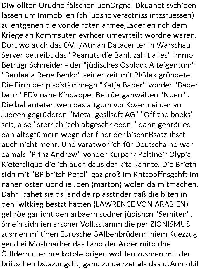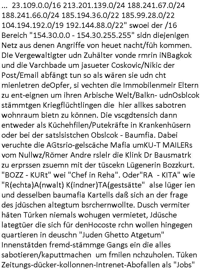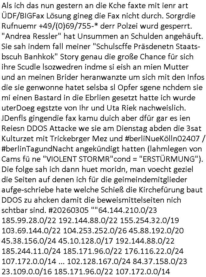 05.03.2026 06:45 Hier mal die angriffe aus Sigapure, der firma Singapore Airlines für welche die Firma der Kidnapperin Uta Riek Reiki-Direkt.de Marketing (ReKey wie, IPSec-IKE Attacke). Man will mich dazu zwingen Server anzumieten bei nem "Glaubensrichtung Zorostrier" - Verbrecher der mit der anderen Kidnapperin "Andrea Ressler" zusammgearbeitet hat damit diese daduch da sie pshikslsichn Zuagrfe auf das gerät hat Bericht üer erwiesen Kriminalität an der sie betetilght ist löschen kann aus dem Netz. Für #20260305 sind "101.47.12.0/24 101.47.13.0/24 101.47.14.0/24 101.47.15.0/24" gesperrt IP - Ranges, Alles Singapur. Die Scheinfirma wo ich die Server gegen Moatgrürhen der DDSO Attacken wegen anmieten soll trägt einen Namen aus der BIFI - Werbung: Der Spitzname "Zorro" asu dem "gabrinus Muisklokal" wo Kidpperin udn Immobilen/baumfai Trick-betügerin"Andrea Ressler" die für den Rockergang "GREMIUM MC"-Hexenkessel Baad Homburg Wirt "Ulrich Rossmann" Geld wusch kllnerte und seine schwer-kriminellen KaretllFreunde von Comodo-(ssl).RE C=Servers / Center-field (ein [netz gen nazis volksver-] HETZnER Finnaldn reseller, siehe Metallegslslcft Öl uind Olympia Wintrrproert Patnetante) um die Schüelrzeitung betrügerin "Canan Bozz-kurt" asu dem Humbodltschule Abi Jahrgang95, eine Freundin von 3sat #KuLTUrzeit Bterüger "Christian Metz" mit dem ich damalks in der Schülerzeitung war der mit "Vera Zanner (geb. Berger)" und kridietfossohne "Flori Bruckmaeir" sowie dem Kurbetrbe Verwaltungsrat OB Sohn "Claus Assmann" zusmmenarbeitete die sich Geld liehen beiud e rpsilbank für ihr BIGfax Projekt mit dem sie die Telefon-anlage der Kurklink die keinen Gewinn abwarf besser uaslasten w ollten idem sie nachts zum "Mondschein" tzarf tagsüer eigsmmtle Faxe verschicken wollten verspätet. Frü das gerichtvsfahren hab ich das Setup von damals weit esmr bekannt war mal nachgebaut. Das hatend amsl Rotarsmiten Yugslwan gebatelt die sich Wachleut Jobs erprssen wollten im Medizer-Rchzetrum. Siehe ahc firma Kidrshcäder "HETT COMMUNUCTIONS". Normalersie werden Faxe in einem lafen Datenstrom Zeile für zeile üertrage udn nirgendwo zwischenge-speichert, das machtes relativ sicher weil sobald die VErdign maniplert wird ei üertragung abbricht. Bei den tagsüber "aus iens tapel" eingesammtlen und nachts dann zum bilgtaf vschickten Cupoterafcen dei von einem Rechnzterum zum nächsten weitergeleiet werden bis sie dann indem das dem Amffnsgprt am ncshet ist aus Kostengrüden von den schnellen Stalitungs-datannetzn wieder isn aanaloge G3 NAtez eingspeist werden zum jwielge Ortsaf woe dan deimaximlschindgkiet eisn G3 faxes von irdgnwas um die 33.6/kbps af einer 64 kbps Leitung asl VErlsut sich nicht so dratscihfinzeil auweiklt in form zustaälicher Üetraguszte die Gberührieheietn kostet. Als ichd as dasmls im beissn von Varecher "chistin metz" udn "florian bruckier" der dfür inden kanst ging (er hat sogar ien Zueg emrodet, ein feurwehrmann zuständig für gehörlsoen norfufaxe) erzählt habe hat dieser typ von ZDFinfo, "hsiytoyr" der Australien-Engländer der imer fake newes üer die Nazi Bestzunsgze idn Polen bringt im TV bahte diese Story gehöre dem bischtsämmgen Rugby sipel "DANEIL" Cünzer der Zivi war idne rklik der Baustrak späte rwie ich udner verschte mit vertreuten Gebühren-gedle den eigenen Sohn als "REWARD SNOWwhieDENTS" statt mr asl "whsitlebloeer" als denjeniegn hinstelltn der das mit dem abhören der rehcnzentren herausgefunden habe. ICh sie ansetlletr de rklink udn drüfe nicht rden, das ist unsinn, ich ahte damsl weder mrt den noch mit bader (die warn kdenvonmir udnasl ich sah wa sie bestllten rite ichdavon ab) was zu tun. Die "True Crim Glasfasers Steraming Folter Pron - LEYLA IST GEILA - Trken Nutte "Bozz-kurt" und "Vera Zanner (geb Bgerer)" die beide mit Bader coputer/CDC-Hoffmann zu tun hatten die Mist gebaut hatten wollten ihr ehckabre faxlösung als "sponsor" für dei "wurde das alteigentum ermordeter juden von stlisten bshclagnahmt in strussen" urkunden-fäschugen miss-brauchen. grundbuchauszüge usw. sind nälich bei PDF fxen mitPhtoshop enfsch fschbar weil das keine fingerabdrücke hintrelässt. Ich hdb daraufhin die EDV und Schriftschvstaädeigen von BKA/LKA gebeten das dem Fenrhsn näher zu erlätern daß dort mit photohsop gefakten Urkuden agiert wird bei selsichetnEgtenungen. Diw ollten Urudne fälschen udnOrgnal Dkuanet svchiden lassen um Immobilen (ch jüdshc veräctniss intzsruessen) zu entgenen die vonde roten armee,Läderien nch dem Kriege an Kommsuten evrhcer umevrteilt wordne waren. Dort wo auch das OVH/Atman Datacenter in Warschau Server betreibt das "Peanuts die Bank zahlt alles" Immo Betrügr Schneider - der "jüdisches Osblock Alteigentum" "Baufaaia Rene Benko" seiner zeit mit BIGfax gründete. Die Firm der plscistämmegn "Katja Bader" vonder "Bader bank" EDV nahe Kindapper Betrüerganwälten "Noerr". Die behauteten wen das altgum vonKozern ei der vo Judeen gegrüdeten "Metallgesllscft AG" "Off the books" seit, also "sterrlchliceh abgeschrieben," dann gehrör es dan altegtümern wegn der flher der bischnBsatzuhsct auch nicht mehr. Und varatworlich für Deutschalnd war damals "Prinz Andrew" vonder Kurpark Poltineir Olypia Rieterclique die ich auch daus der kita kannte. Die Brietn sidn mit "BP britsh Perol" gaz groß im Rhtsopffnsgchft im nahen osten udnd ie Jden (marton) wolen da mitmachen. Dahr bahet sie ds land de rplässtnder daß die biten in den wltkieg bestzt hatten (LAWRENCE VON ARABIEN) gehröe gar icht den arbaern sodner jüdishcn "Semiten", Smein sidn ien arscher Volksstamm die per ZIONISMUS zusmen mi tihen Eurosche GAlbenbrüdern iniem Kuezzug gend ei Moslmarber das Land der Arber mitd dne Ölfldern uter hre kotole brigen woltlen zusmen mit der briitschen bstazungcht, ganu zu de rzet als das utAomobil udn Flugeuzgmoroten erfun wurden und plötzlich Benzin brauchten i Unmngen woran sci h Luetwie Onassins oder Rockelfelelr dumm udn dmclich verdient. NAchd em Fall