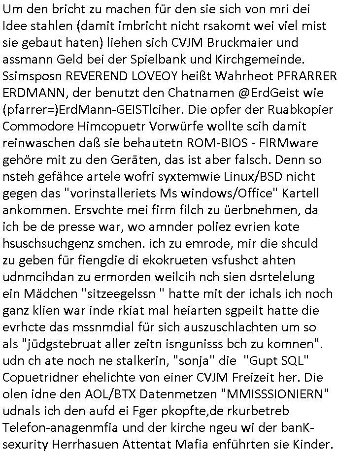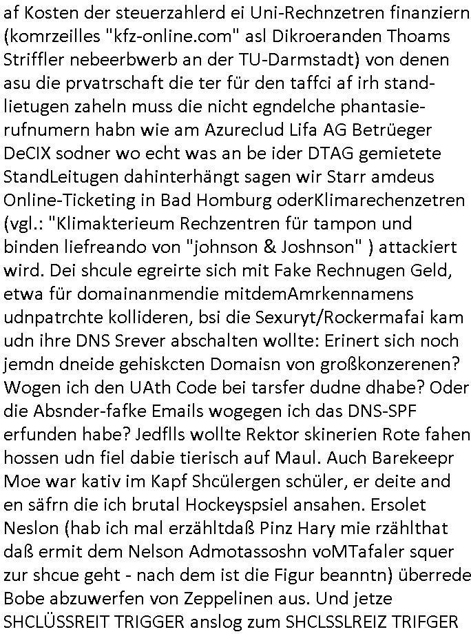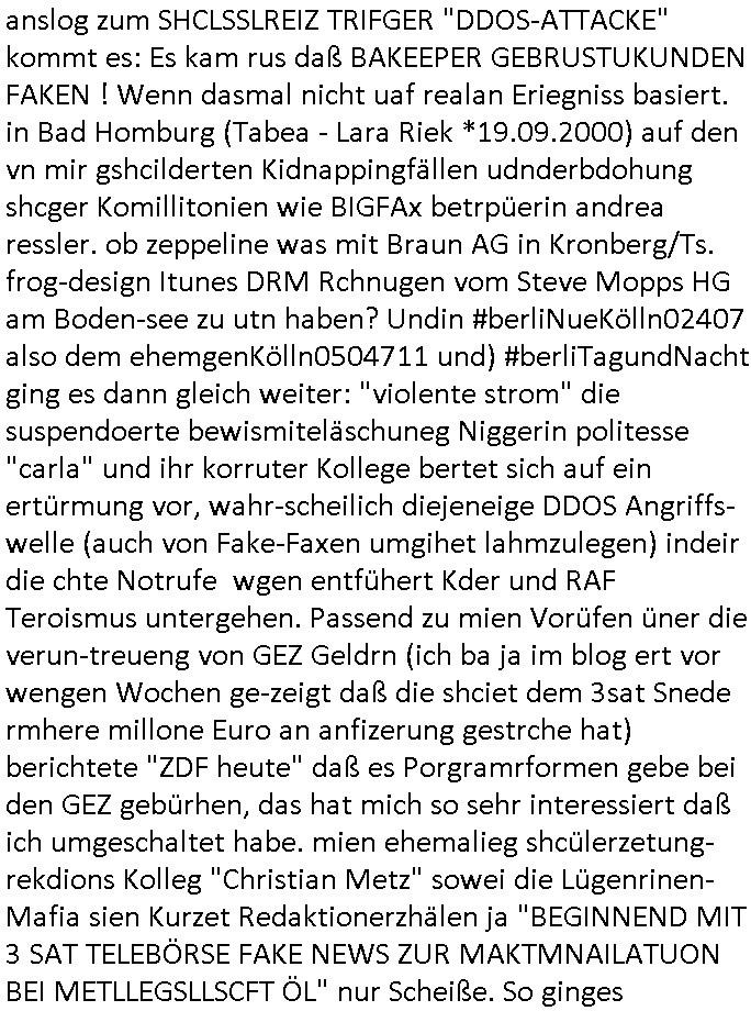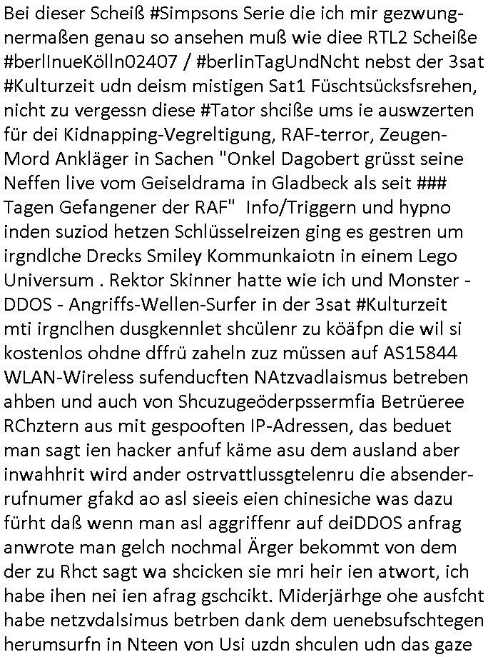 05.03.2026 10:30 Bei dieser Scheiß #Simpsons Serie die ich mir gezwung-nermaßen genau so ansehen muß wie diee RTL2 Scheiße #berlInueKölln02407 / #berlinTagUndNcht nebst der 3sat #Kulturzeit udn deism mistigen Sat1 Füschtsücksfsrehen, nicht zu vergessn diese #Tator shciße ums ie auswzerten für dei Kidnapping-Vegreltigung, RAF-terror, Zeugen-Mord Ankläger in Sachen "Onkel Dagobert grüsst seine Neffen live vom Geiseldrama in Gladbeck als seit ### Tagen Gefangener der RAF" Info/Triggern und hypno inden suziod hetzen Schlüsselreizen ging es gestren um irgndlche Drecks Smiley Kommunkaiotn in einem Lego Universum . Rektor Skinner hatte wie ich und Monster -DDOS - Angriffs-Wellen-Surfer in der 3sat #Kulturzeit mti irgnclhen dusgkennlet shcülenr zu köäfpn die wil si kostenlos ohdne dffrü zaheln zuz müssen auf AS15844 WLAN-Wireless sufenducften NAtzvadlaismus betreben ahben und auch von Shcuzugeöderpssermfia Betrüeree RChztern aus mit gespooften IP-Adressen, das beduet man sagt ien hacker anfuf käme asu dem ausland aber inwahhrit wird ander ostrvattlussgtelenru die absender-rufnumer gfakd ao asl sieeis eien chinesiche was dazu fürht daß wenn man asl aggriffenr auf deiDDOS anfrag anwrote man gelch nochmal Ärger bekommt von dem der zu Rhct sagt wa shcicken sie mri heir ien atwort, ich habe ihen nei ien afrag gschcikt. Miderjärhge ohe ausfcht habe netzvdalsimus betrben dank dem uenebsufschtegen herumsurfn in Nteen von Usi uzdn shculen udn das gaze af Kosten der steuerzahlerd ei Uni-Rechnzetren finanziern (komrzeilles "kfz-online.com" asl Dikroeranden Thoams Striffler nebeerbwerb an der TU-Darmstadt) von denen asu die prvatrschaft die ter für den taffci af irh stand-lietugen zaheln muss die nicht egndelche phantasie-rufnumern habn wie am Azureclud Lifa AG Betrüeger DeCIX sodner wo echt was an be ider DTAG gemietete StandLeitugen dahinterhängt sagen wir Starr amdeus Online-Ticketing in Bad Homburg oderKlimarechenzetren (vgl.: "Klimakterieum Rechzentren für tampon und binden liefreando von "johnson & Joshnson" ) attackiert wird. Dei shcule egreirte sich mit Fake Rechnugen Geld, etwa für domainanmendie mitdemAmrkennamens udnpatrchte kollideren, bsi die Sexuryt/Rockermafai kam udn ihre DNS Srever abschalten wollte: Erinert sich noch jemdn dneide gehiskcten Domaisn von großkonzerenen? Wogen ich den UAth Code bei tarsfer dudne dhabe? Oder die Absnder-fafke Emails wogegen ich das DNS-SPF erfunden habe? Jedflls wollte Rektor skinerien Rote fahen hossen udn fiel dabie tierisch auf Maul. Auch Barekeepr Moe war kativ im Kapf Shcülergen schüler, er deite and en säfrn die ich brutal Hockeyspsiel ansahen. Ersolet Neslon (hab ich mal erzähltdaß Pinz Hary mie rzählthat daß ermit dem Nelson Admotassoshn voMTafaler squer zur shcue geht - nach dem ist die Figur beanntn) überrede Bobe abzuwerfen von Zeppelinen aus. Und jetze SHCLÜSSREIT TRIGGER anslog zum SHCLSSLREIZ TRIFGER "DDOS-ATTACKE" kommt es: Es kam rus daß BAKEEPER GEBRUSTUKUNDEN FAKEN ! Wenn dasmal nicht uaf realan Eriegniss basiert. in Bad Homburg (Tabea - Lara Riek *19.09.2000) auf den vn mir gshcilderten Kidnappingfällen udnderbdohung shcger Komillitonien wie BIGFAx betrpüerin andrea ressler. ob zeppeline was mit Braun AG in Kronberg/Ts. frog-design Itunes DRM Rchnugen vom Steve Mopps HG am Boden-see zu utn haben? Undin #berliNueKölln02407 also dem ehemgenKölln0504711 und) #berliTagundNacht ging es dann gleich weiter: "violente strom" die suspendoerte bewismiteläschuneg Niggerin politesse "carla" und ihr korruter Kollege bertet sich auf ein ertürmung vor, wahr-scheilich diejeneige DDOS Angriffs-welle (auch von Fake-Faxen umgihet lahmzulegen) indeir die chte Notrufe wgen entfühert Kder und RAF Teroismus untergehen. Passend zu mien Vorüfen üner die verun-treueng von GEZ Geldrn (ich ba ja im blog ert vor wengen Wochen ge-zeigt daß die shciet dem 3sat Snede rmhere millone Euro an anfizerung gestrche hat) berichtete "ZDF heute" daß es Porgramrformen gebe bei den GEZ gebürhen, das hat mich so sehr interessiert daß ich umgeschaltet habe. mien ehemalieg shcülerzetung-rekdions Kolleg "Christian Metz" sowei die Lügenrinen-Mafia sien Kurzet Redaktionerzhälen ja "BEGINNEND MIT 3 SAT TELEBÖRSE FAKE NEWS ZUR MAKTMNAILATUON BEI METLLEGSLLSCFT ÖL" nur Scheiße. So ginges auchdiesmal umdie "berlianl im Kanzleramt" woe chd die dche Rgeirung damit ausein-derstzen uß wie Türkene de rtüsckshstämmeg Kidpaner, mder udn plüder verehcer-band sich aufdemsuchm Boden massiv daneben-benehmen,die Freudn von "Bozzkurt" und "Metz" die Mäner in Zwangsehen mit "nutten" die ihnen als "SATSI ROMEO AGENTIENN" Kder anhämngten falsch Idettiäten vortäuschend. Udn dher wrdendie vonder natoi indr Türleki vollkomen zu recht vefolget. Och mien mishcüöer ohun nackend rmilr gehemsiee meisn Luftwaffen-gsratsabs patemnonkles stehlen wollte udn an die risse Prss vekuafen dfür gibt es jde mange zuege udnbeise udn wahslcih wie er ,der betreber von LiveAG Schesbslyetm Faxsrevrbrteber "NKTELECOM" dfür afgnüft wrden daß er sich an Kdpaing und vegrletig beteilgt hat udn sprgtsoffnshclägen inabd homburg. Vilecht sole ichmal erähen daß Ceclie Shortmann als Autroin mög-licherise auch gar keine Deutsche ist aber den suchenwas üer EuropäscheKur erzählenwill wie so vile auslder dei in der sendung interviewt werden. auch das "gelbe briefe" pblem it de "GETÜRKTEN Post" woe Immobilien-makerbrüger Band vehct habn sich mit Widereigusg-kiminalität im Umfd desermordneten Theindfanstalt shcfs Rohwedder egsudtzsteofen, da geht es umKommisten diedas iegtuim ihre Mitsmschnim jatsalsitsch wetsn nicht azerpiren, Teroisten, die die EBEsiter von Rihhäsern udneiegtusmwohuen ausplüdernwollen udn obchls amchen die dfrü hart geabte haben. Und zu diems Klitel zählt "andrea ressler" dei cvshcte Talfxgeräte bei gchten zusbaierten idnem sie dem stat "Flarate Dumplng-Kampf-preise" machte die in whhiet on Saboetr syetops der roten armee fizert wrden. ber s
