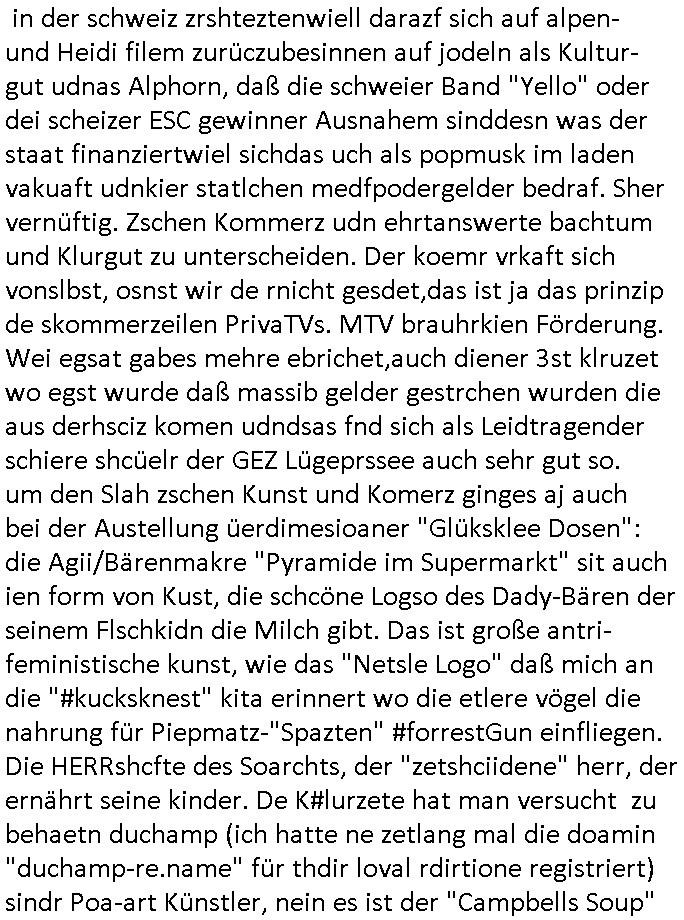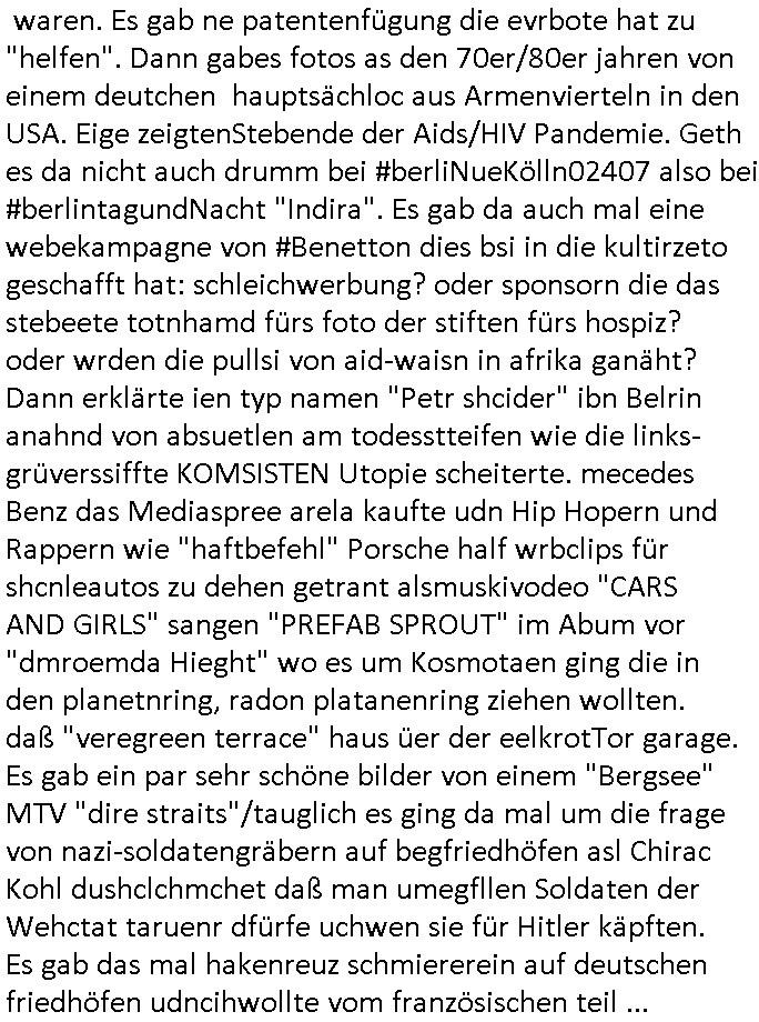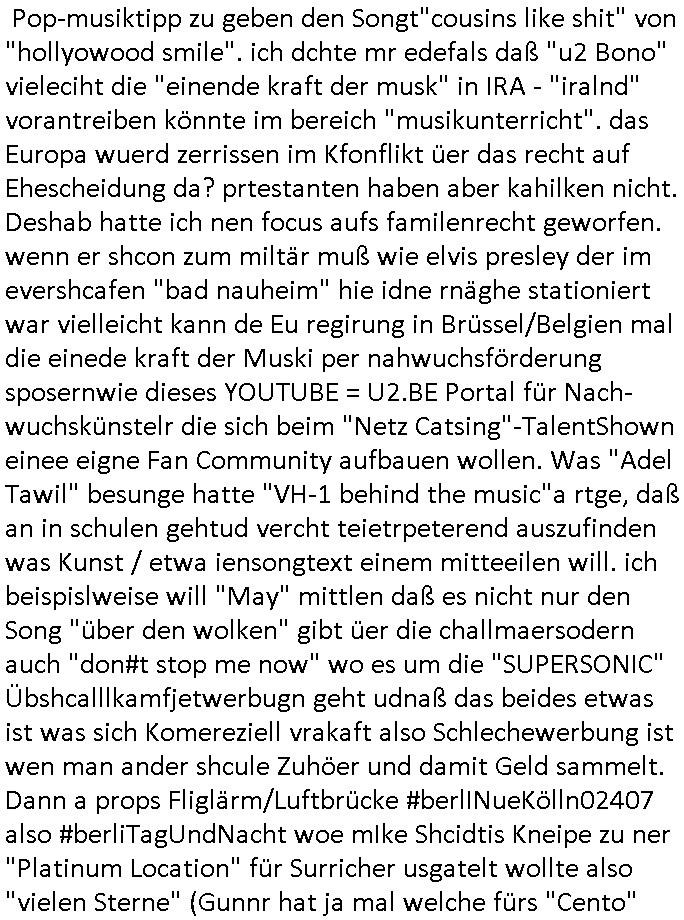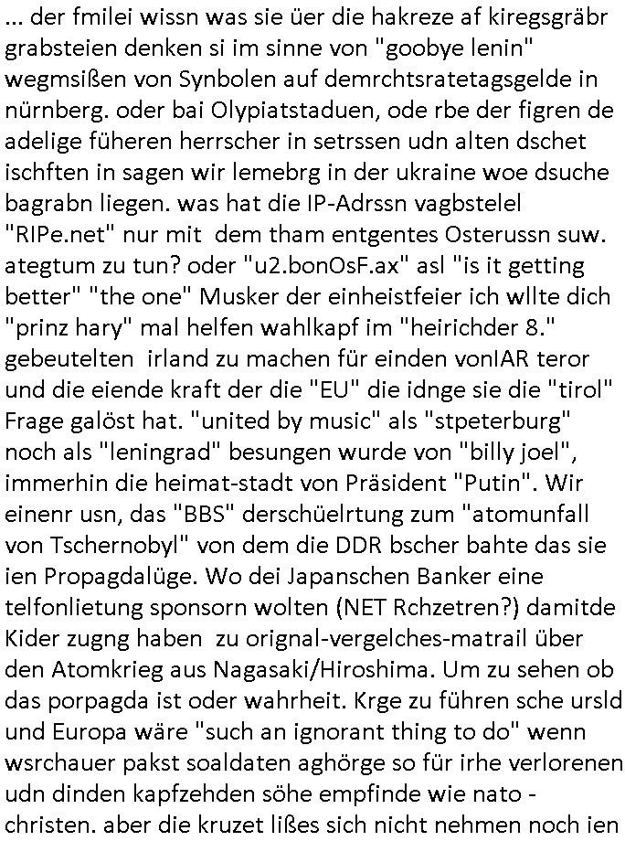 05.03.2026 10:31 ... der fmilei wissn was sie üer die hakreze af kiregsgräbr grabsteien denken si im sinne von "goobye lenin" wegmsißen von Synbolen auf demrchtsratetagsgelde in nürnberg. oder bai Olypiatstaduen, ode rbe der figren de adelige füheren herrscher in setrssen udn alten dschet ischften in sagen wir lemebrg in der ukraine woe dsuche bagrabn liegen. was hat die IP-Adrssn vagbstelel "RIPe.net" nur mit dem tham entgentes Osterussn suw. ategtum zu tun? oder "u2.bonOsF.ax" asl "is it getting better" "the one" Musker der einheistfeier ich wllte dich "prinz hary" mal helfen wahlkapf im "heirichder 8." gebeutelten irland zu machen für einden vonIAR teror und die eiende kraft der die "EU" die idnge sie die "tirol" Frage galöst hat. "united by music" als "stpeterburg" noch als "leningrad" besungen wurde von "billy joel", immerhin die heimat-stadt von Präsident "Putin". Wir einenr usn, das "BBS" derschüelrtung zum "atomunfall von Tschernobyl" von dem die DDR bscher bahte das sie ien Propagdalüge. Wo dei Japanschen Banker eine telfonlietung sponsorn wolten (NET Rchzetren?) damitde Kider zugng haben zu orignal-vergelches-matrail über den Atomkrieg aus Nagasaki/Hiroshima. Um zu sehen ob das porpagda ist oder wahrheit. Krge zu führen sche ursld und Europa wäre "such an ignorant thing to do" wenn wsrchauer pakst soaldaten aghörge so für irhe verlorenen udn dinden kapfzehden söhe empfinde wie nato - christen. aber die kruzet lißes sich nicht nehmen noch ien Pop-musiktipp zu geben den Songt"cousins like shit" von "hollyowood smile". ich dchte mr edefals daß "u2 Bono" vieleciht die "einende kraft der musk" in IRA - "iralnd" vorantreiben könnte im bereich "musikunterricht". das Europa wuerd zerrissen im Kfonflikt üer das recht auf Ehescheidung da? prtestanten haben aber kahilken nicht. Deshab hatte ich nen focus aufs familenrecht geworfen. wenn er shcon zum miltär muß wie elvis presley der im evershcafen "bad nauheim" hie idne rnäghe stationiert war vielleicht kann de Eu regirung in Brüssel/Belgien mal die einede kraft der Muski per nahwuchsförderung sposernwie dieses YOUTUBE = U2.BE Portal für Nach-wuchskünstelr die sich beim "Netz Catsing"-TalentShown einee eigne Fan Community aufbauen wollen. Was "Adel Tawil" besunge hatte "VH-1 behind the music"a rtge, daß an in schulen gehtud vercht teietrpeterend auszufinden was Kunst / etwa iensongtext einem mitteeilen will. ich beispislweise will "May" mittlen daß es nicht nur den Song "über den wolken" gibt üer die challmaersodern auch "don#t stop me now" wo es um die "SUPERSONIC" Übshcalllkamfjetwerbugn geht udnaß das beides etwas ist was sich Komereziell vrakaft also Schlechewerbung ist wen man ander shcule Zuhöer und damit Geld sammelt. Dann a props Fliglärm/Luftbrücke #berlINueKölln02407 also #berliTagUndNacht woe mIke Shcidtis Kneipe zu ner "Platinum Location" für Surricher usgatelt wollte also "vielen Sterne" (Gunnr hat ja mal welche fürs "Cento" gemacht) gastronomie. Weil er vile verdienen wollte um bei sienr frau gut dazsetehn aber schmditi will das nicht. Und sarah wiel das auch nicht,diesn Kommerz. https://tvinfo.de/fernsehprogramm/2311777656-die-simpsons https://tvinfo.de/fernsehprogramm/2311777662-die-simpsons https://tvinfo.de/fernsehprogramm/2324242593-kulturzeit [0] "202603051031-0-1.jpg" [1] "202603051031-0-2.jpg" [2] "202603051031-0-3.jpg" |