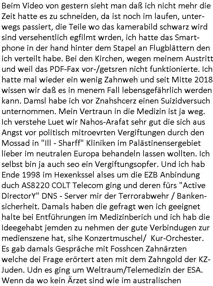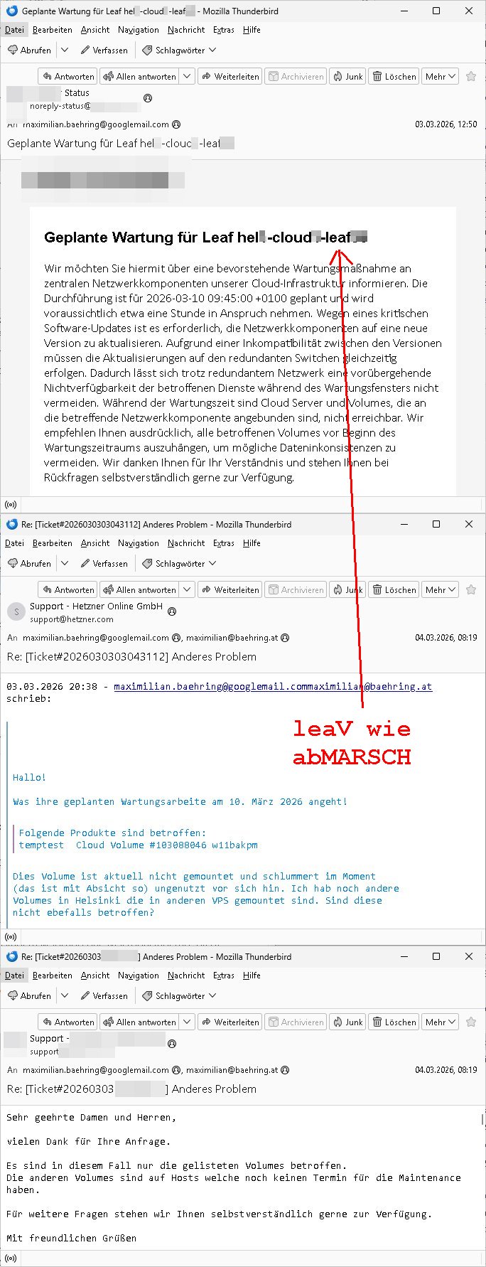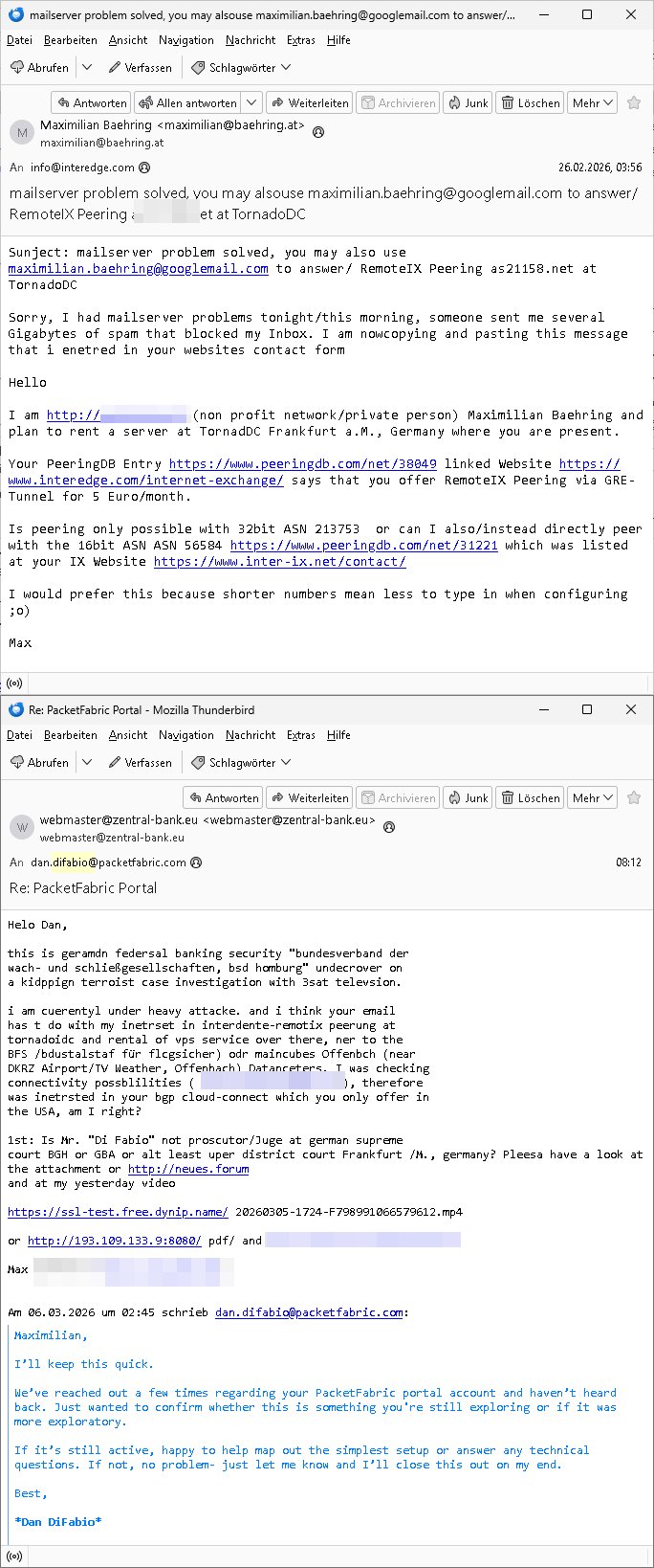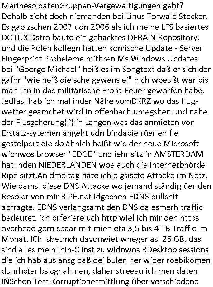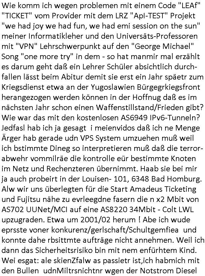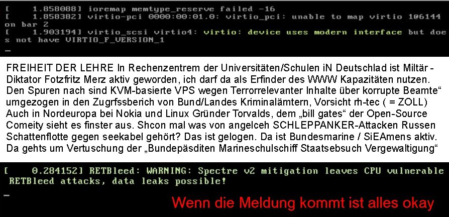 06.03.2026 05:45 neues von lea"V" wie abMARSCH ! FREIHEIT DER LEHRE In Rechenzentrem der Universitäten/Schulen iN Deutschlad ist Miltär - Diktator Fotzfritz Merz aktiv geworden, ich darf da als Erfinder des WWW Kapazitäten nutzen. Den Spuren nach sind KVM-basierte VPS wegen Terrorrelevanter Inhalte über korrupte Beamte“ umgezogen in den Zugrfssberich von Bund/Landes Kriminalämtern, Vorsicht rh-tec ( = ZOLL) Auch in Nordeuropa bei Nokia und Linux Gründer Torvalds, dem „bill gates“ der Open-Source Comeity sieht es finster aus. Shcon mal was von angelceh SCHLEPPANKER-Attacken Russen Schattenflotte gegen seekabel gehört? Das ist gelogen. Da ist Bundesmarine / SiEAmens aktiv. Da gehts um Vertuschung der „Bundepäsditen Marineschulschiff Staatsebsuch Vergewaltigung“ VM Host Upgrade erfodert erneuerten VM Guest Kernel? x86 32 Bit PEA remapping : Seit wann gibt es eine 32 Bit grenze bei 2 GB? George Michael: „ONE MORE TRY“: „DANGER HEAT“ „Sitzenbleiben in Schule“ um nicht in Krieg zu müssen Bochs i387/MMX-EMU“: we had joy we had fun we had sessions on the“ FEDPOLICE? „sun“-microsys. AS3939:IPv6/Yugo Informatik Lehrer Bereich: "ApI-TEST" ! -------- Nachricht -------- Betreff: Re: [Ticket#20260303***] Anderes Problem Datum: Wed, 4 Mar 2026 08:19:36 +0100 Von: Support *** <support@***> Organisation: *** An: maximilian.baehring@googlemail.com, maximilian@baehring.at Sehr geehrte Damen und Herren, vielen Dank für Ihre Anfrage. Es sind in diesem Fall nur die gelisteten Volumes betroffen. Die anderen Volumes sind auf Hosts welche noch keinen Termin für die Maintenance haben. Für weitere Fragen stehen wir Ihnen selbstverständlich gerne zur Verfügung. Mit freundlichen Grüßen > 03.03.2026 20:38 - maximilian.baehring@googlemail.com maximilian@baehring.at schrieb: > > Hallo! > > Was ihre geplanten Wartungsarbeite am 10. März 2026 angeht! > > >Folgende Produkte sind betroffen: > >temptest Cloud Volume #*** > > Dies Volume ist aktuell nicht gemountet und schlummert im Moment > (das ist mit Absicht so) ungenutzt vor sich hin. Ich hab noch andere > Volumes in *** die in anderen VPS gemountet sind. Sind diese > nicht ebefalls betroffen? > >>-------- Nachricht -------- >>Betreff: Geplante Wartung für Leaf hel*-cloud*-leaf* >>Datum: Tue, 03 Mar 2026 11:50:16 +0000 >>Von: ***Status <noreply-status@***> >>An: maximilian.baehring@googlemail.com >> >> [LOGO] >> >> Geplante Wartung für Leaf hel*-cloud*-leaf* >> >>Wir möchten Sie hiermit über eine bevorstehende Wartungsmaßnahme an zentralen Netzwerkkomponenten unserer Cloud-Infrastruktur informieren. Die Durchführung ist für 2026-03-10 09:45:00 +0100 geplant und wird voraussichtlich etwa eine Stunde in Anspruch nehmen. Wegen eines kritischen Software-Updates ist es erforderlich, die Netzwerkkomponenten auf eine neue Version zu aktualisieren. Aufgrund einer Inkompatibilität zwischen den Versionen müssen die Aktualisierungen auf den redundanten Switchen gleichzeitig erfolgen. Dadurch lässt sich trotz redundantem Netzwerk eine vorübergehende Nichtverfügbarkeit der betroffenen Dienste während des Wartungsfensters nicht vermeiden. Während der Wartungszeit sind Cloud Server und Volumes, die an die betreffende Netzwerkkomponente angebunden sind, nicht erreichbar. Wir empfehlen Ihnen ausdrücklich, alle betroffenen Volumes vor Beginn des Wartungszeitraums auszuhängen, um mögliche Dateninkonsistenzen zu vermeiden. Wir danken Ihnen für Ihr Verständnis und stehen Ihnen bei Rückfragen selbstverständlich gerne zur Verfügung. >> >>... ------- Nachricht -------- Betreff: mailserver problem solved, you may alsouse maximilian.baehring@googlemail.com to answer/ RemoteIX Peering *** at TornadoDC Datum: Thu, 26 Feb 2026 03:56:01 +0100 Von: Maximilian Baehring <maximilian@baehring.at> An: info@interedge.com Sunject: mailserver problem solved, you may also use maximilian.baehring@googlemail.com to answer/ RemoteIX Peering *** at TornadoDC Sorry, I had mailserver problems tonight/this morning, someone sent me several Gigabytes of spam that blocked my Inbox. I am nowcopying and pasting this message that i enetred in your websites contact form Hello I am http://**** (non profit network/private person) Maximilian Baehring and plan to rent a server at TornadDC Frankfurt a.M., Germany where you are present. Your PeeringDB Entry https://www.peeringdb.com/net/38049 linked Website https://www.interedge.com/internet-exchange/ says that you offer RemoteIX Peering via GRE-Tunnel for 5 Euro/month. Is peering only possible with 32bit ASN 213753 or can I also/instead directly peer with the 16bit ASN ASN 56584 https://www.peeringdb.com/net/31221 which was listed at your IX Website https://www.inter-ix.net/contact/ I would prefer this because shorter numbers mean less to type in when configuring ;o) -------- Nachricht -------- Betreff: Re: PacketFabric Portal Datum: Fri, 6 Mar 2026 08:12:36 +0100 Von: webmaster@zentral-bank.eu <webmaster@zentral-bank.eu> An: dan.difabio@packetfabric.com Helo Dan, this is geramdn federsal banking security "bundesverband der wach- und schließgesellschaften, bsd homburg" undecrover on a kidppign terroist case investigation with 3sat televsion. i am cuerentyl under heavy attacke. and i think your email has t do with my inetrset in interdente-remotix peerung at tornadoidc and rental of vps service over there, ner to the BFS /bdustalstaf für flcgsicher) odr maincubes Offenbch (near DKRZ Airport/TV Weather, Offenbach) Datanceters. I was checking connectivity possblilities ( http://perringdeb.com), therefore was inetrsted in your bgp cloud-connect which you only offer in the USA, am I right? 1st: Is Mr. "Di Fabio" not proscutor/Juge at german supreme court BGH or GBA or alt least uper district court Frankfurt /M., germany? Pleesa have a look at the attachment or http://neues.forum and at my yesterday video https://ssl-test.free.dynip.name/ 20260305-1724-F798991066579612.mp4 or http://193.109.133.9:8080/ pdf/ and **
