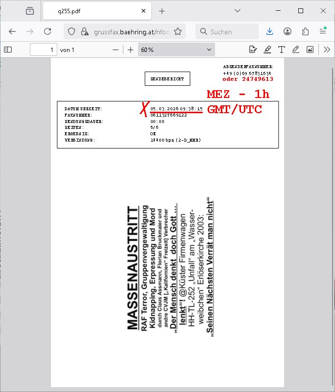 06.03.2026 04:31 Das PDF-Faxgateway beim Provider funktioniert aktuell nicht, meine eigne Lösung braucht drei Zustellversuche https://grussfax.baehring.at/ nfoq/q255.pdf (self signed SSL/Passwortgeschützt) [0] "202603060431-0-1.jpg" [1] "202603060431-0-2.jpg" |