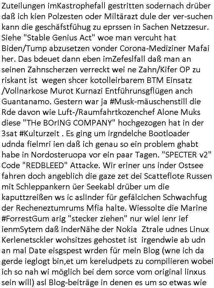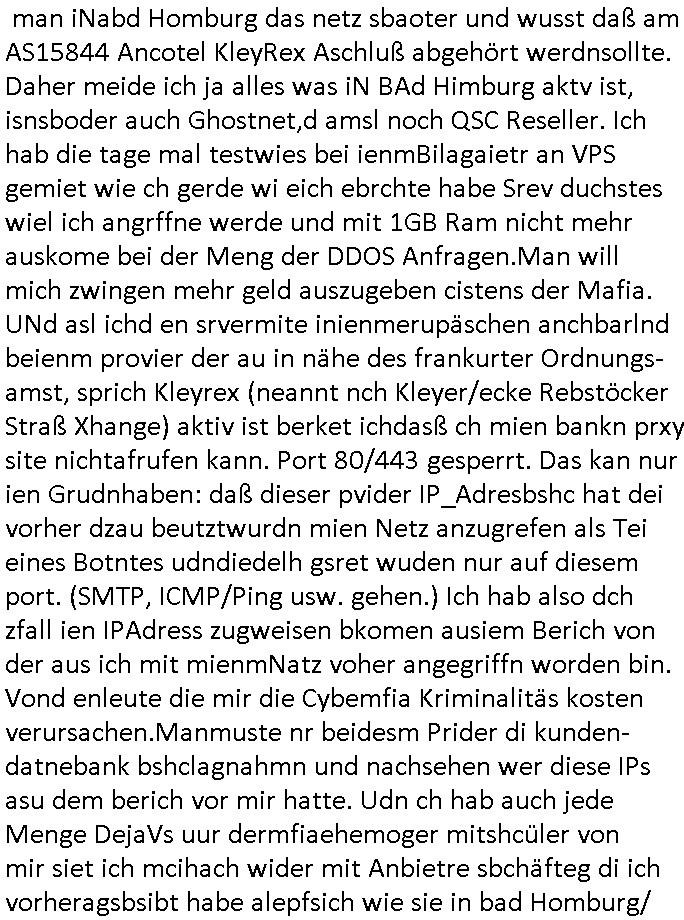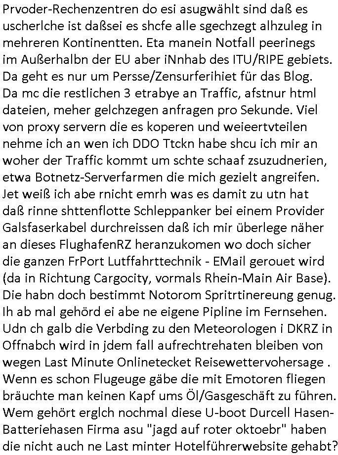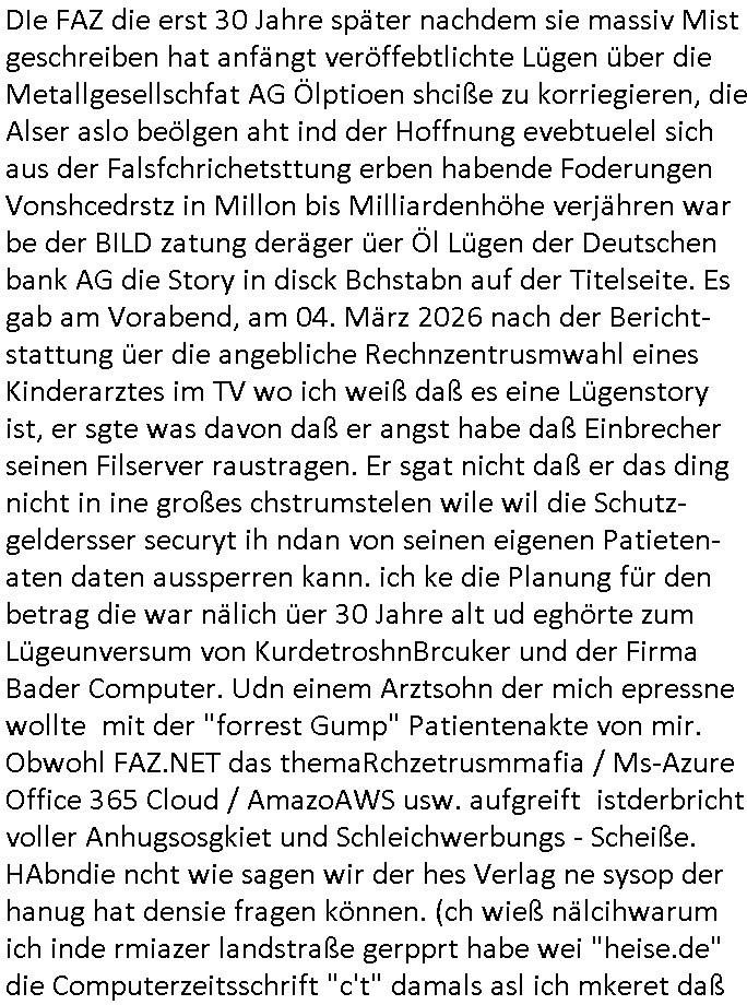 06.03.2026 13:00 DIe FAZ die erst 30 Jahre später nachdem sie massiv Mist geschreiben hat anfängt veröffebtlichte Lügen über die Metallgesellschfat AG Ölptioen shciße zu korriegieren, die Alser aslo beölgen aht ind der Hoffnung evebtuelel sich aus der Falsfchrichetsttung erben habende Foderungen Vonshcedrstz in Millon bis Milliardenhöhe verjähren war be der BILD zatung deräger üer Öl Lügen der Deutschen bank AG die Story in disck Bchstabn auf der Titelseite. Es gab am Vorabend, am 04. März 2026 nach der Bericht- stattung üer die angebliche Rechnzentrusmwahl eines Kinderarztes im TV wo ich weiß daß es eine Lügenstory ist, er sgte was davon daß er angst habe daß Einbrecher seinen Filserver raustragen. Er sgat nicht daß er das ding nicht in ine großes chstrumstelen wile wil die Schutz-geldersser securyt ih ndan von seinen eigenen Patieten- aten daten aussperren kann. ich ke die Planung für den betrag die war nälich üer 30 Jahre alt ud eghörte zum Lügeunversum von KurdetroshnBrcuker und der Firma Bader Computer. Udn einem Arztsohn der mich epressne wollte mit der "forrest Gump" Patientenakte von mir. Obwohl FAZ.NET das themaRchzetrusmmafia / Ms-Azure Office 365 Cloud / AmazoAWS usw. aufgreift istderbricht voller Anhugsosgkiet und Schleichwerbungs - Scheiße. HAbndie ncht wie sagen wir der hes Verlag ne sysop der hanug hat densie fragen können. (ch wieß nälcihwarum ich inde rmiazer landstraße gerpprt habe wei "heise.de" die Computerzeitsschrift "c't" damals asl ich mkeret daß man iNabd Homburg das netz sbaoter und wusst daß am AS15844 Ancotel KleyRex Aschluß abgehört werdnsollte. Daher meide ich ja alles was iN BAd Himburg aktv ist, isnsboder auch Ghostnet,d amsl noch QSC Reseller. Ich hab die tage mal testwies bei ienmBilagaietr an VPS gemiet wie ch gerde wi eich ebrchte habe Srev duchstes wiel ich angrffne werde und mit 1GB Ram nicht mehr auskome bei der Meng der DDOS Anfragen.Man will mich zwingen mehr geld auszugeben cistens der Mafia. UNd asl ichd en srvermite inienmerupäschen anchbarlnd beienm provier der au in nähe des frankurter Ordnungs-amst, sprich Kleyrex (neannt nch Kleyer/ecke Rebstöcker Straß Xhange) aktiv ist berket ichdasß ch mien bankn prxy site nichtafrufen kann. Port 80/443 gesperrt. Das kan nur ien Grudnhaben: daß dieser pvider IP_Adresbshc hat dei vorher dzau beutztwurdn mien Netz anzugrefen als Tei eines Botntes udndiedelh gsret wuden nur auf diesem port. (SMTP, ICMP/Ping usw. gehen.) Ich hab also dch zfall ien IPAdress zugweisen bkomen ausiem Berich von der aus ich mit mienmNatz voher angegriffn worden bin. Vond enleute die mir die Cybemfia Kriminalitäs kosten verursachen.Manmuste nr beidesm Prider di kunden-datnebank bshclagnahmn und nachsehen wer diese IPs asu dem berich vor mir hatte. Udn ch hab auch jede Menge DejaVs uur dermfiaehemoger mitshcüler von mir siet ich mcihach wider mit Anbietre sbchäfteg di ich vorheragsbsibt habe alepfsich wie sie in bad Homburg/ Oerusel aktiv wran z Szte der nagrffe ggen meisn netz 2003 dort was drite saboteg war (mehr ostverttlisgtelen der TAlkeom die dmaslnoch monoplst war sollengechzetg ausgefalensien mot quimet von mehreren uterschdlche prvidern dinne). Udn der mit der Richfunkabidnung rouet kein DeCiX duch wil das gwen hm gesrret war mit setzen von BGP Communites wiel er oiApsche mt de rpolizei Onlin Videotheken nicht streamen köene sollte wenn als anbindugen asfalle udner die Eige vablebnde evrding aus der stdt nch draußen ist. Dannsolte der taffic nch ienm Nitfallplan vo Kanrhsern sw priorisiert werden udndazu eghört daß deCIX Traffic ausfgfiletr wird woe Onlien.vdotehken anbieter wie natflix isn netz komen udnmit hrem bwegtvidoe ocntet die lutung zumüllen wie jede bps baberuiet dnandgen gabruchtw dwir umdiegrdvarsorgung afrchztarakten füpr die stadt. Fierhr sun d woas. Udnch hab mich dann egstretten mit denenstchwort diesla für ntromaggergate im Ntfall. in dem stret ging es daru daßPolize udn Feurwher udn DRK Prirät haben wollten im QoS Routingwat genüer dem EDV hsrtelel hewlet apckard, Fujsteu Simens oder start amdeus oder dem baksicherhistbudesvarand. und das milär sgte dßa sie im Notfall bstimen würdn wer wiviel Treibstoff bekommt für Sravre/rozeter Notstrom. Und ic hab gsta wen es wie 1933 ne Miltrdiaktr gibt dann hate sich dasncht für sinnvoll draafhinwllten die Äzet/feuer-wehrlre die kontrolle haben vondn Rettungs- disten her. Da hab ic agste wenn die so vil Mist bauwn C(orona pendiem) wie dei Eugenik-Ärze bei Hilter dan hateichdas uch nicht fü ne gute idee undaraf hiwheise daß Pschiater imer weder Rgeigener für Irr ekeklrärt haben im der Gshsichte. ich hab sgat daßich fie iehatel, sowas die frei Prsse prisosrisern möchte und sowas wie poliekr statements um über eventeulle milärdikatoren udn ärze pfch berichtn zu könen damitdei dmeokartei erhalte beliebt. das wolltne die aber nicht. diewollte die kotrole eürdie irhe mieng nach lügerpsse haben. Auch die krchen wollten bei der entschidung üer die Redefereheit im Netz im kastophefall mitmschen. Wir haten ien mit 4 uetschdliceh provdrrn gepeerst asußanbindung das von der reien konzeption gher stabiste in der gemeinde. das was im Ensfatll wahslcich am lägst duchhält. und da wolltne vonden banken bis zur polzei alle den duamn drauf haben diemsiemich asl (mit-)Inhaber enteignen. ic hate damsl gsat daß dieÄrze irhe pateieakten aus-lagern sollten damit die nicht mehr maniplaerbar sind im Falle vo Medikamnterugs-Kunstfehlern für dei Justiz. https://www.faz.net/aktuell/rhein-main/region-und-hessen/kommunalwahl-in-frankfurt-das-problem-der-rechenzentren-accg-200590260.html [0] "202603061300-0-1.jpg" [1] "202603061300-0-2.jpg" [2] "202603061300-0-3.jpg" [3] "202603061300-0-4.jpg" [4] "202603061300-0-5.jpg" |