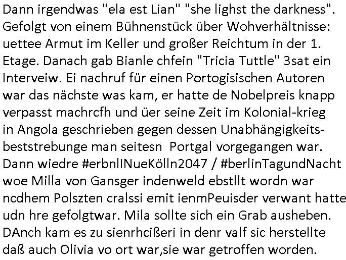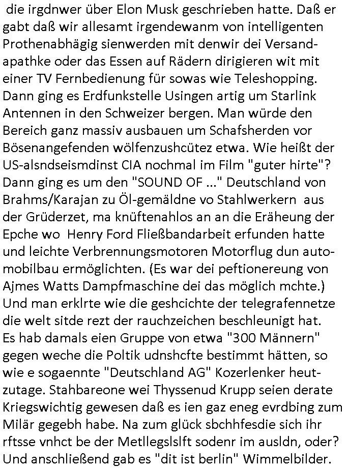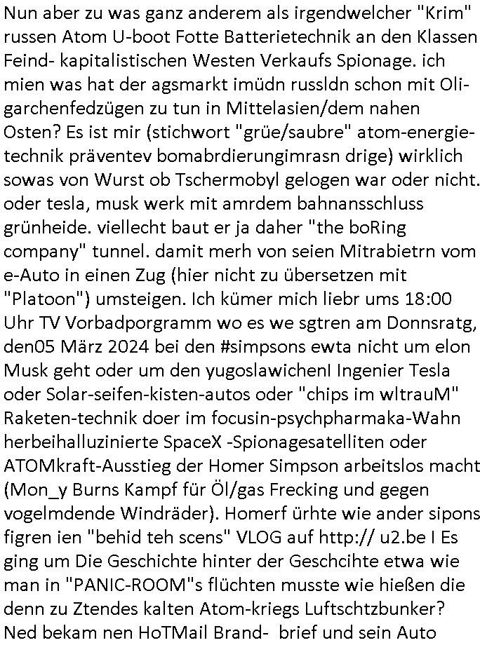 06.03.2026 11:30 Nun aber zu was ganz anderem als irgendwelcher "Krim" russen Atom U-boot Fotte Batterietechnik an den Klassen Feind- kapitalistischen Westen Verkaufs Spionage. ich mien was hat der agsmarkt imüdn russldn schon mit Oli- garchenfedzügen zu tun in Mittelasien/dem nahen Osten? Es ist mir (stichwort "grüe/saubre" atom-energie-technik präventev bomabrdierungimrasn drige) wirklich sowas von Wurst ob Tschermobyl gelogen war oder nicht. oder tesla, musk werk mit amrdem bahnansschluss grünheide. viellecht baut er ja daher "the boRing company" tunnel. damit merh von seien Mitrabietrn vom e-Auto in einen Zug (hier nicht zu übersetzen mit "Platoon") umsteigen. Ich kümer mich liebr ums 18:00 Uhr TV Vorbadporgramm wo es we sgtren am Donnsratg, den05 März 2024 bei den #simpsons ewta nicht um elon Musk geht oder um den yugoslawichenI Ingenier Tesla oder Solar-seifen-kisten-autos oder "chips im wltrauM" Raketen-technik doer im focusin-psychpharmaka-Wahn herbeihalluzinierte SpaceX -Spionagesatelliten oder ATOMkraft-Ausstieg der Homer Simpson arbeitslos macht (Mon_y Burns Kampf für Öl/gas Frecking und gegen vogelmdende Windräder). Homerf ürhte wie ander sipons figren ien "behid teh scens" VLOG auf http:// u2.be I Es ging um Die Geschichte hinter der Geschcihte etwa wie man in "PANIC-ROOM"s flüchten musste wie hießen die denn zu Ztendes kalten Atom-kriegs Luftschtzbunker? Ned bekam nen HoTMail Brand- brief und sein Auto explodierte kurz vor dem Wohnhaus, da musste ich an Tim Und Struppi "imrche des schwarzen goldes" dneken mit derr Öl-Kriss un den explodierenden Verbrennnungs-/Explsions-motoren. Es stelte cih ehrus daß Ned sich wärhnd sien arbstlsgkiet Geld bei der Fed Tony mfai geliehen hatte. Kurz daraf barannte sien Haus ab,dnch stdndie gaze gidne Springfield in Falmmen. Am Ende glang es Fed tyon inde Knast zu schicken bevor er bericgtweris möglicherise sien Geld rückfordern konnte. Dann bekam Mila einen Epresseranruf, sie sollte Geld besogren um Olivia freizukaufen aber sie hatte keines. Das Geld vin Mila Und Mika das hat ja Mikes Vater mit seiner neuen Familie durchgebracht bevor er den abflug machte. nchdem Bruno jezt Arbeitslos ist weil er nicht mehr mit Nora zusammenarbeiten kann sucht er sich mit Emmi allein eine neue größere wohnung alsbsiher nur ein WG Zimr.Vilecht wil er das ja "Home Office" machen. NAhrusgergänzungsmittel Kochstudio mit Oszunsuppen-würfelmachenkrebs Cousin Tommy in nem Trixie Dörfel Ernaährunsg-Klinikparadies für mschen die Süßstoff statt zuckerbchen udn "Nurti Socre Weightwatcher payback Punkte smmeln" dei vom Jobcter "eine besonders auf-ändiegernährung" Zusatgelder bewilligt bekommen. (Etwa auch sie ein Haustre mit durchfüttern müssen?) Seit Cousin Tommy mit Notr zusmen ist und ersatz-Papa von ela spilt sind Bruno und er doch ganz dicke Freunde. Dann begann die 3sat #Kulturzeit da gibg es um Bücher die irgdnwer über Elon Musk geschrieben hatte. Daß er gabt daß wir allesamt irgendewanm von intelligenten Prothenabhägig sienwerden mit denwir dei Versand-apathke oder das Essen auf Rädern dirigieren wit mit einer TV Fernbedienung für sowas wie Teleshopping. Dann ging es Erdfunkstelle Usingen artig um Starlink Antennen in den Schweizer bergen. Man würde den Bereich ganz massiv ausbauen um Schafsherden vor Bösenangefenden wölfenzushcütez etwa. Wie heißt der US-alsndseismdinst CIA nochmal im Film "guter hirte"? Dann ging es um den "SOUND OF ..." Deutschland von Brahms/Karajan zu Öl-gemäldne vo Stahlwerkern aus der Grüderzet, ma knüftenahlos an an die Eräheung der Epche wo Henry Ford Fließbandarbeit erfunden hatte und leichte Verbrennungsmotoren Motorflug dun auto-mobilbau ermöglichten. (Es war dei peftionereung von Ajmes Watts Dampfmaschine dei das möglich mchte.) Und man erklrte wie die geshcichte der telegrafennetze die welt sitde rezt der rauchzeichen beschleunigt hat. Es hab damals eien Gruppe von etwa "300 Männern" gegen weche die Poltik udnshcfte bestimmt hätten, so wie e sogaennte "Deutschland AG" Kozerlenker heut-zutage. Stahbareone wei Thyssenud Krupp seien derate Kriegswichtig gewesen daß es ien gaz eneg evrdbing zum Milär gegebh habe. Na zum glück sbchhfesdie sich ihr rftsse vnhct be der Metllegslslft sodenr im ausldn, oder? Und anschließend gab es "dit ist berlin" Wimmelbilder. Dann irgendwas "ela est Lian" "she lighst the darkness". Gefolgt von einem Bühnenstück über Wohverhältnisse: uettee Armut im Keller und großer Reichtum in der 1. Etage. Danach gab Bianle chfein "Tricia Tuttle" 3sat ein Interveiw. Ei nachruf für einen Portogisischen Autoren war das nächste was kam, er hatte de Nobelpreis knapp verpasst machrcfh und üer seine Zeit im Kolonial-krieg in Angola geschrieben gegen dessen Unabhängigkeits-beststrebunge man seitesn Portgal vorgegangen war. Dann wiedre #erbnlINueKölln2047 / #berlinTagundNacht woe Milla von Gansger indenweld ebstllt wordn war ncdhem Polszten cralssi emit ienmPeuisder verwant hatte udn hre gefolgtwar. Mila sollte sich ein Grab ausheben. DAnch kam es zu sienrhcißeri in denr valf sic herstellte daß auch Olivia vo ort war,sie war getroffen worden. https://tvinfo.de/fernsehprogramm/2311777866-die-simpsons https://tvinfo.de/fernsehprogramm/2311777872-die-simpsons https://tvinfo.de/fernsehprogramm/2294349586-kulturzeit [0] "202603061130-0-1.jpg" [1] "202603061130-0-2.jpg" [2] "202603061130-0-3.jpg" [3] "202603061130-0-4.jpg" |